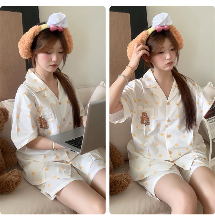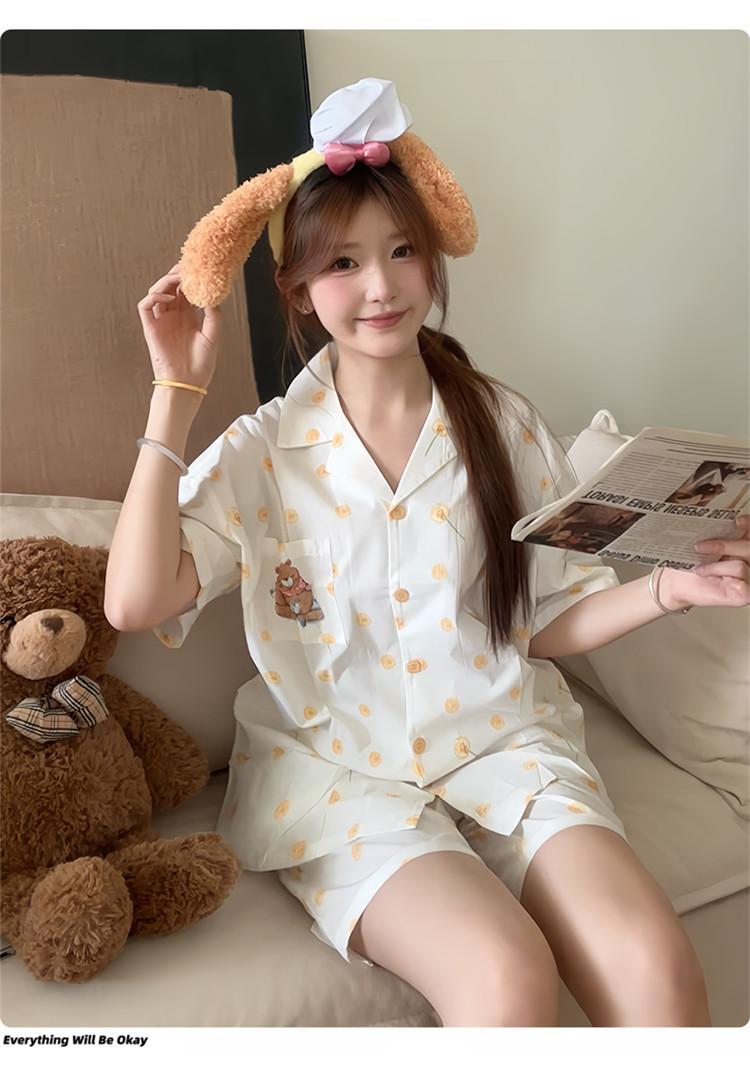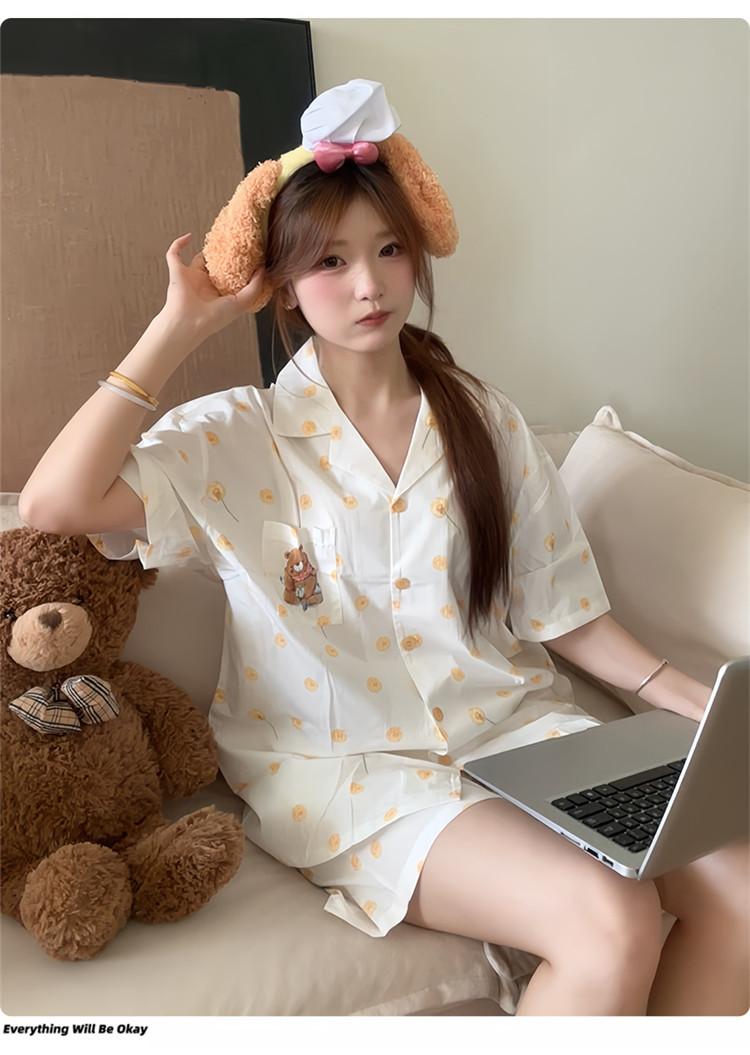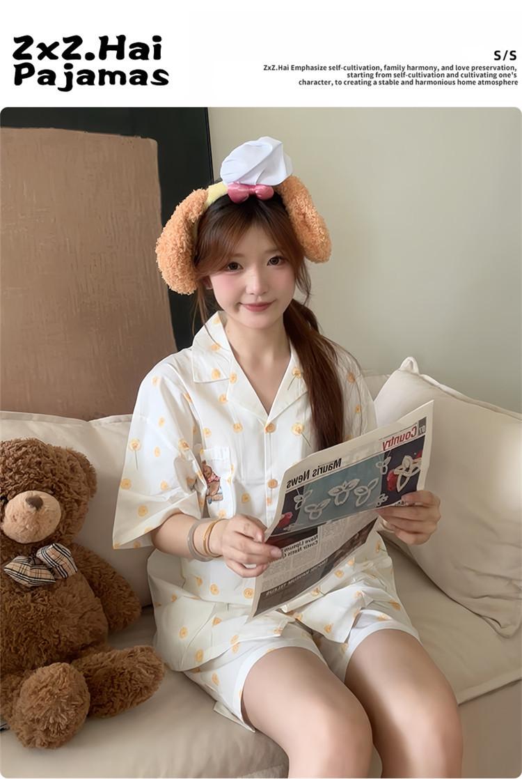 Pijama de dos piezas de manga corta con estampado de oso amarillo lavanda para primavera y verano, ropa de casa fresca y bonita para exteriores.