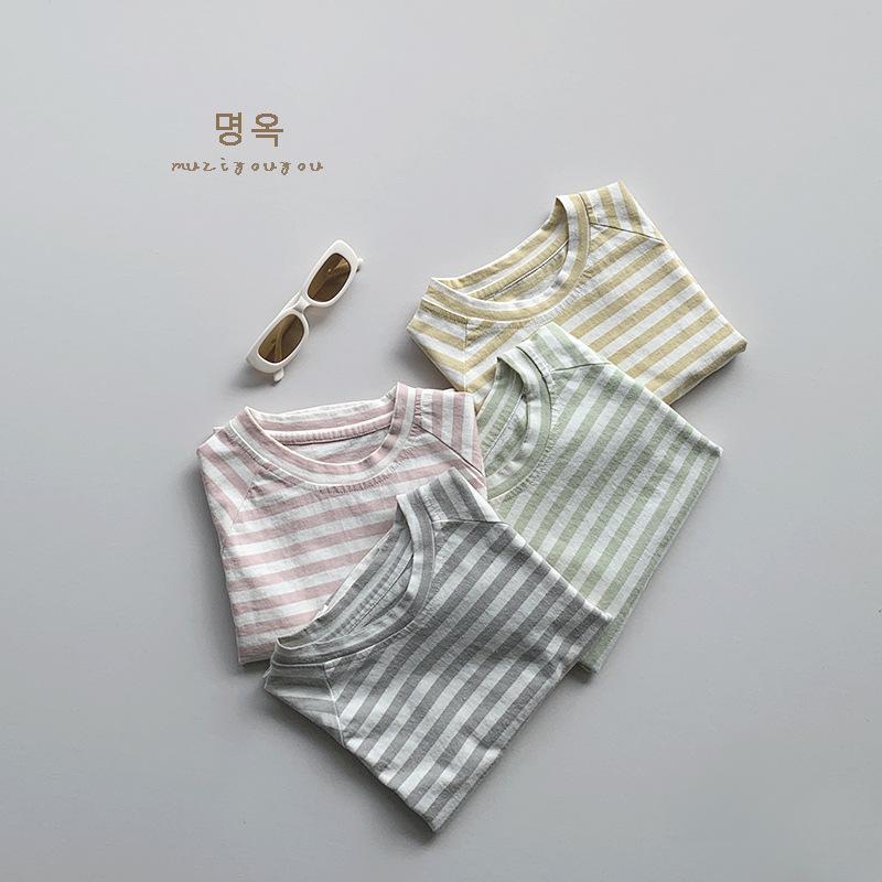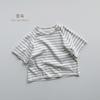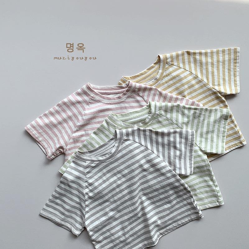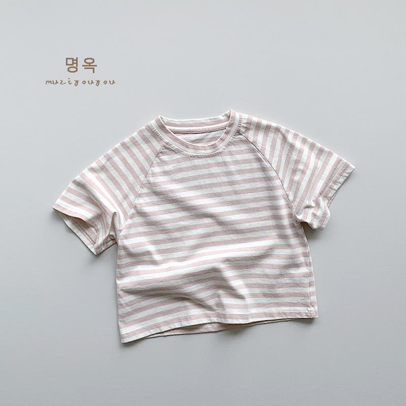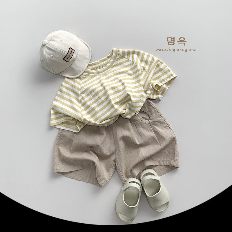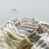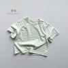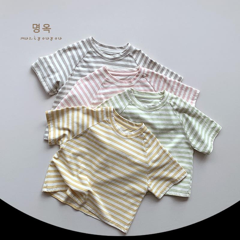 Camiseta de rayas de manga corta para niños color macarrón, nueva camiseta de verano para niños y niñas de algodón y lino, estilo coreano, top informal combinable.
