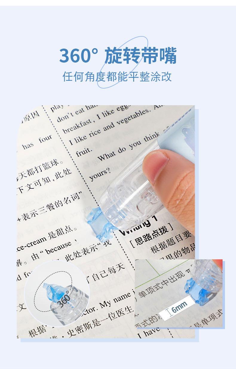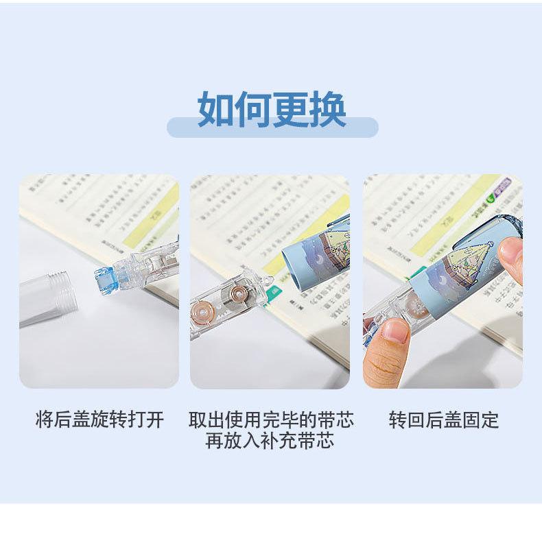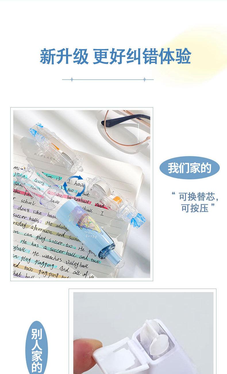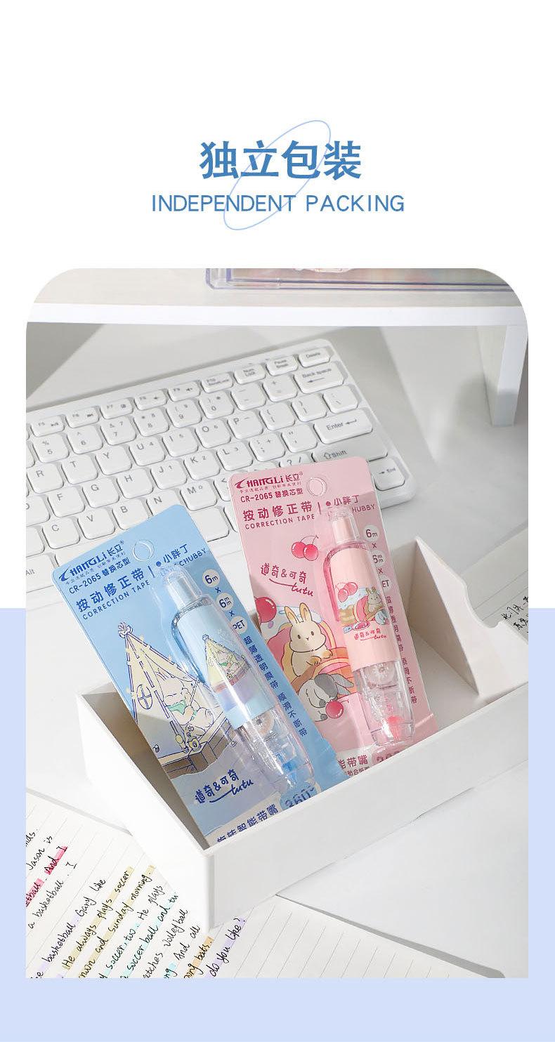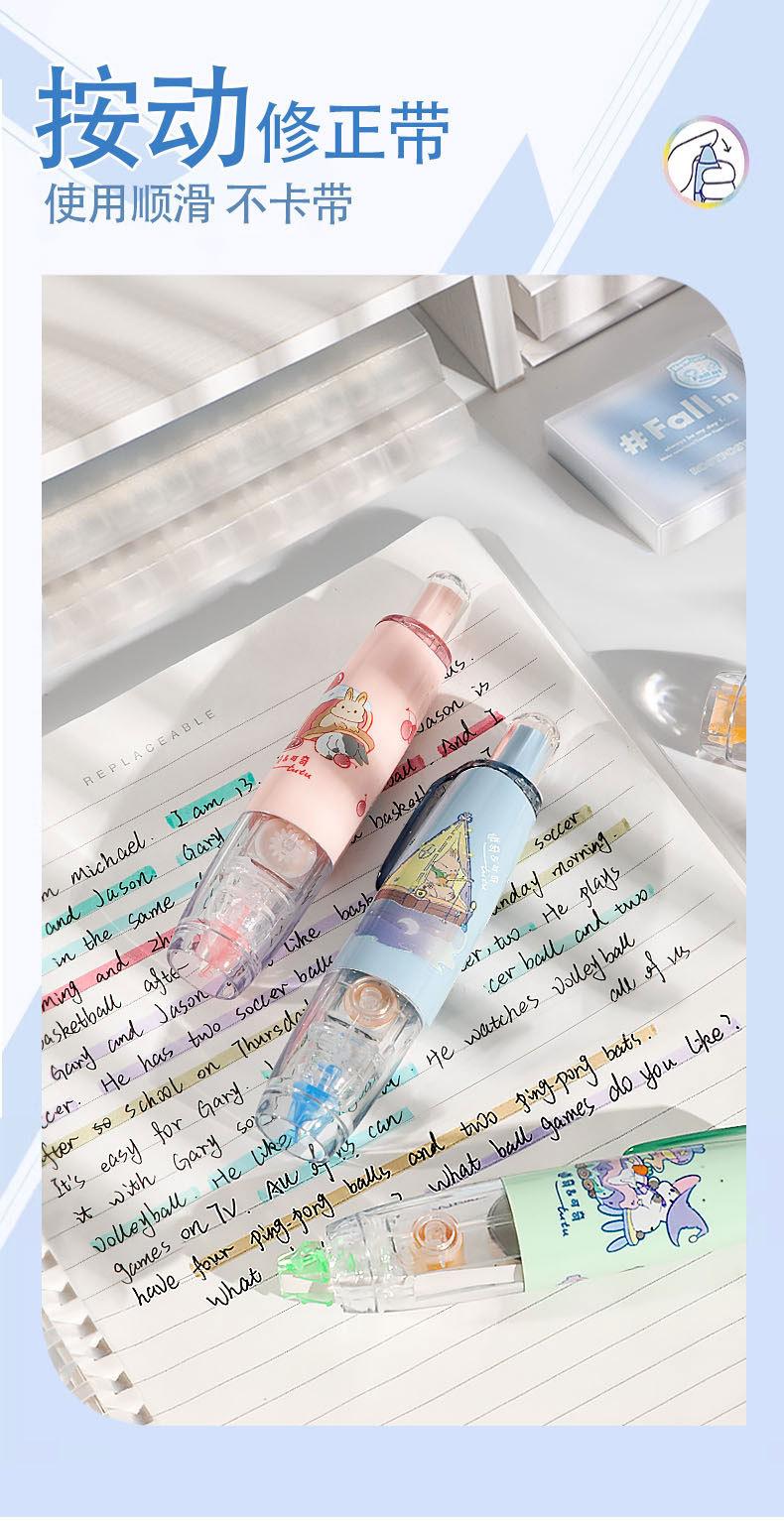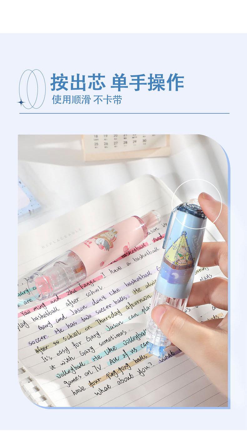 Cinta correctora para estudiantes. Cinta correctora de prensa. Chica guapa con linda cinta correctora. Útiles escolares para estudiantes de primaria.