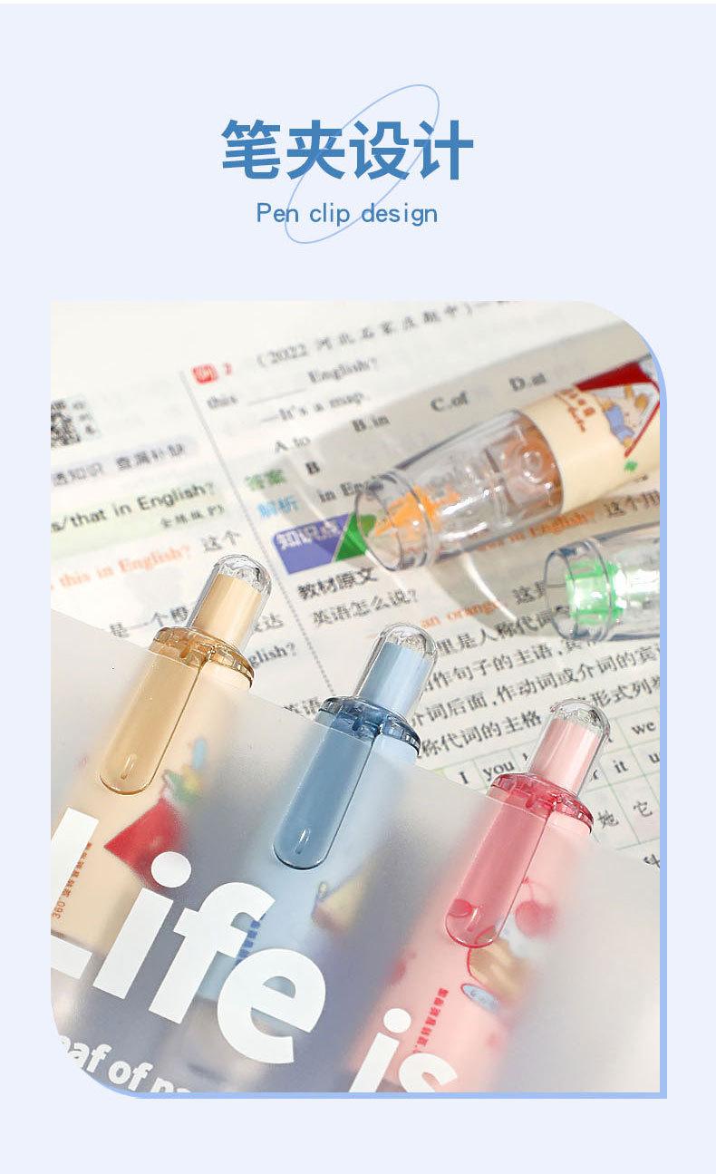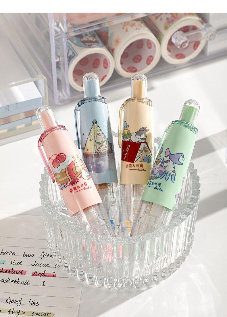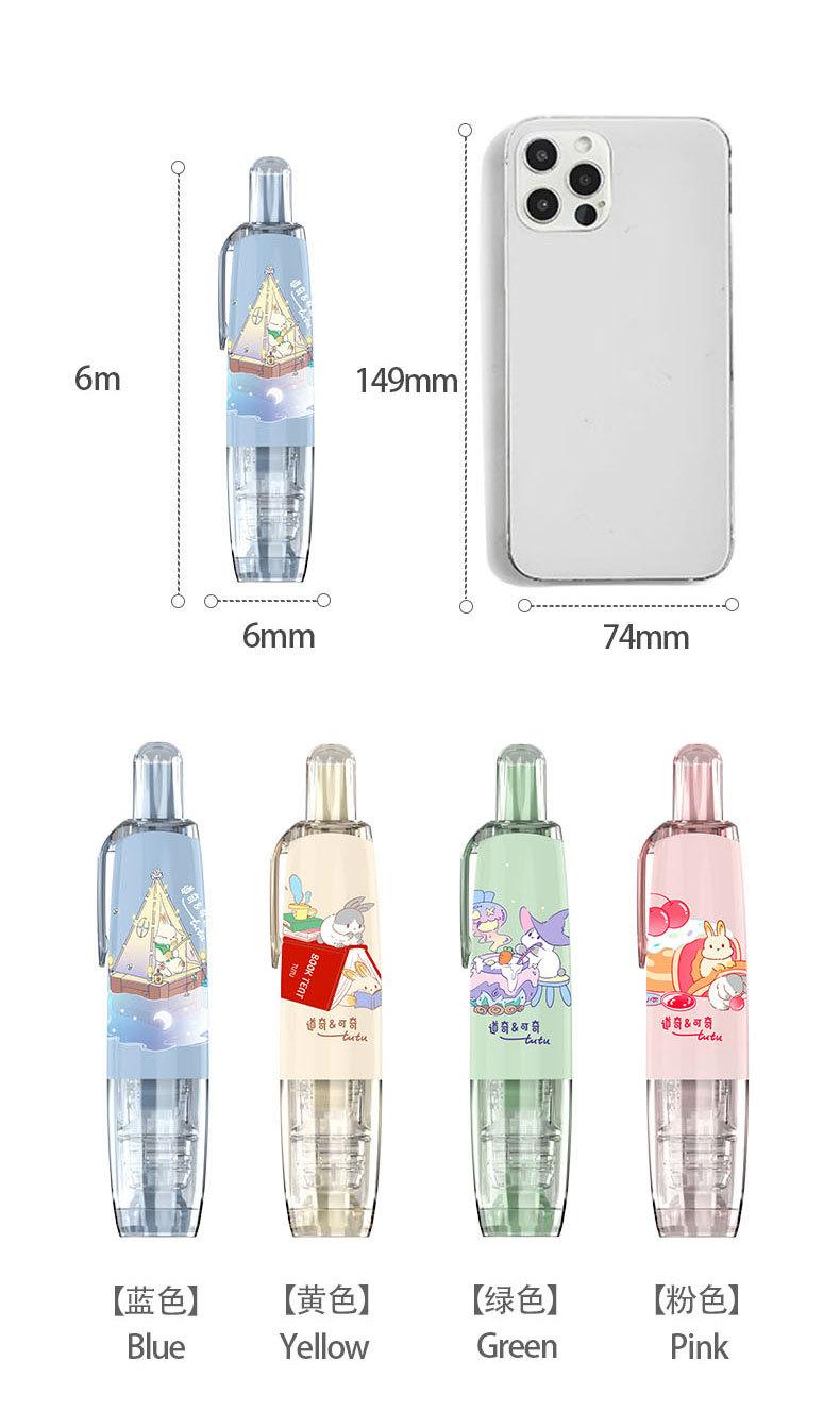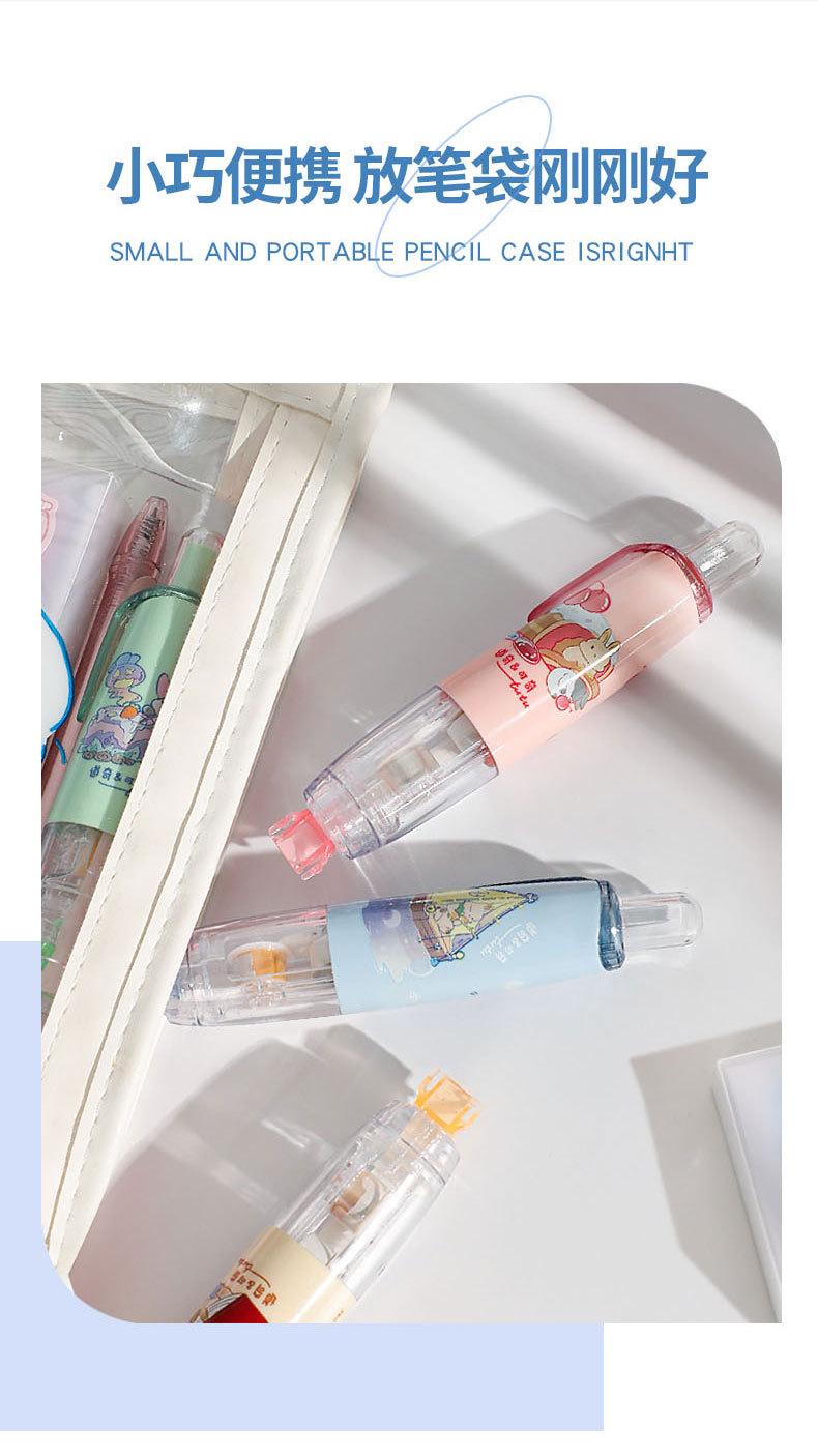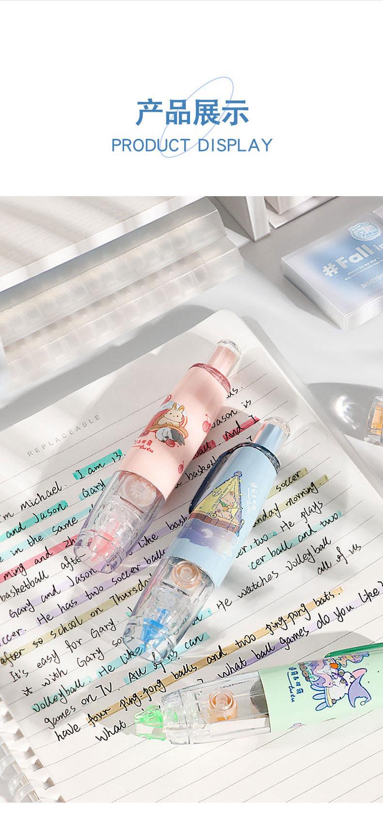 Cinta correctora para estudiantes. Cinta correctora de prensa. Chica guapa con linda cinta correctora. Útiles escolares para estudiantes de primaria.
