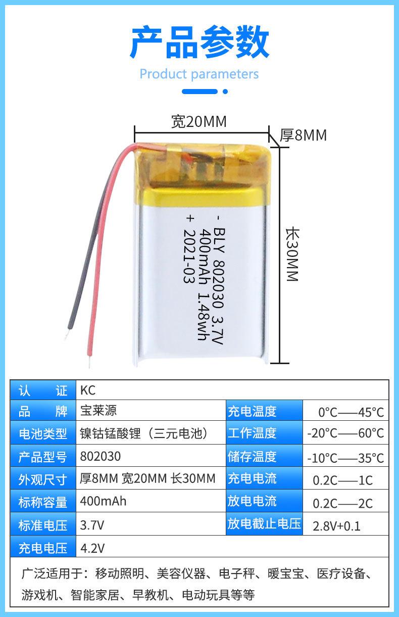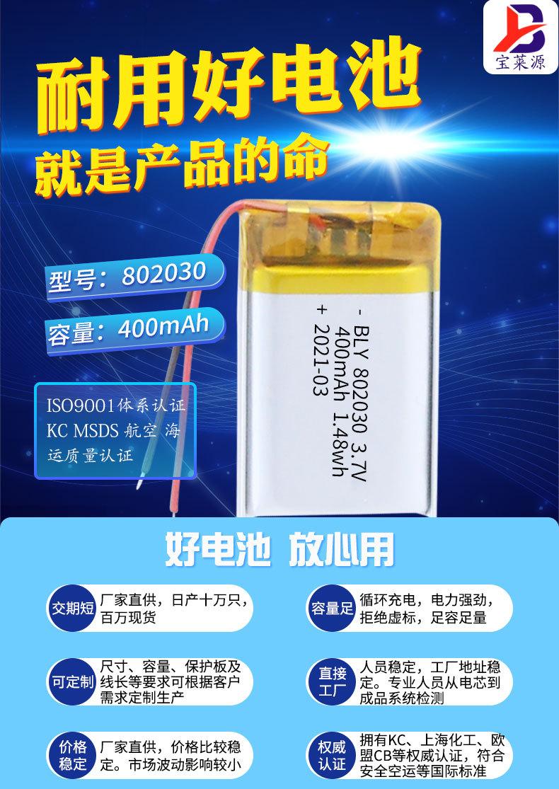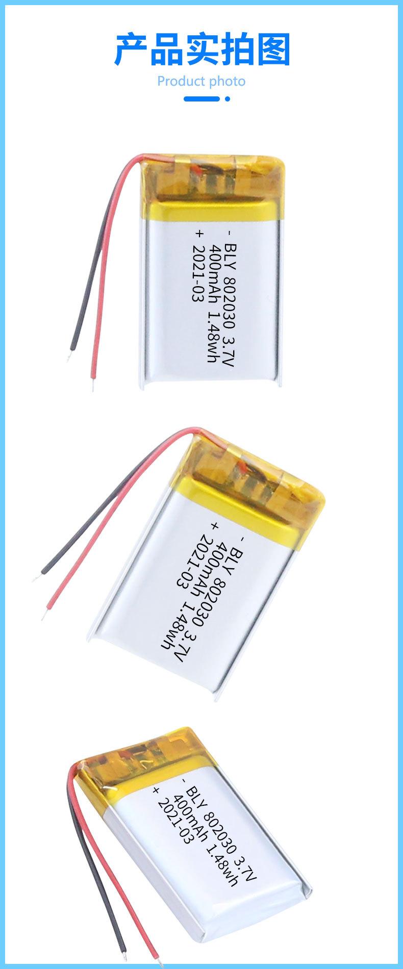 Batería de Polímero de Litio 802030 400mAh Fabricante Audífono Bluetooth Ventilador Pequeño Juguete Eléctrico Batería Ternaria de Litio