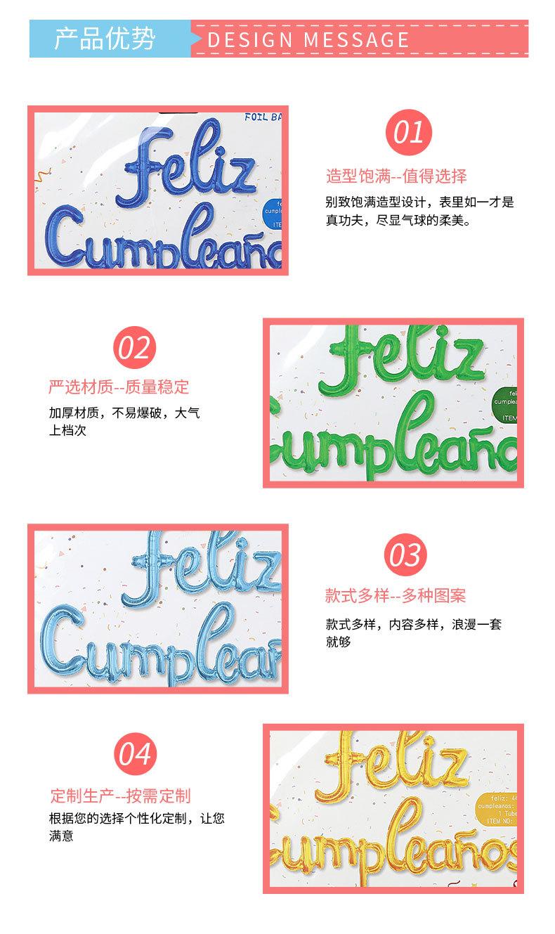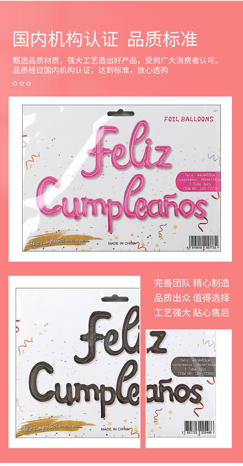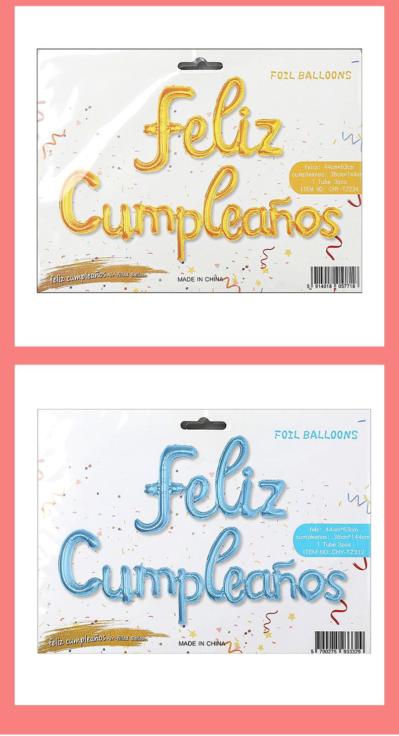 Traje de película de aluminio de feliz cumpleaños español unido al por mayor de fábrica, globo de feliz cumpleaños con embalaje