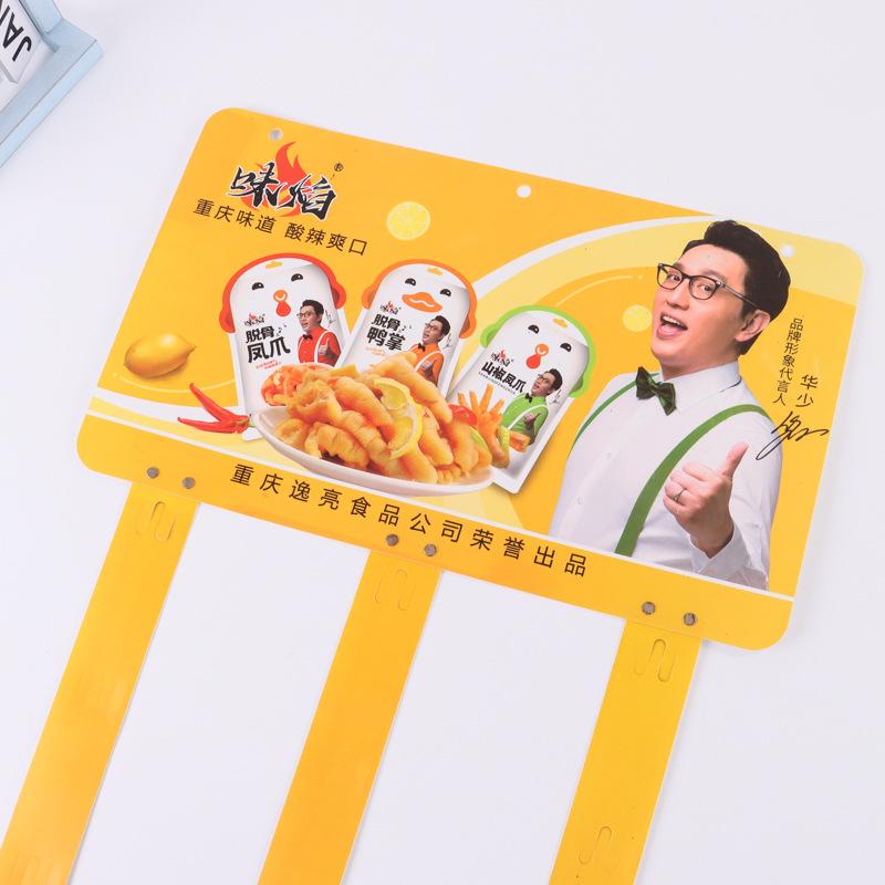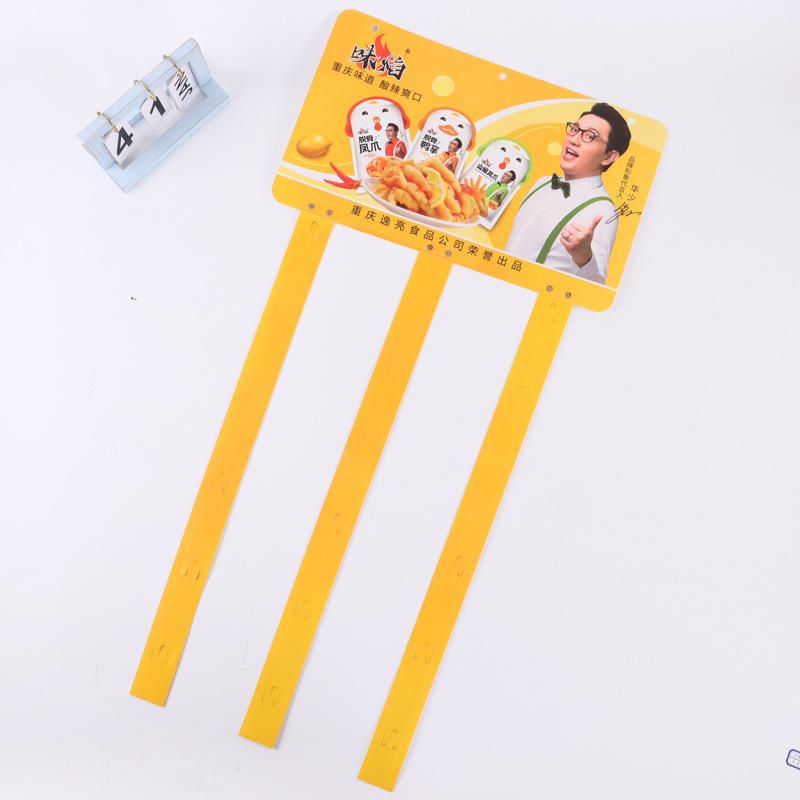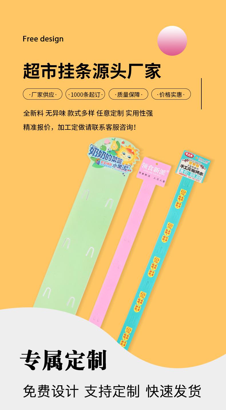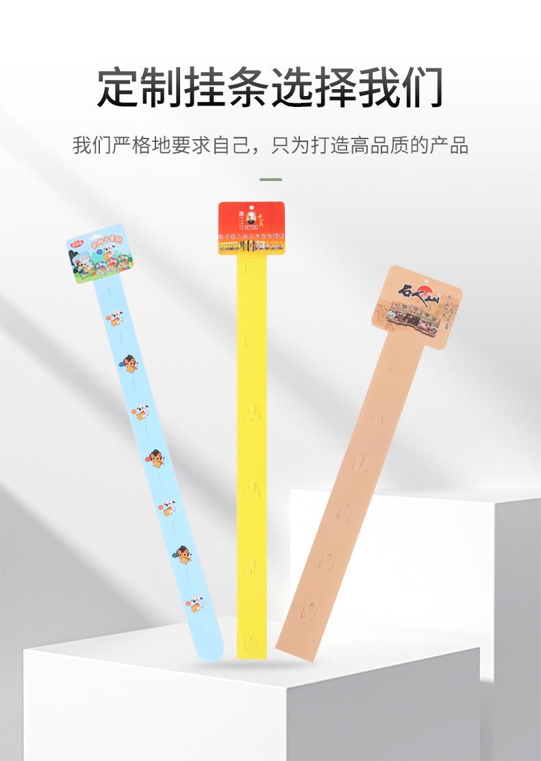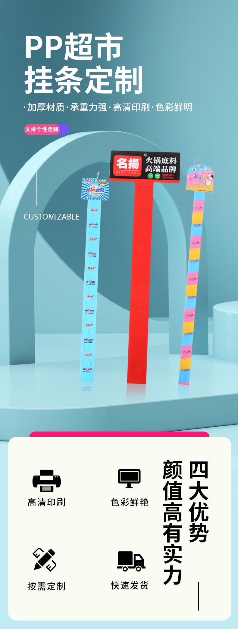 Tira colgante de polipropileno de color de fábrica, personalizada, para estante de supermercado, de plástico, de PVC, con impresión publicitaria personalizada, con tarjeta colgante y logotipo impreso.