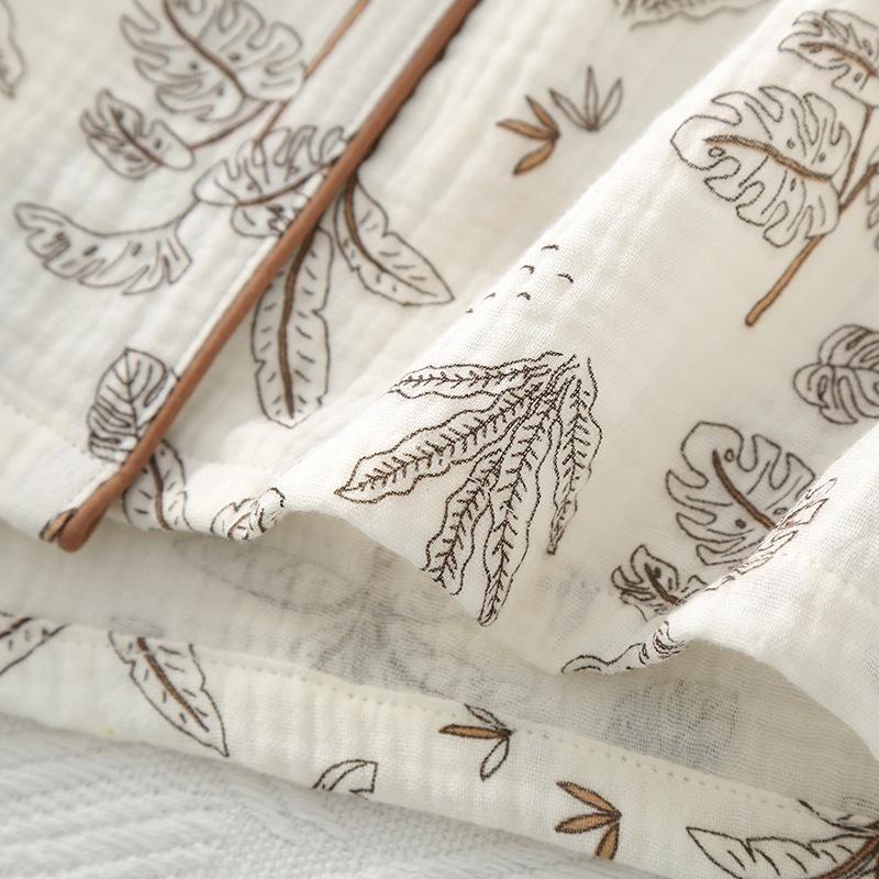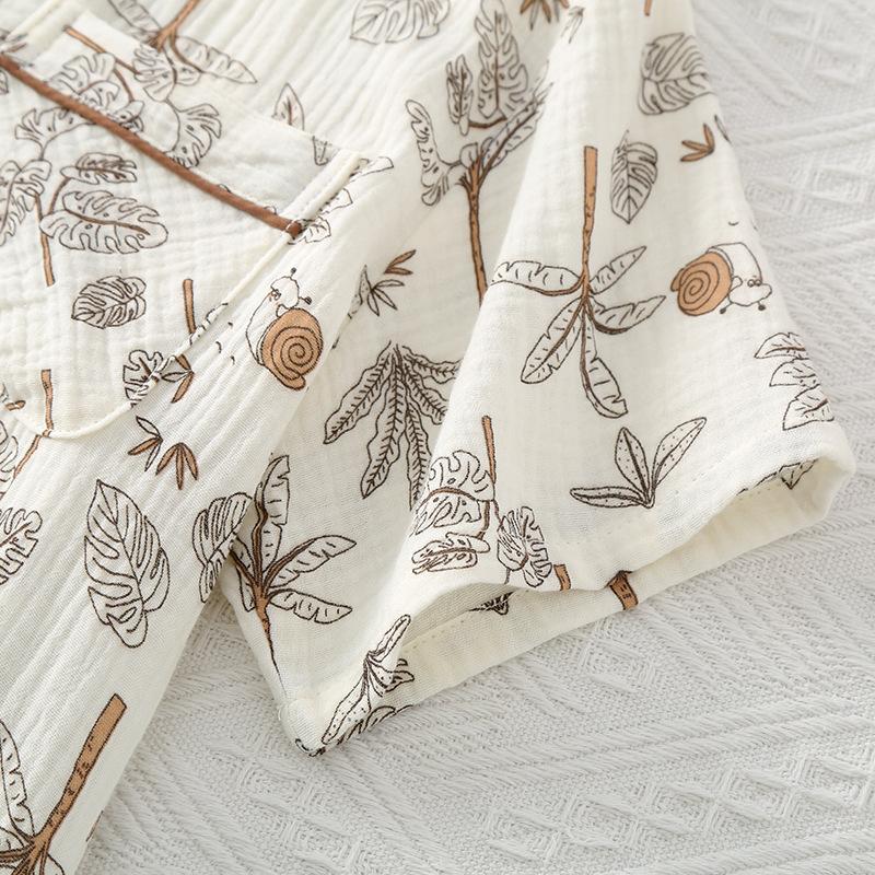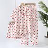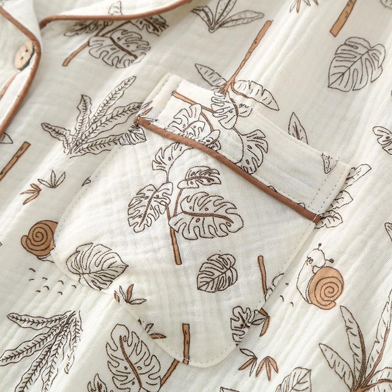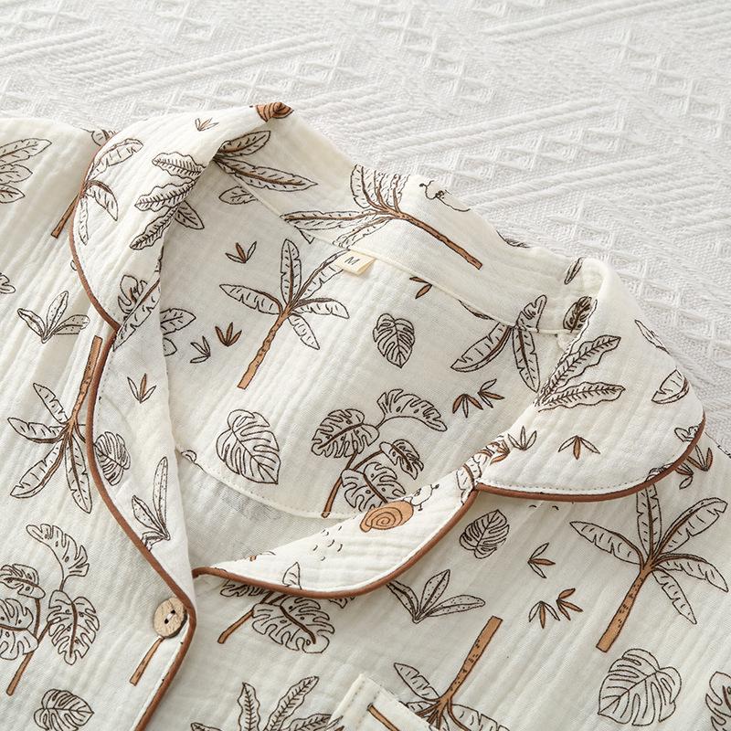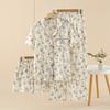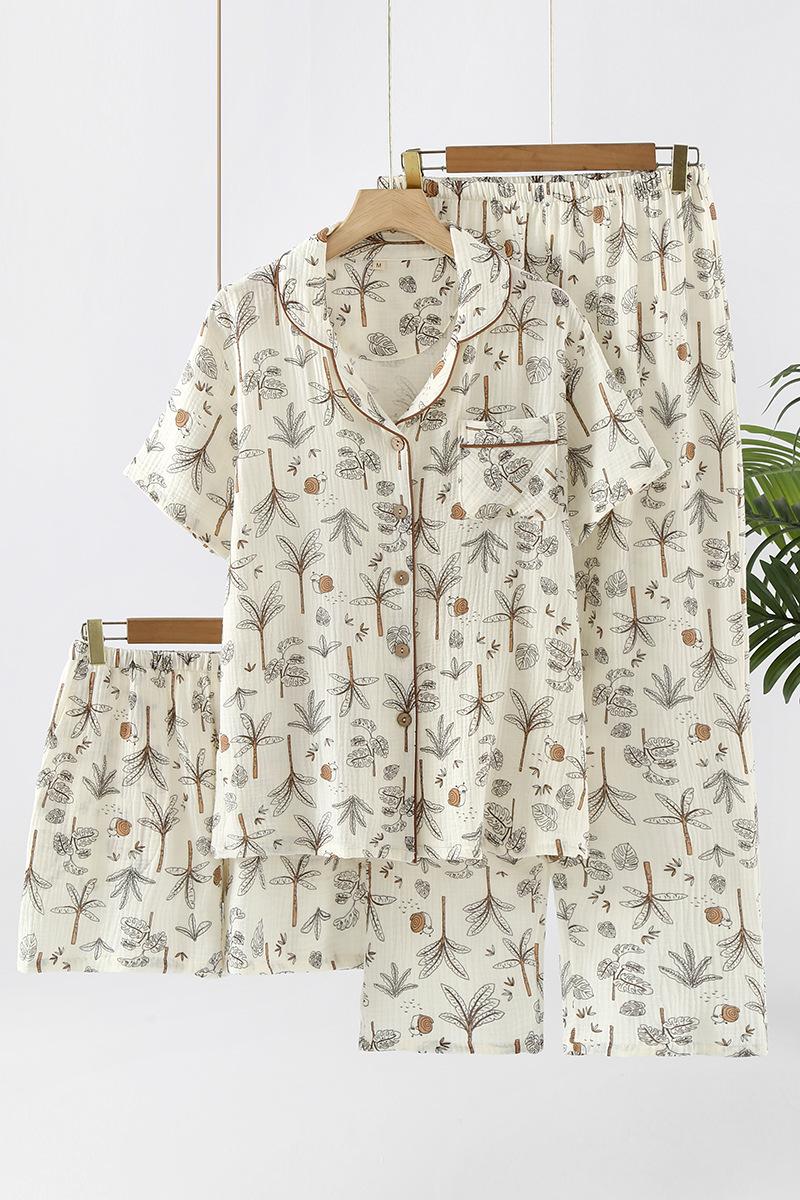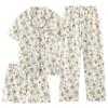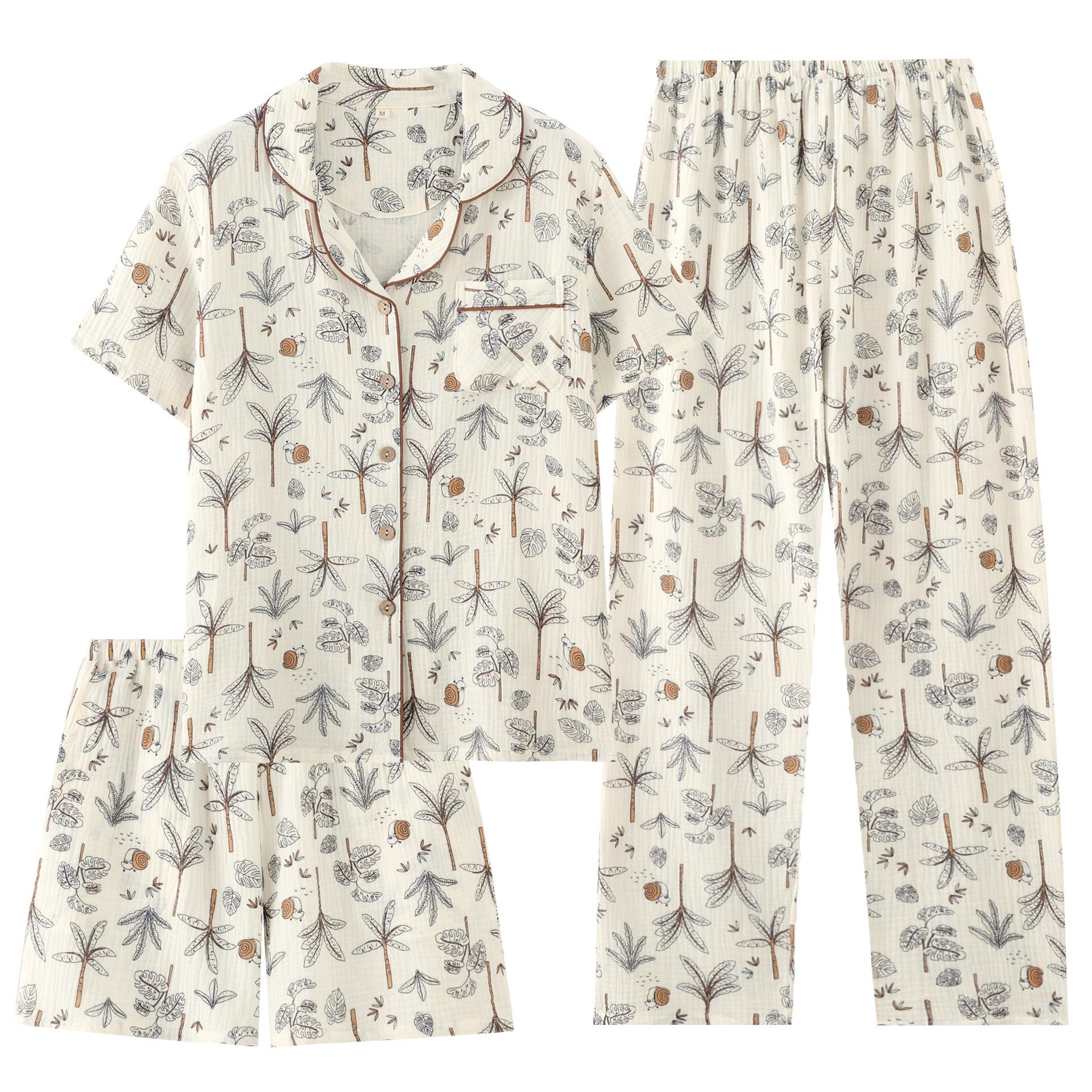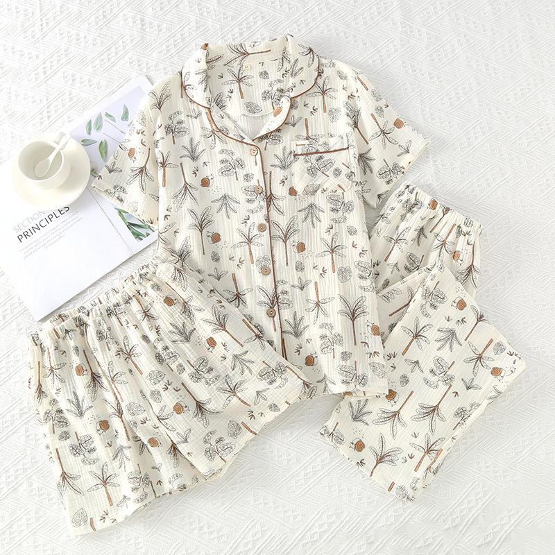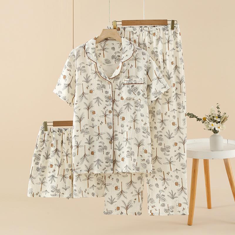 Crepé algodón hilo de algodón solapa estampado mujer primavera y otoño verano manga corta pantalones cortos traje de tres piezas para estar en casa fábrica