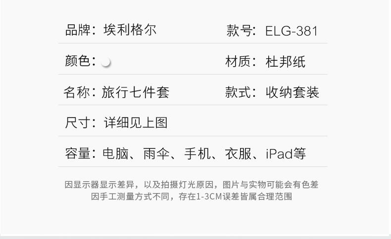 Detalles del producto: Un juego de siete piezas de bolsas de almacenamiento de viaje multifuncionales, incluyendo una bolsa para ropa, una bolsa para artículos de aseo, una bolsa para cosméticos y una bolsa cambiadora multifuncional. Tenemos una gran cantidad de stock y apoyamos el envío directo. Podemos personalizar texto, imágenes y logotipos en grandes cantidades según la demanda. Ofrecemos servicio al cliente profesional uno a uno. ¡Contacte con el servicio al cliente para más detalles!