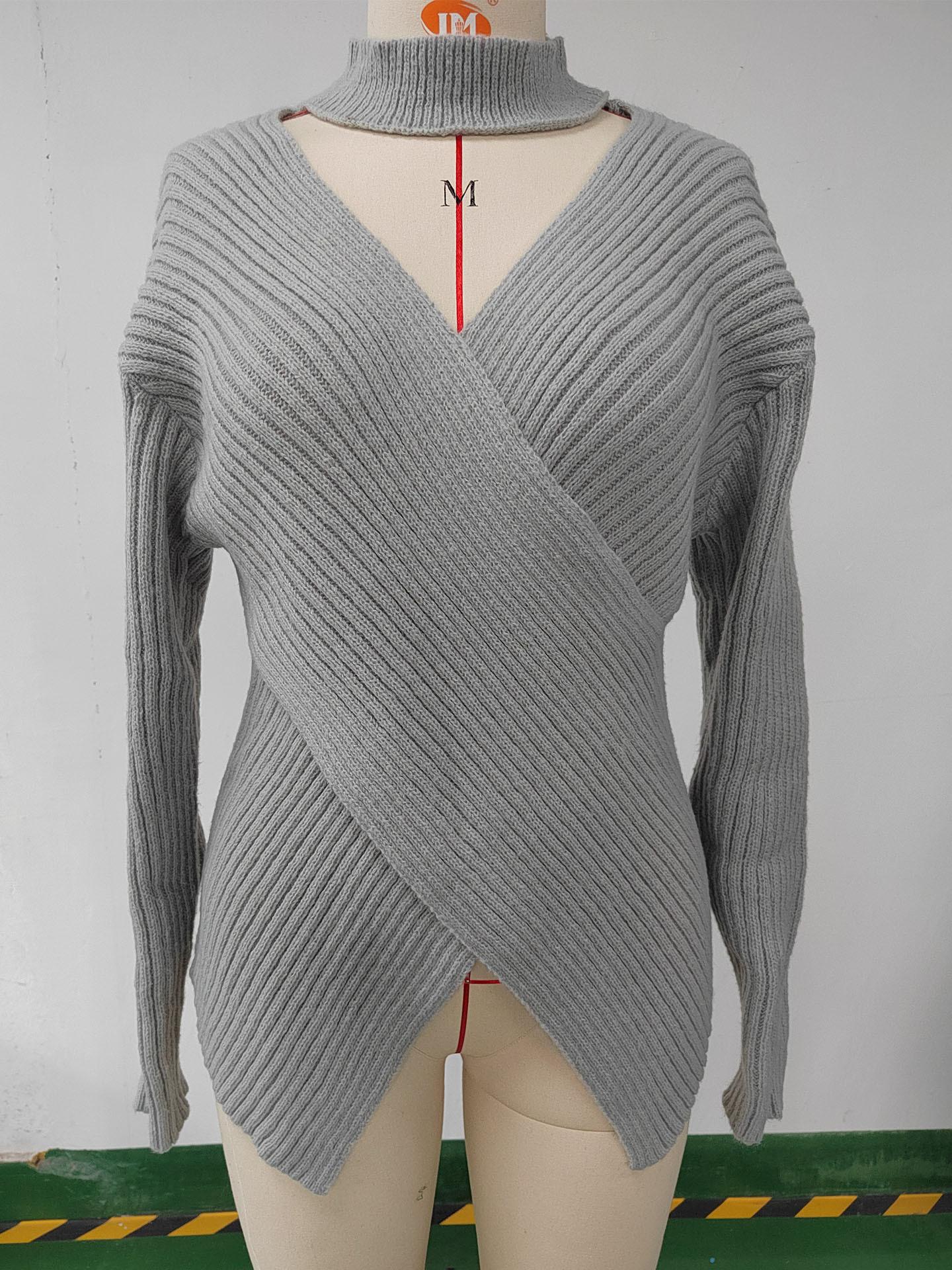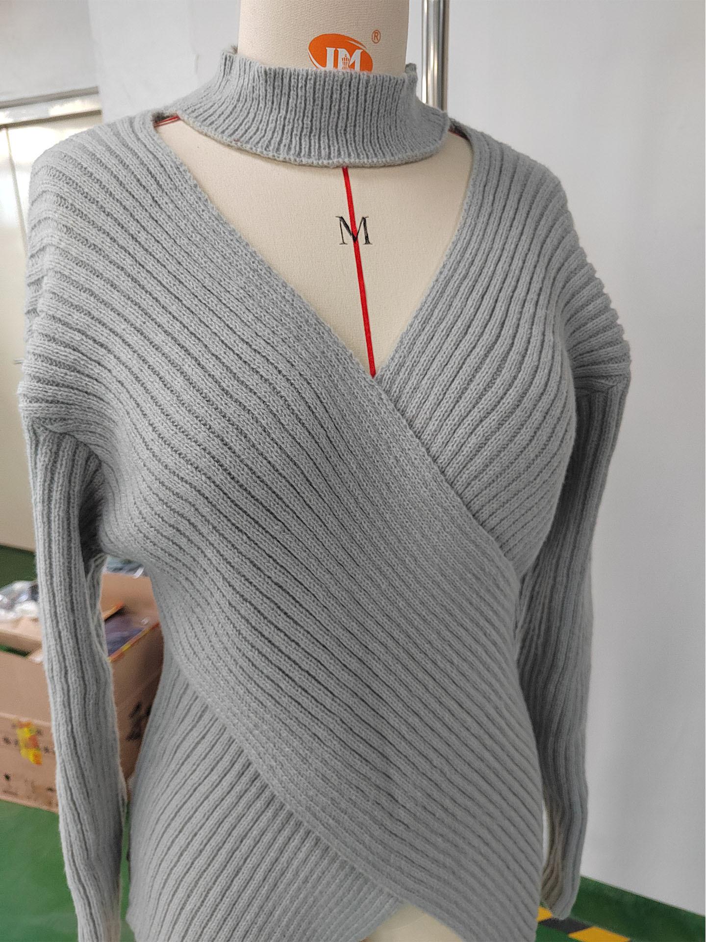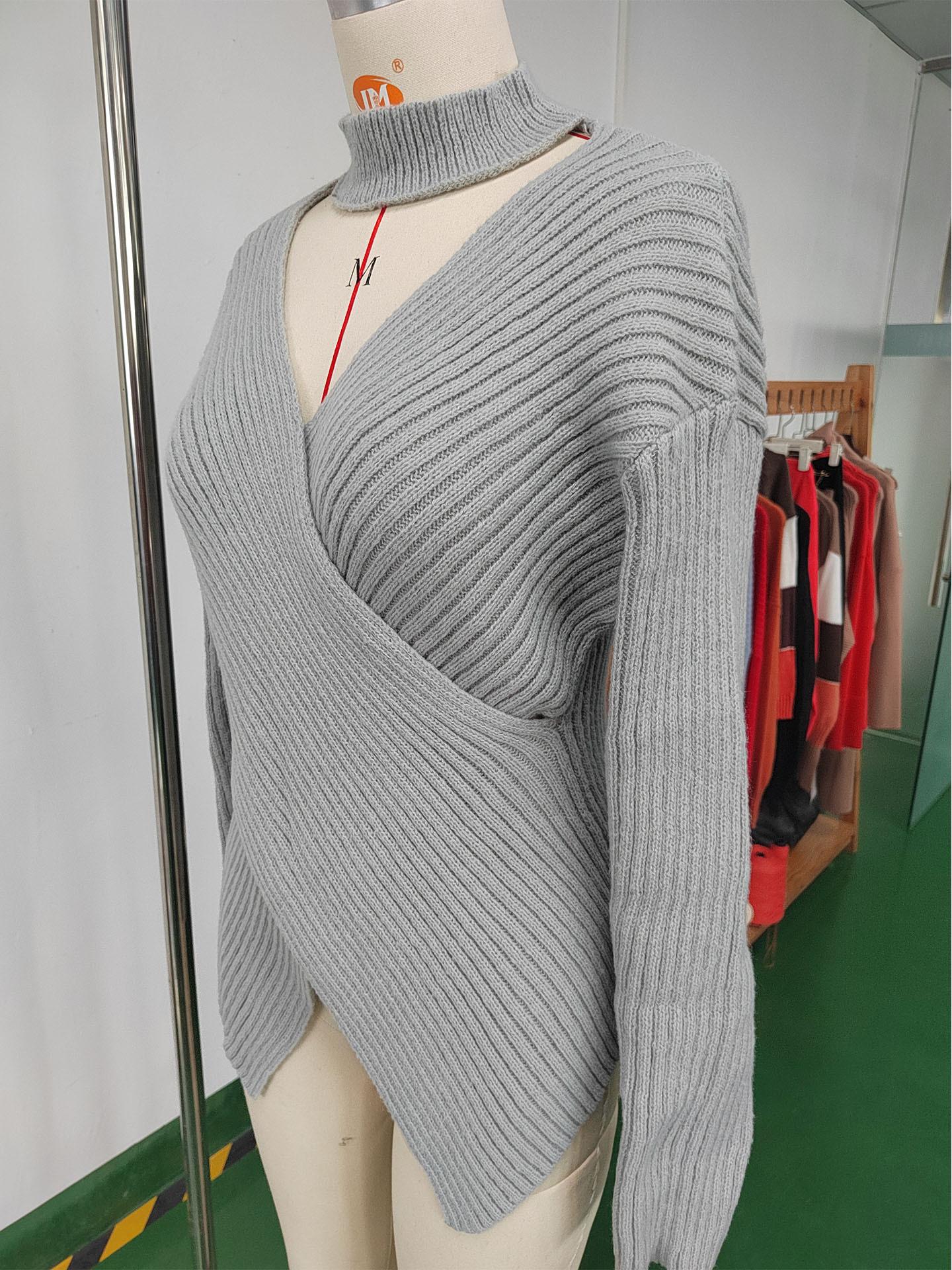 Europeo y Americano Otoño e Invierno Nuevo Transfronterizo Amazon Tops de Punto para Mujer con Cuello Halter en V Tejido de Punto de Color Puro para Mujer