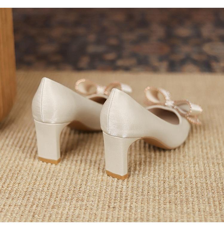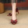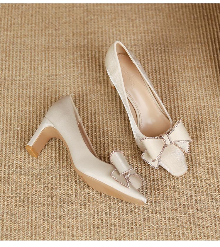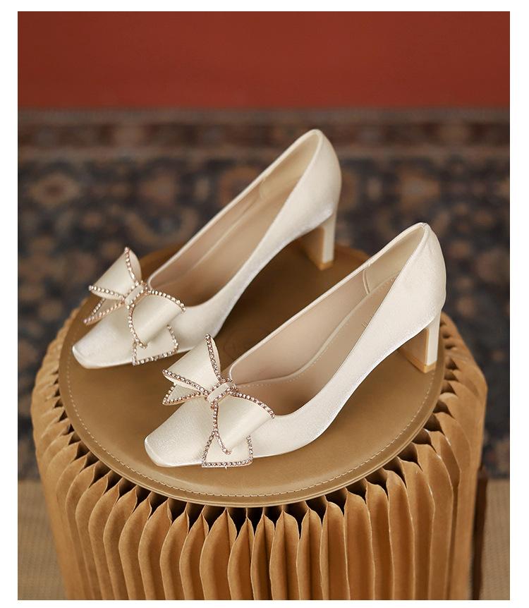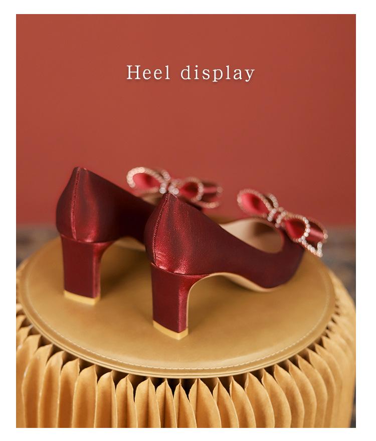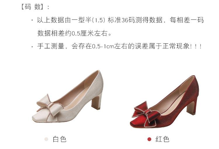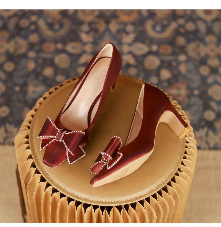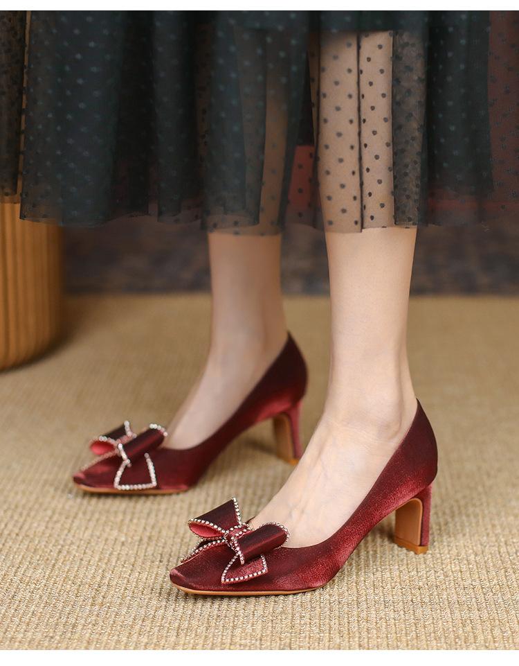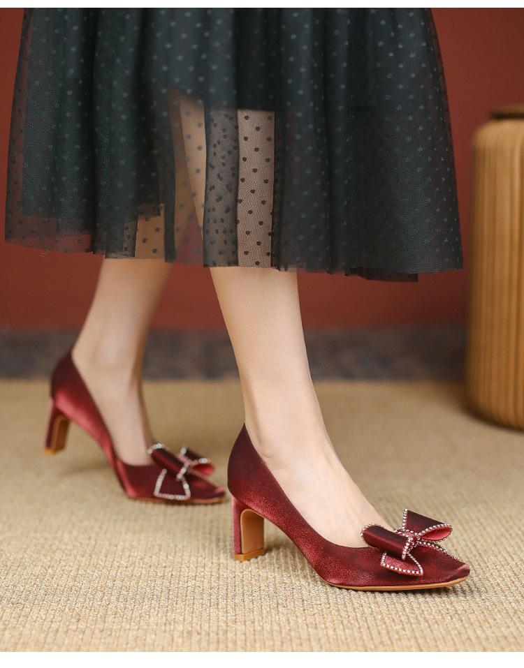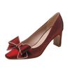 Zapatos de boda para mujer con punta cuadrada, tacón alto, lazo grueso, color rojo, otoño 2023, nuevos zapatos de boda de piel de oveja para dama de honor, para pies no cansados