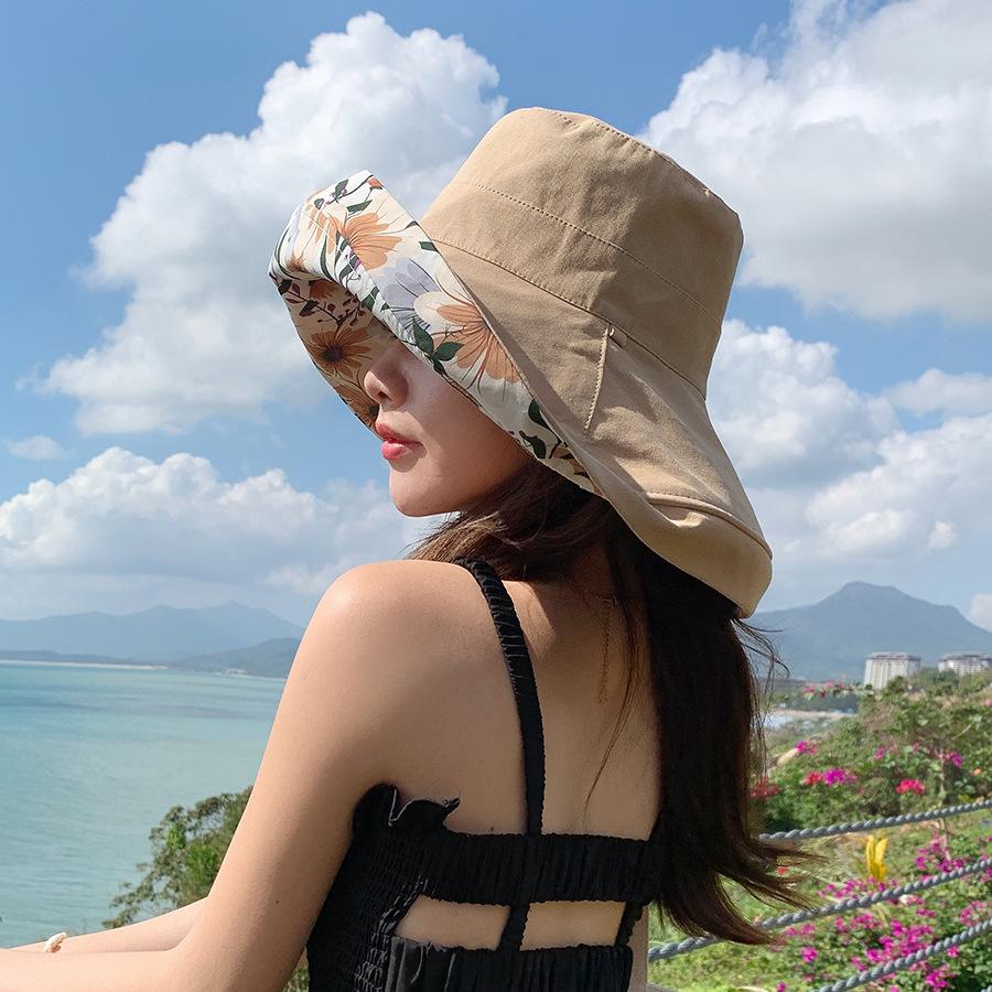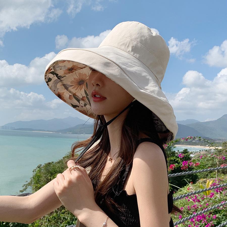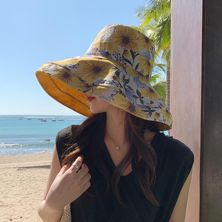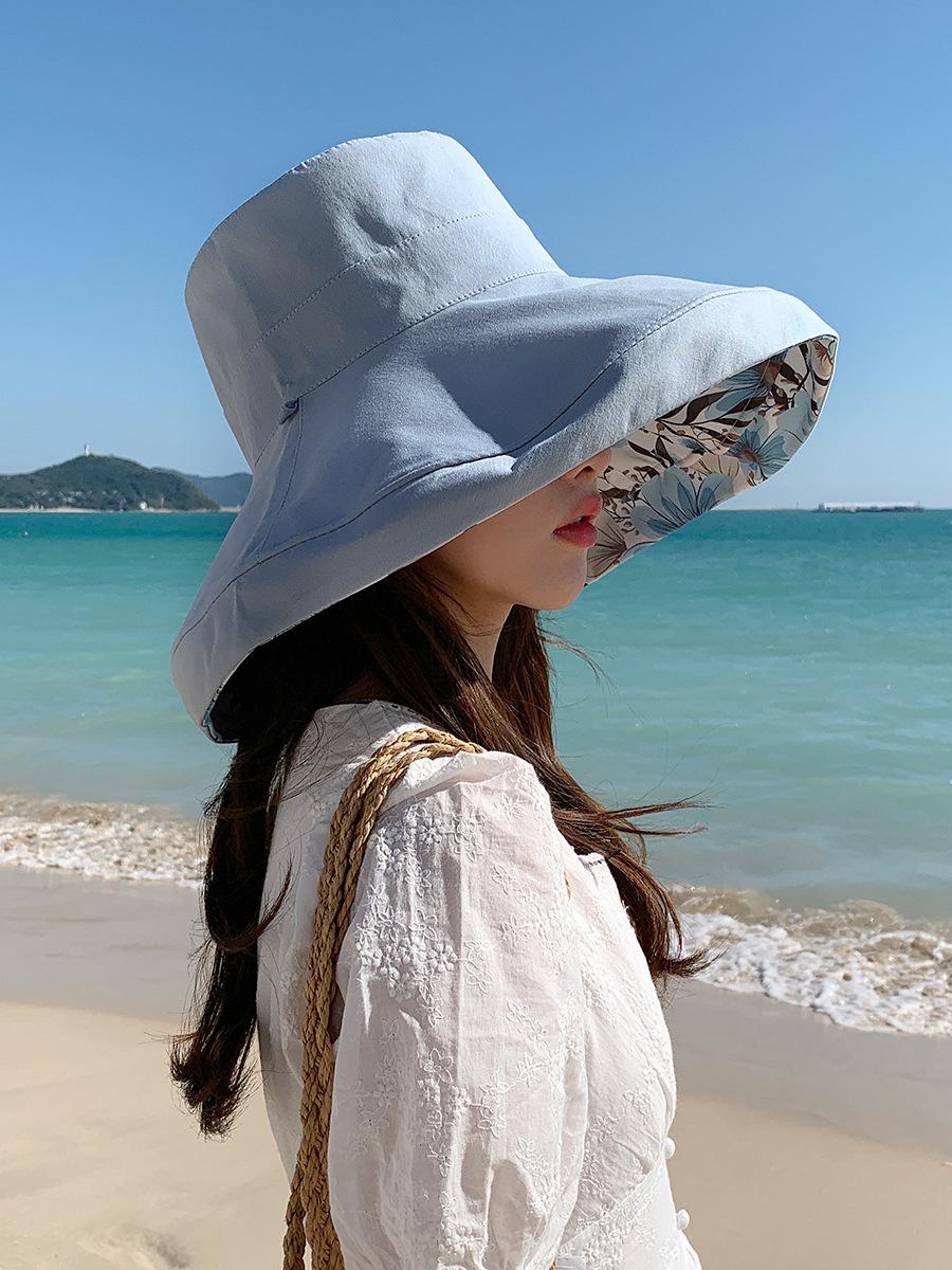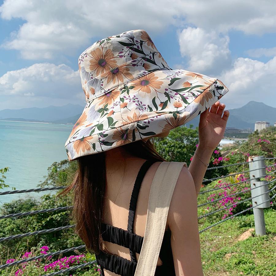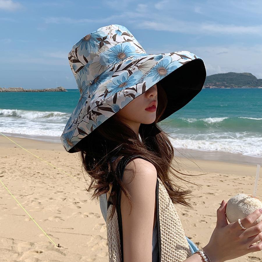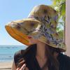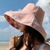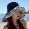 Sombrero de pescador coreano de verano nuevo estampado de doble cara para mujer de ala extra grande para protección solar UV