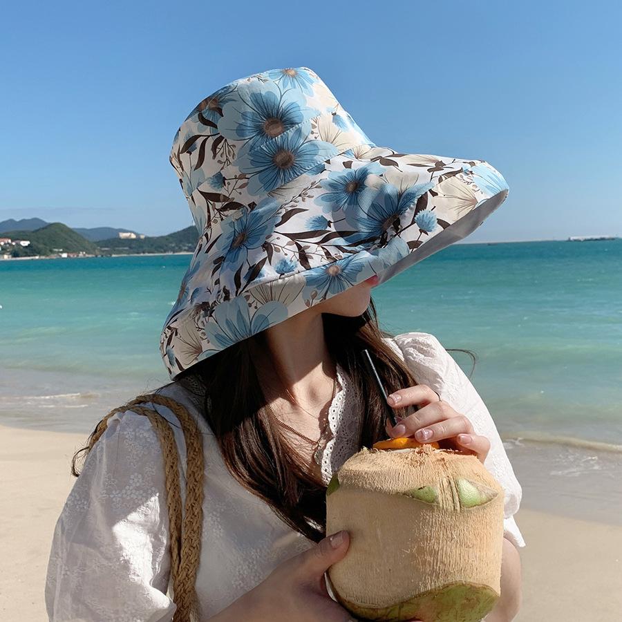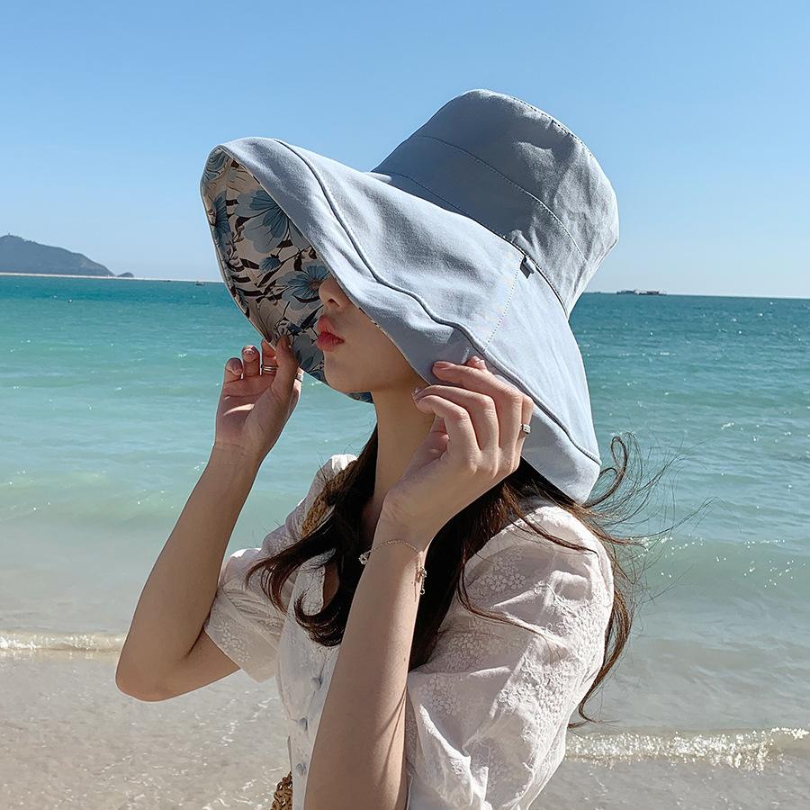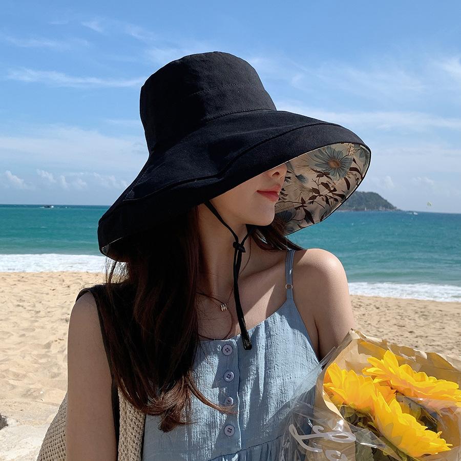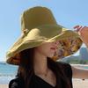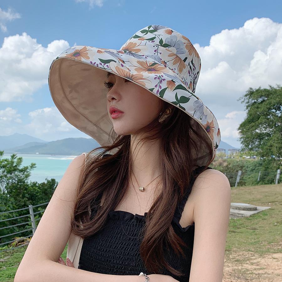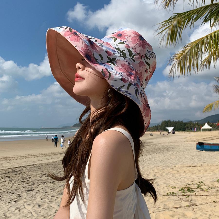 Sombrero de pescador coreano de verano nuevo estampado de doble cara para mujer de ala extra grande para protección solar UV