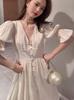 2025 Nuevo Vestido de Manga Abullonada de Hada con Cuello en V Color Albaricoque para Mujer Estilo Suave de Lujo Ligero Estilo Hepburn Francés