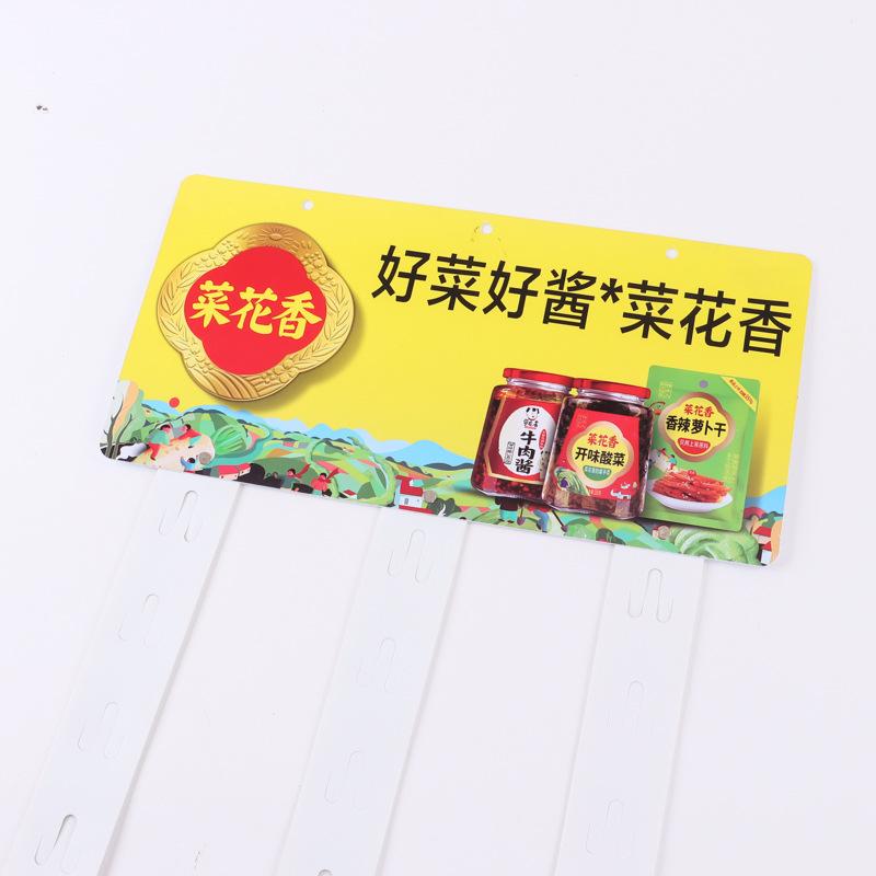 Tira colgante de plástico PP personalizada para exhibición de productos de supermercado, tira colgante personalizada para promoción de actividades alimentarias, logotipo impreso