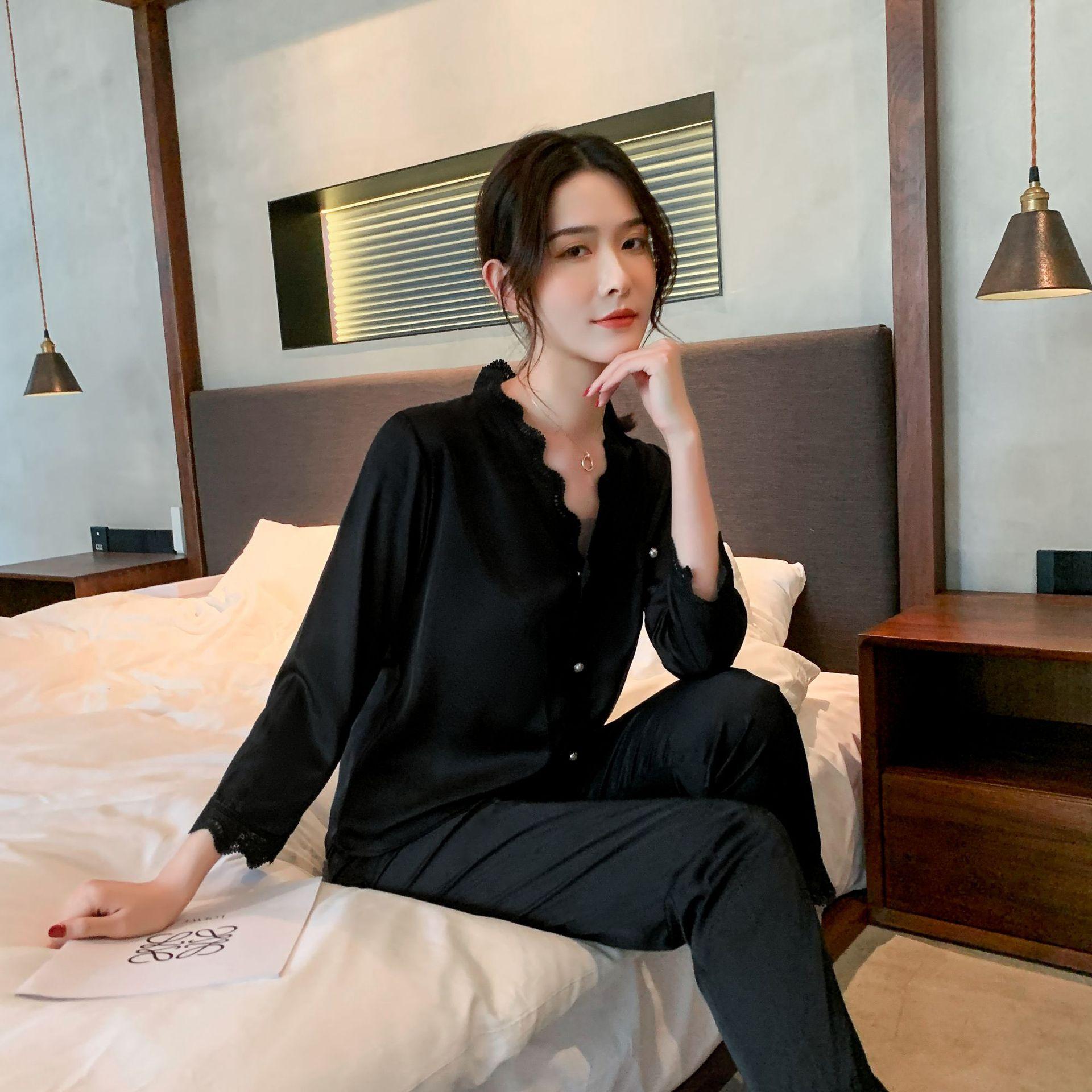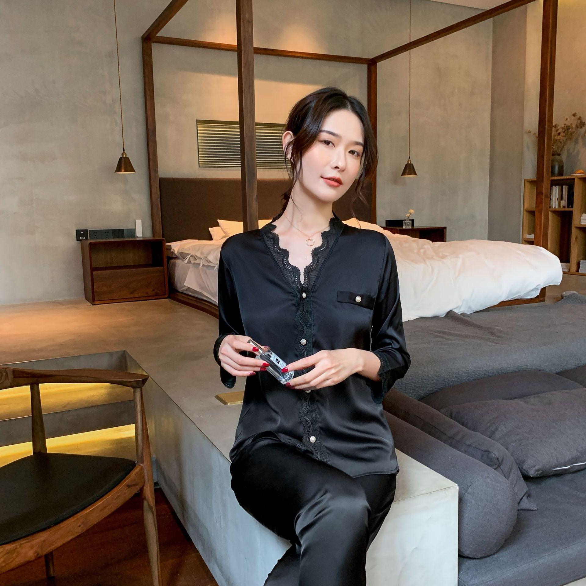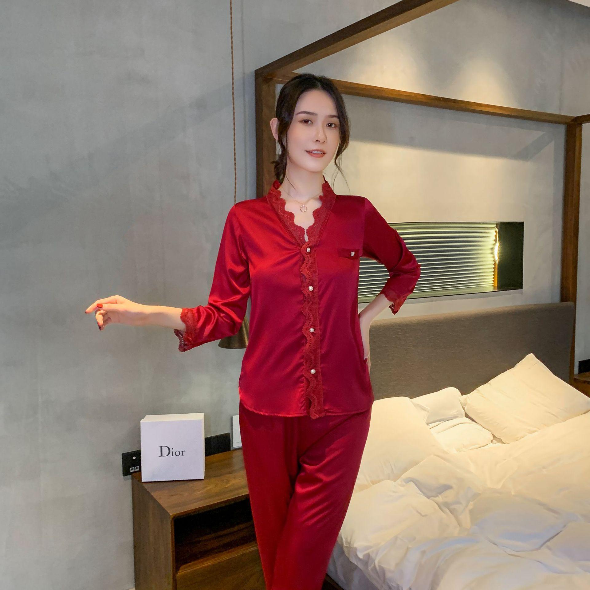 Pijama de satén de moda para mujer, cárdigan ajustado de seda de primavera y verano, conjunto de manga larga, ropa de hogar sexy de seda helada