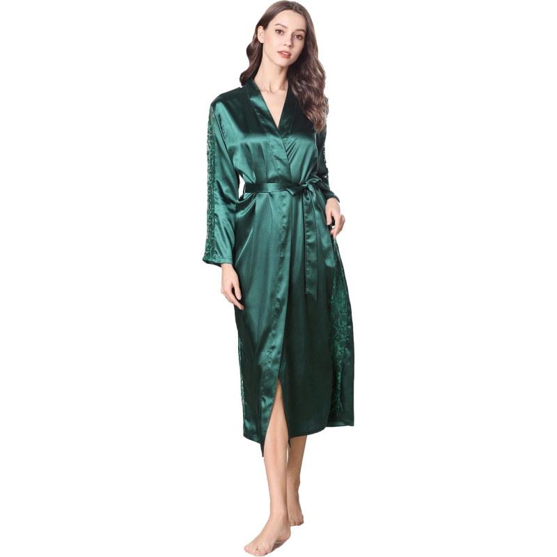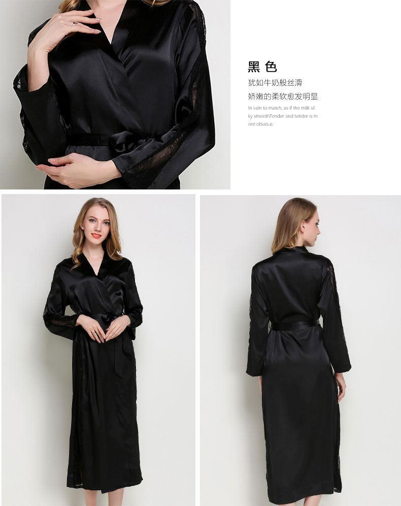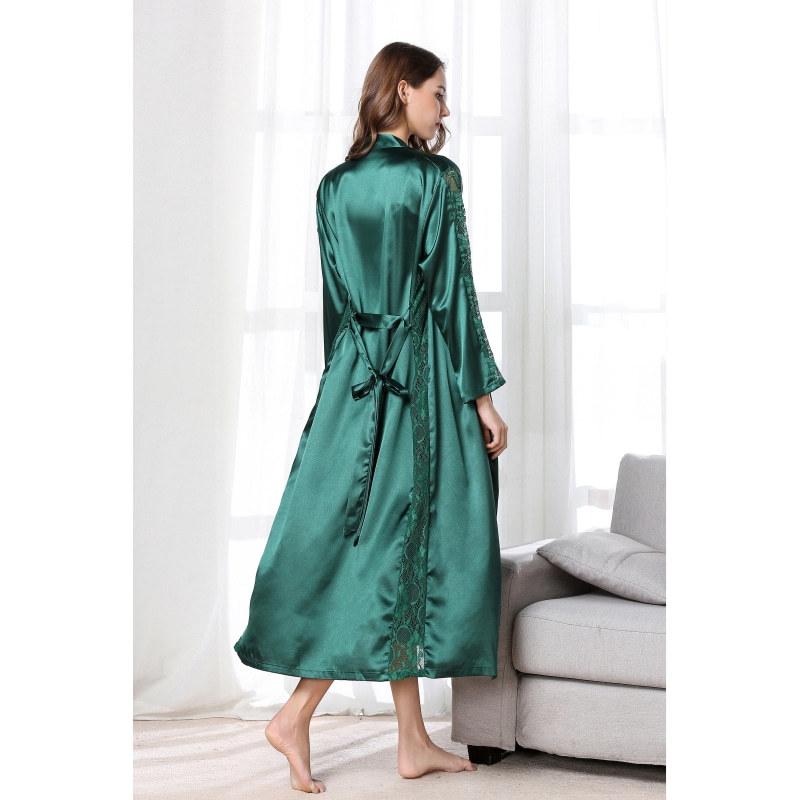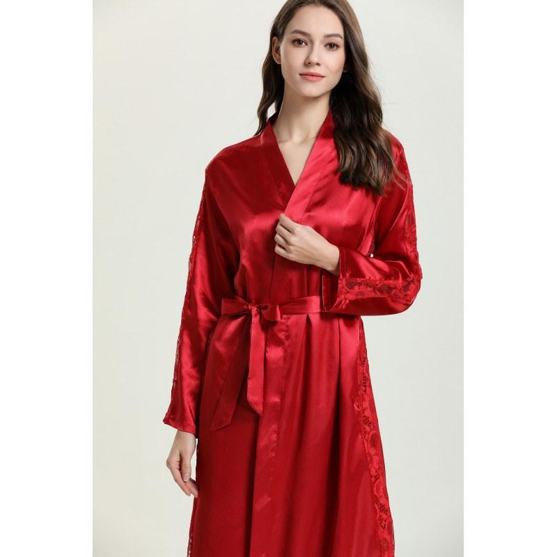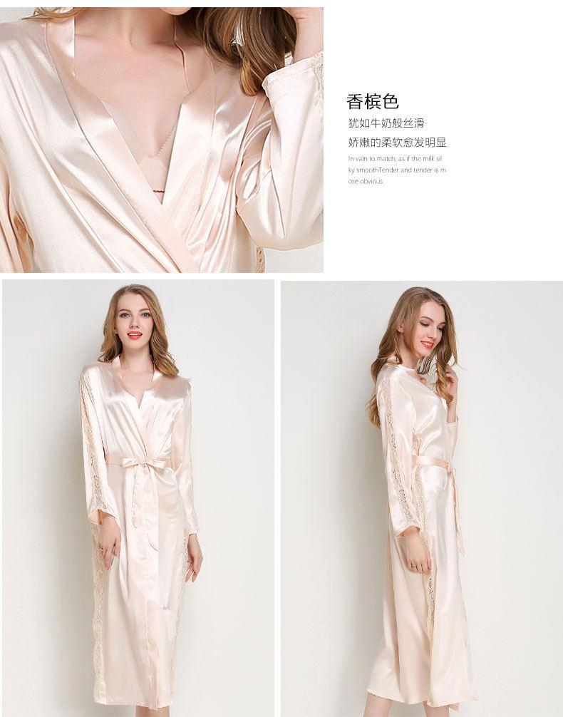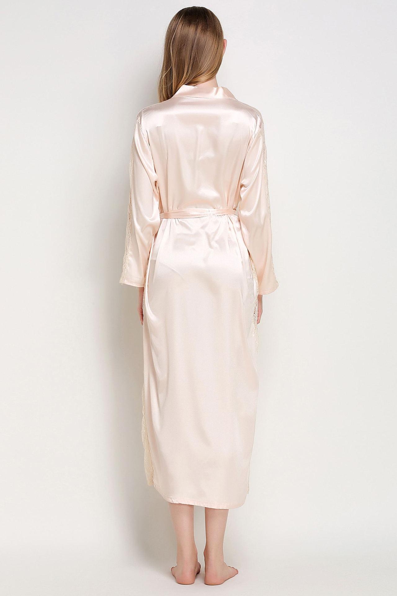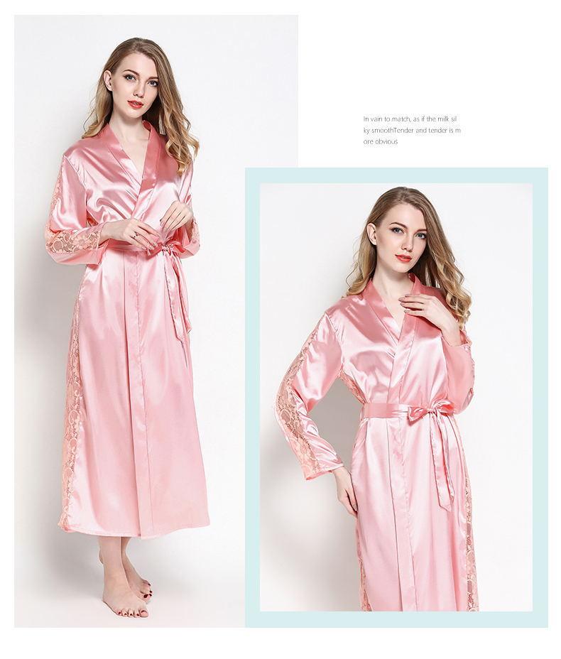 Bata de Encaje para Mujer Delgada de Manga Larga Sexy Bata de Vestir Imitación Seda Color Puro Extralarga Camisón Primavera y Verano