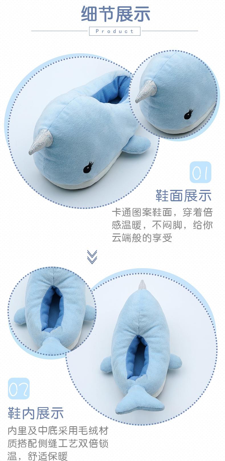 Pantuflas de algodón cálidas para interiores con diseño de animales, pantuflas de algodón de peluche para el hogar, lindo juguete con cabeza de ballena de dibujos animados, especificaciones completas