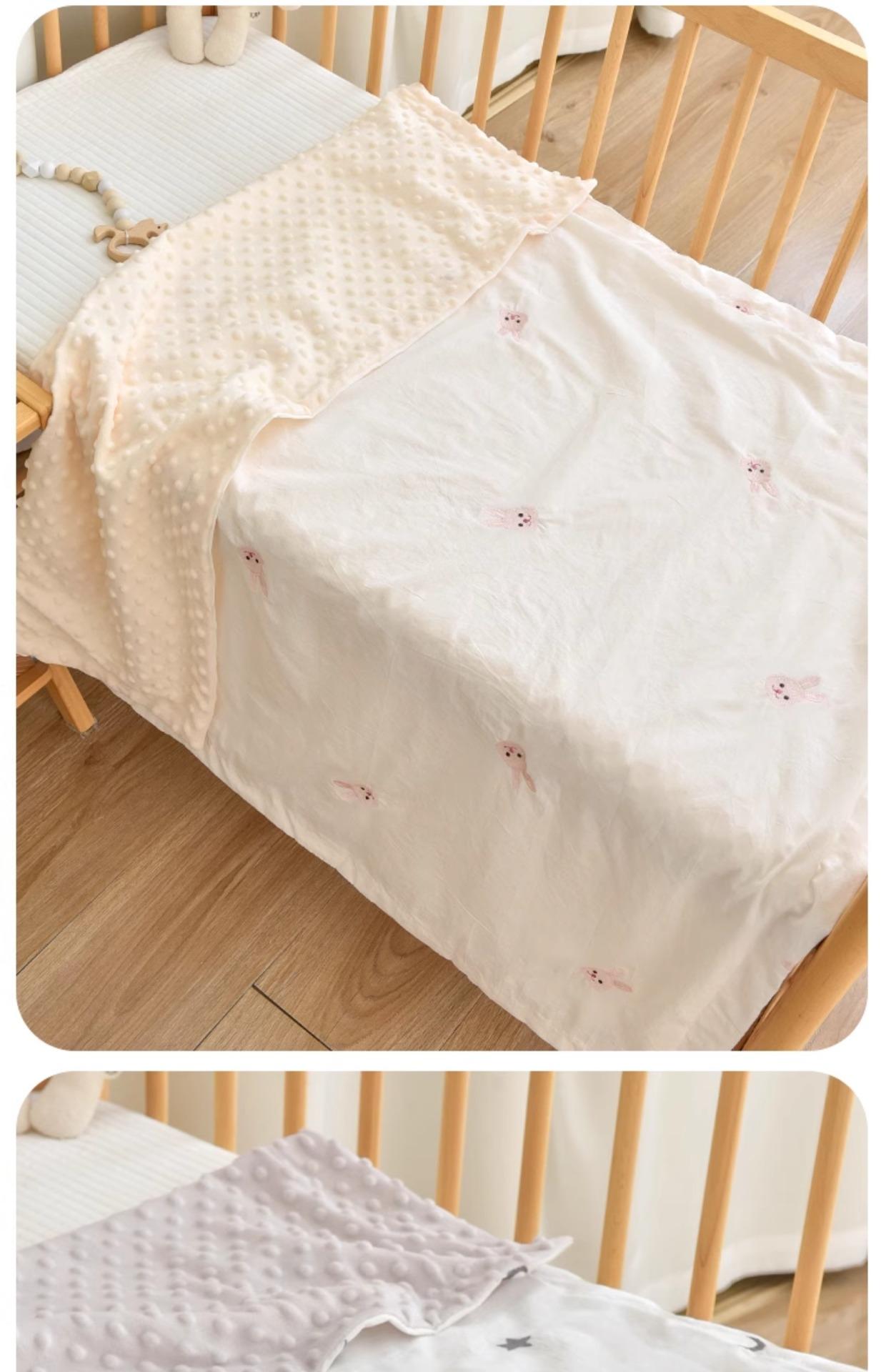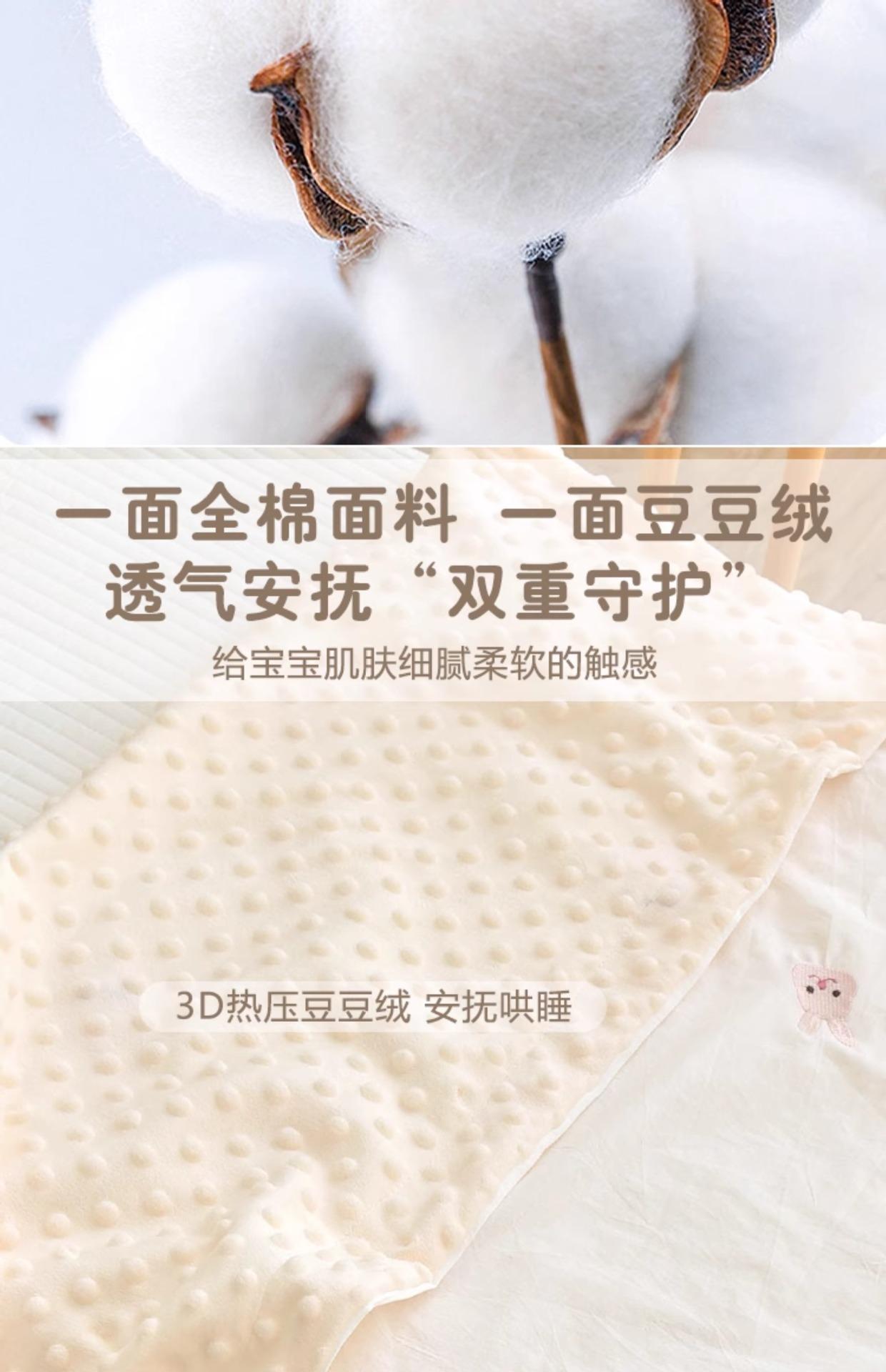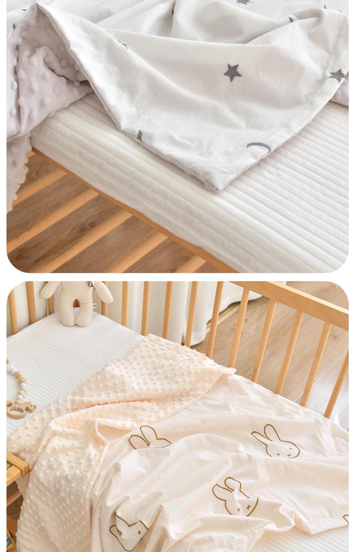 Consejos de lavado: Lavar a mano a 30 grados, lavar a máquina en modo suave. O póngalo en una bolsa de lavandería, no lo exponga al sol, no lo enjuague ni lo hierva en agua a alta temperatura. Material: Un lado 100% algodón Un lado minky 3D Tamaño: Pequeño: 70 x 100 cm, adecuado para bebés de 0 a 1 año. Mediano: 100*120cm adecuado para bebés de 0 a 3 años Tamaño grande: 120*150cm adecuado para bebés de 3 a 8 años (Dimensiones medidas a mano, puede haber ligeros errores) El material de superficie de algodón puro se encogerá ligeramente, lo cual no afecta el uso. El patrón de corte y la dirección son aleatorios, tenga cuidado al tomar las fotos