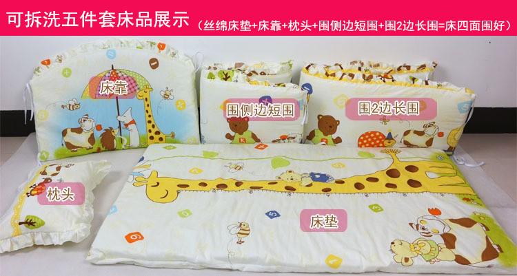 El juego de cama incluye (almohadilla de algodón*1, almohada*1, protector de cuna*1, protector lateral corto*1, protector lateral largo*1) todos con relleno interior, las fundas de tela son removibles y lavables.