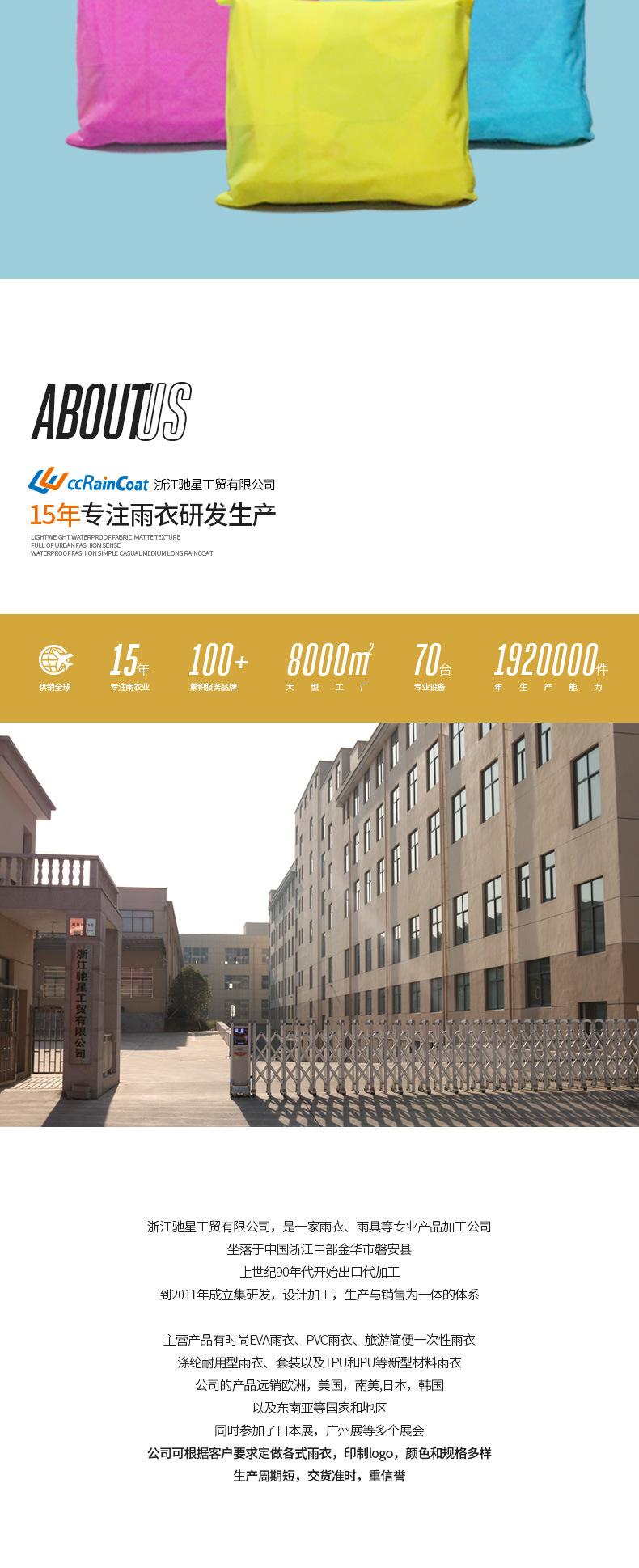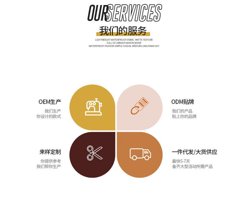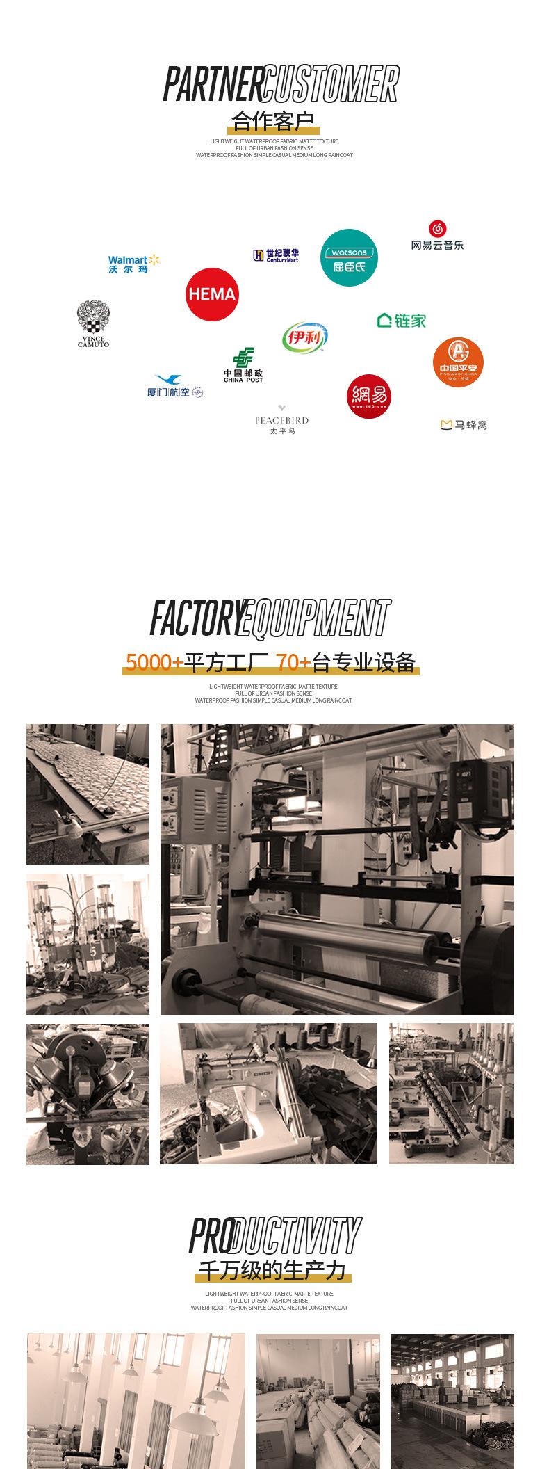 A lo largo de su trayectoria, los impermeables que fabricamos se han consolidado en el mercado gracias a su calidad confiable, precios preferenciales y un servicio excelente, lo que nos ha ganado la confianza de nuestros clientes. Nuestros diversos productos, de gama alta, media y baja, satisfacen las necesidades de diferentes grupos de consumidores. También personalizamos diversos impermeables publicitarios y exportamos según muestras. Nuestros productos son muy apreciados por empresarios extranjeros, y hemos establecido relaciones de cooperación a largo plazo con ellos de todo el mundo.
