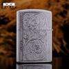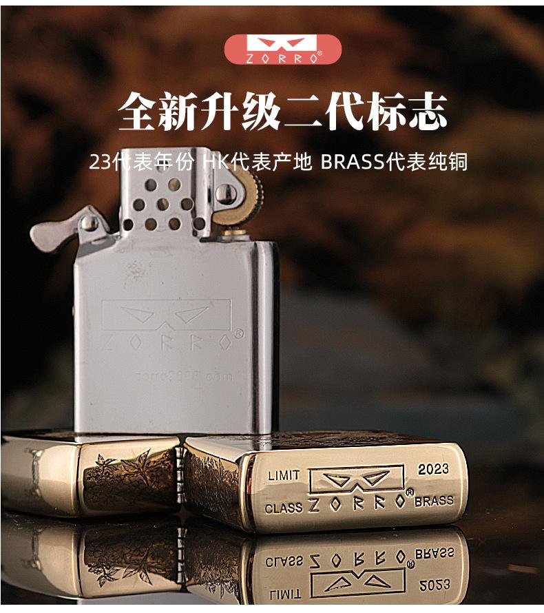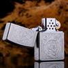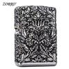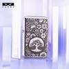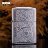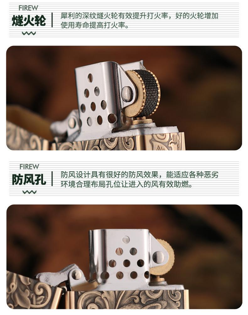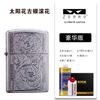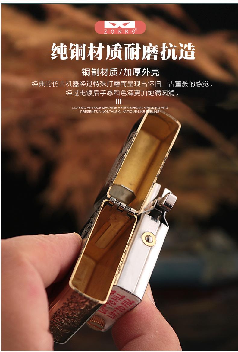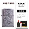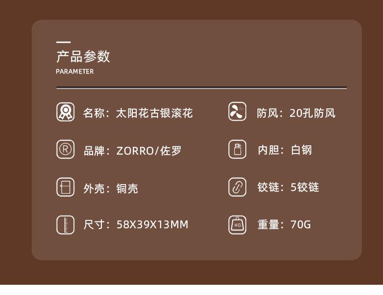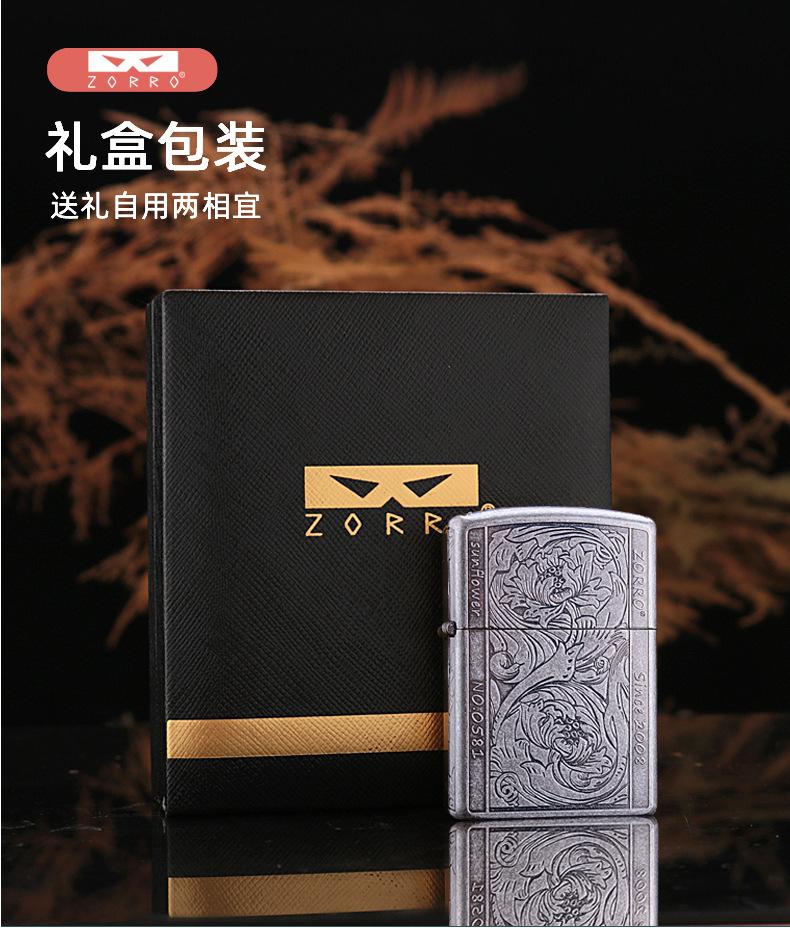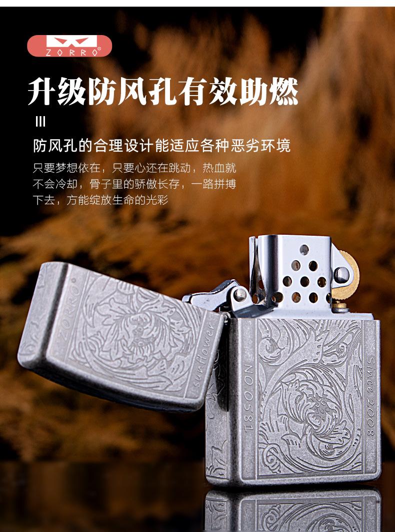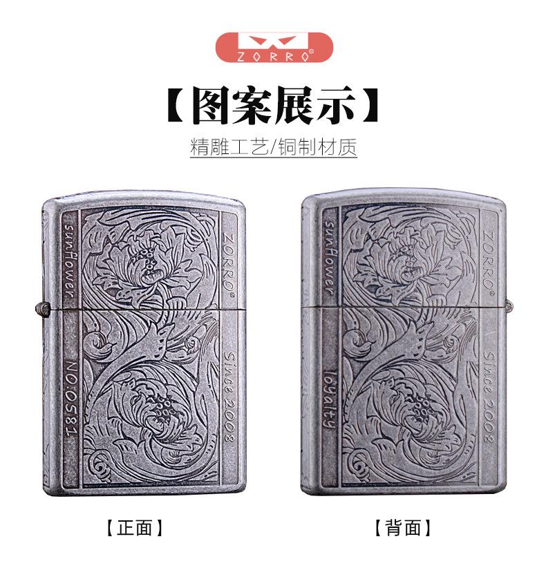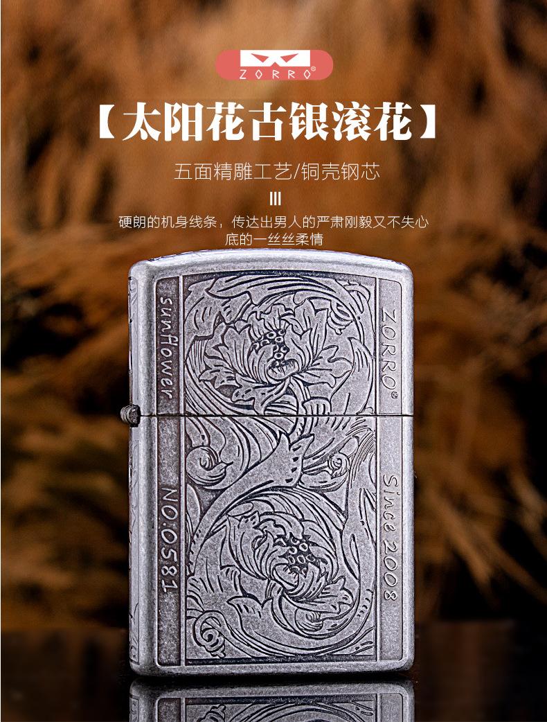 Encendedor de queroseno ZORRO ZORRO de segunda generación, de plata antigua con diseño de girasol, de cobre puro tallado por ambos lados, resistente al viento y con caja de regalo para hombre.