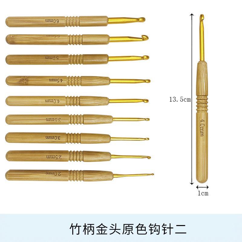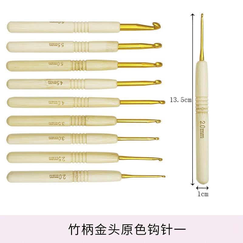 Nombre: Mango de Bambú Cabeza Dorada Color Natural Ganchillo Tamaño: 13.5*1cm Peso: Pieza individual alrededor de 6.0g/Juego completo alrededor de 61.3g/Con accesorios alrededor de 14.7g Modelo: 2.0mm、2.5mm、3.0mm、3.5mm、4.0mm、4.5,mm、5.0mm、5.5mm、6.0mm
