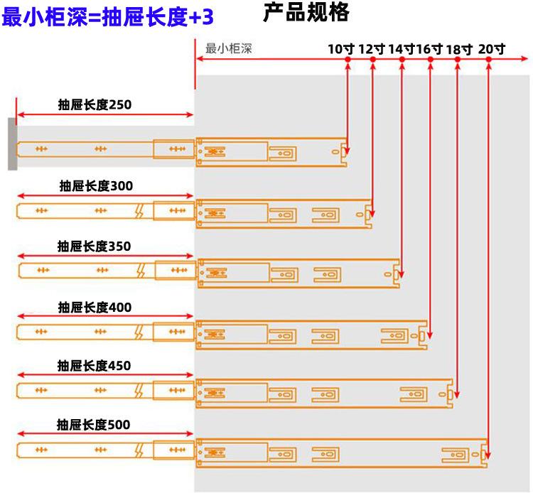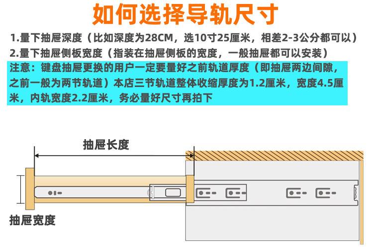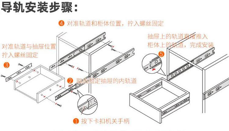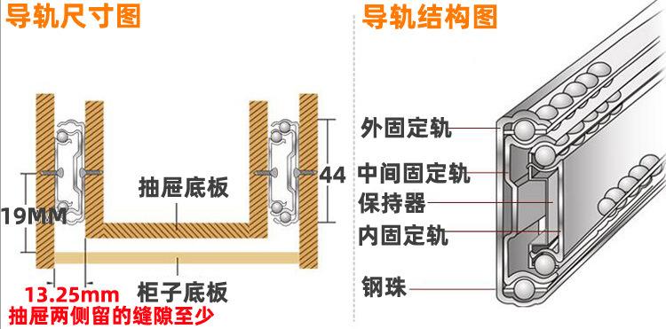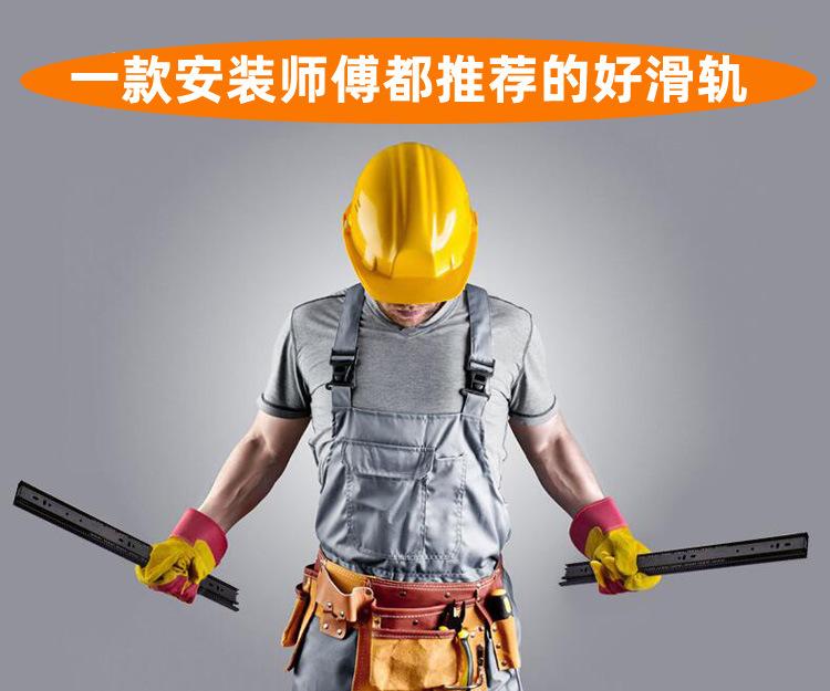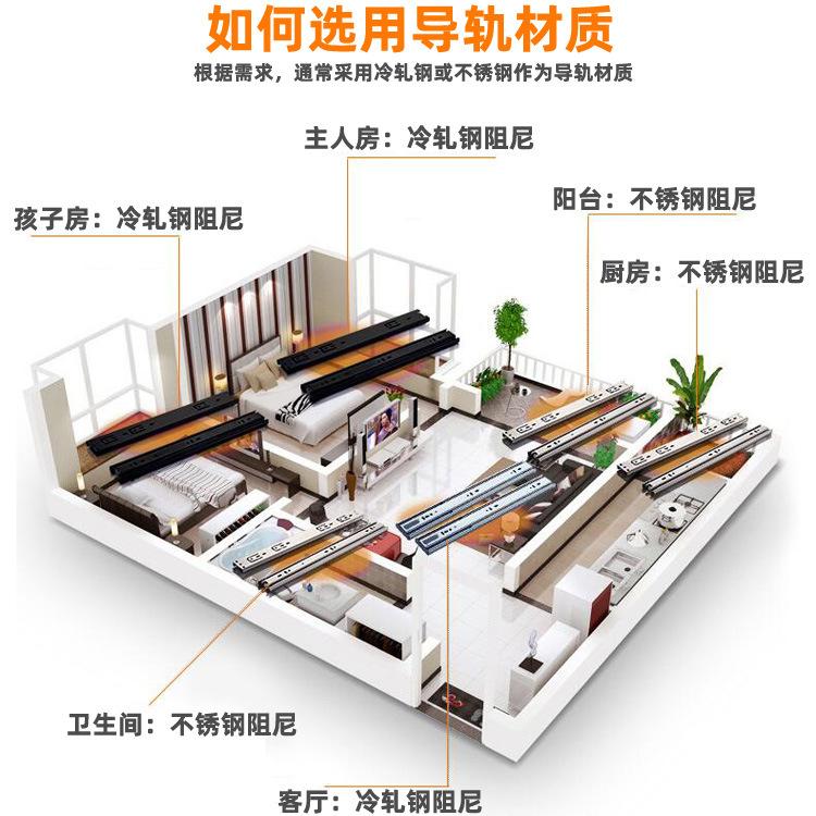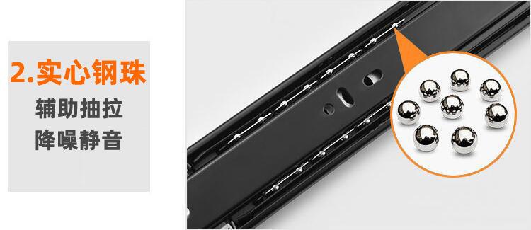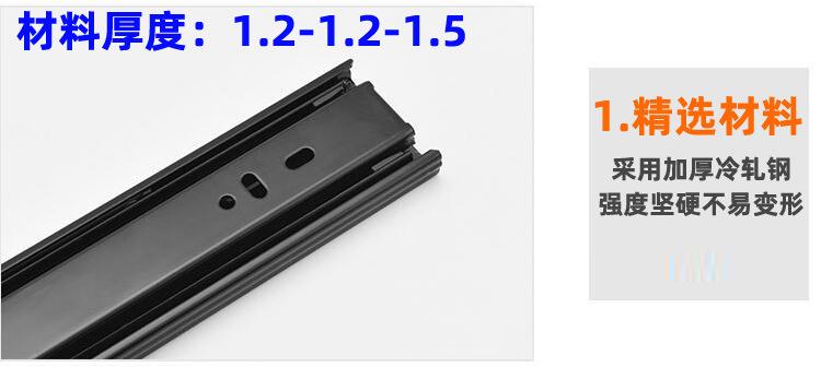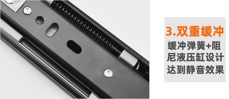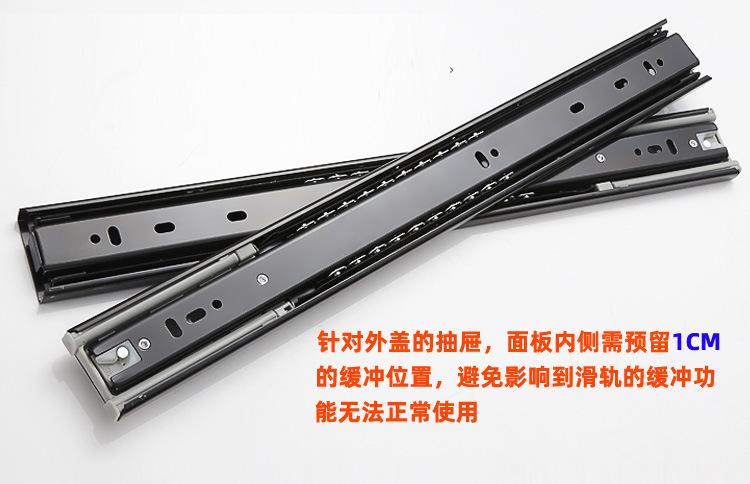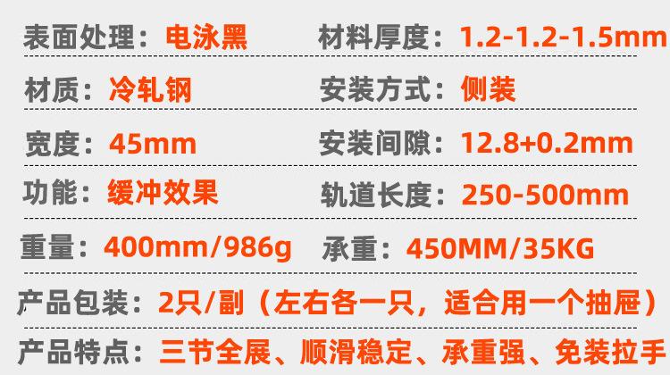 Nombre del producto: 1.2-1.2-1.5 corredera hidráulica de tres secciones con amortiguación, corredera de bolas de acero de 45 mm de ancho, corredera de extracción total, montaje lateral (Corredera para cajón de extensión completa con rodamiento de bolas de 45 mm de ancho y 1.2 mm de grosor con cierre suave)