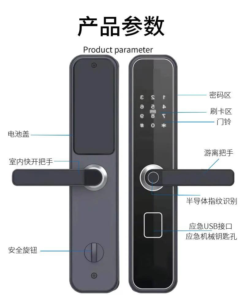 1. Paneles frontal y trasero de la cerradura de la puerta * 1 2. Cuerpo de la cerradura de la puerta antirrobo * 1 3. Accesorios de embalaje * 1 4. Llave de emergencia * 1 5. Manual de instrucciones * 1