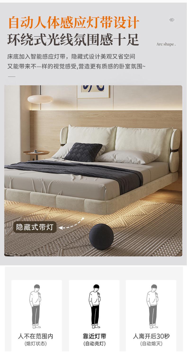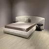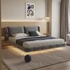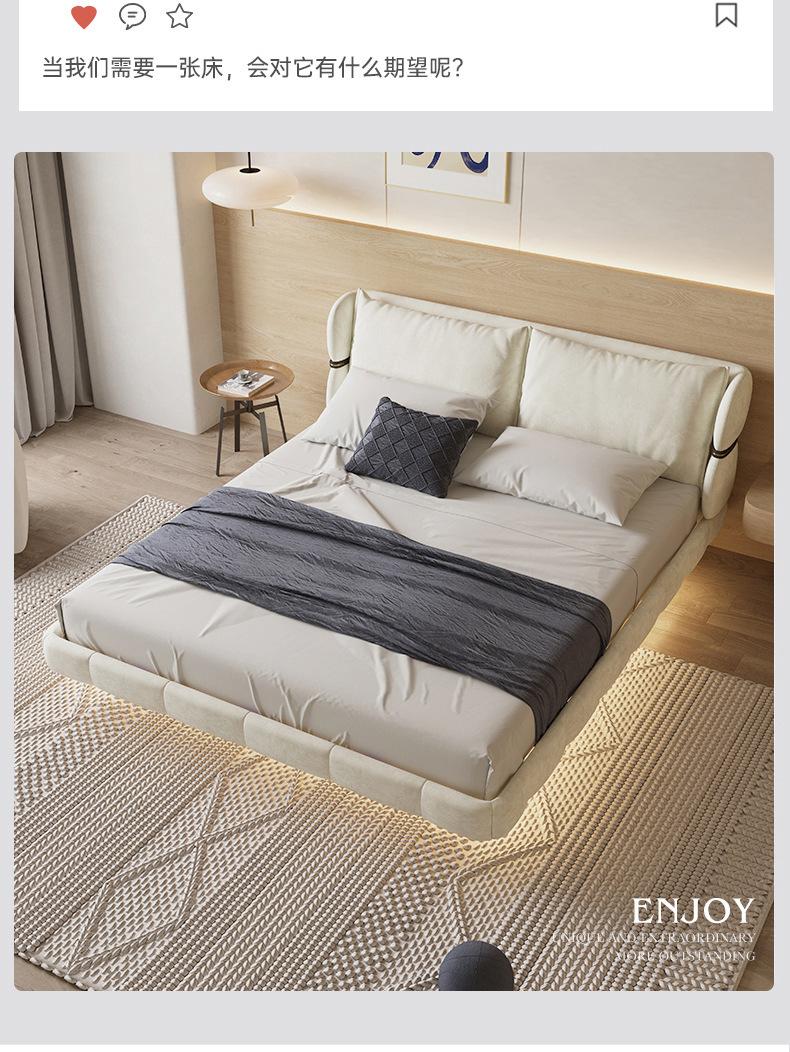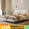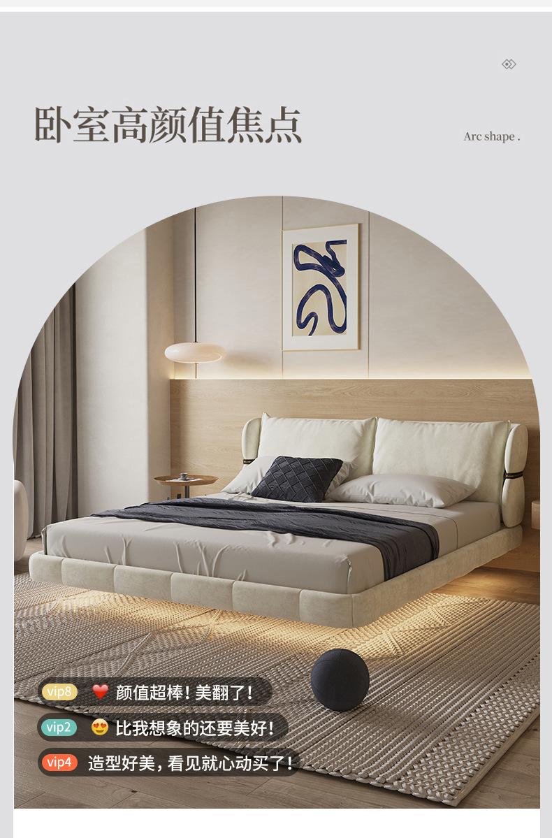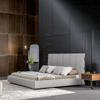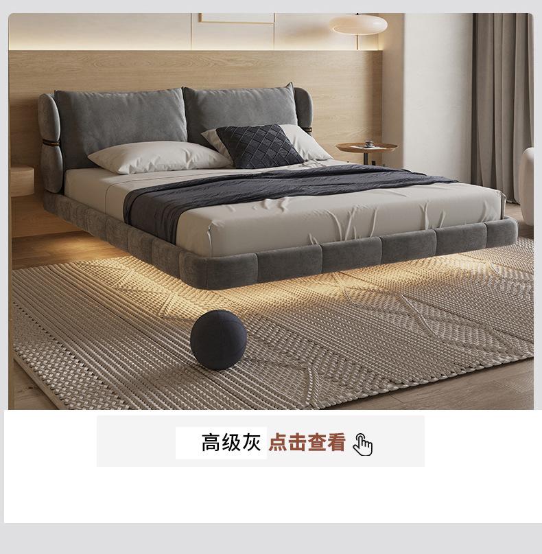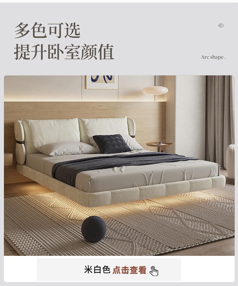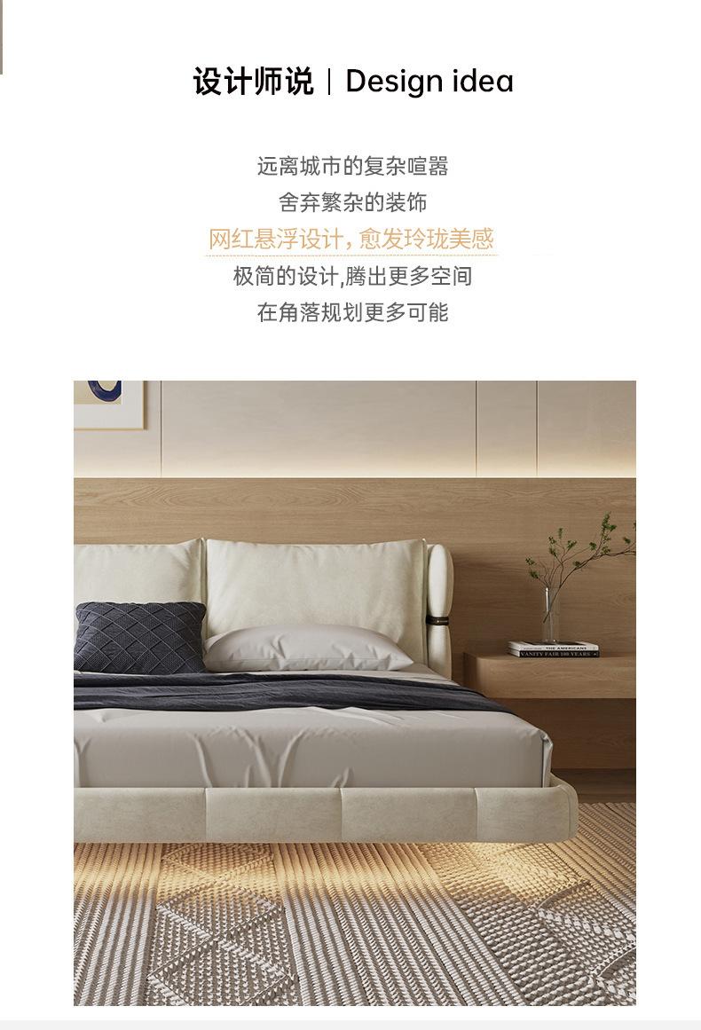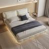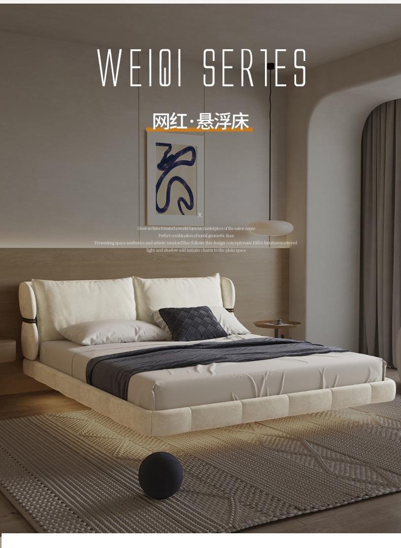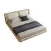 Cama colgante minimalista de estilo italiano con respaldo suave y tela de lujo ligera de madera maciza de estilo crema, cama doble minimalista moderna para dormitorio principal.