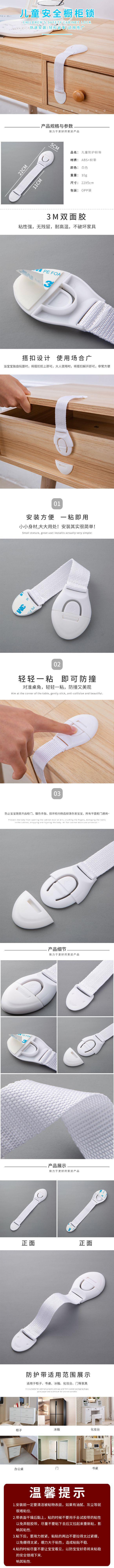 Este cierre de seguridad multifuncional, empaquetado en una sola bolsa OPP, es adecuado para la protección infantil en varios lugares. Puede reemplazar cierres dobles, cierres largos, cierres de ángulo recto, etc. Este cierre de seguridad está equipado con una pieza grande de cinta 3M, que tiene buena adherencia. Otros productos similares en el mercado