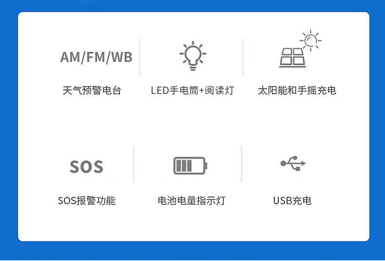 (12) 1 minuto de manivela manual soporta más de 20 minutos de tiempo de reproducción de radio / más de 30 minutos de luz de linterna continua / 5 minutos de tiempo de conversación por teléfono celular.