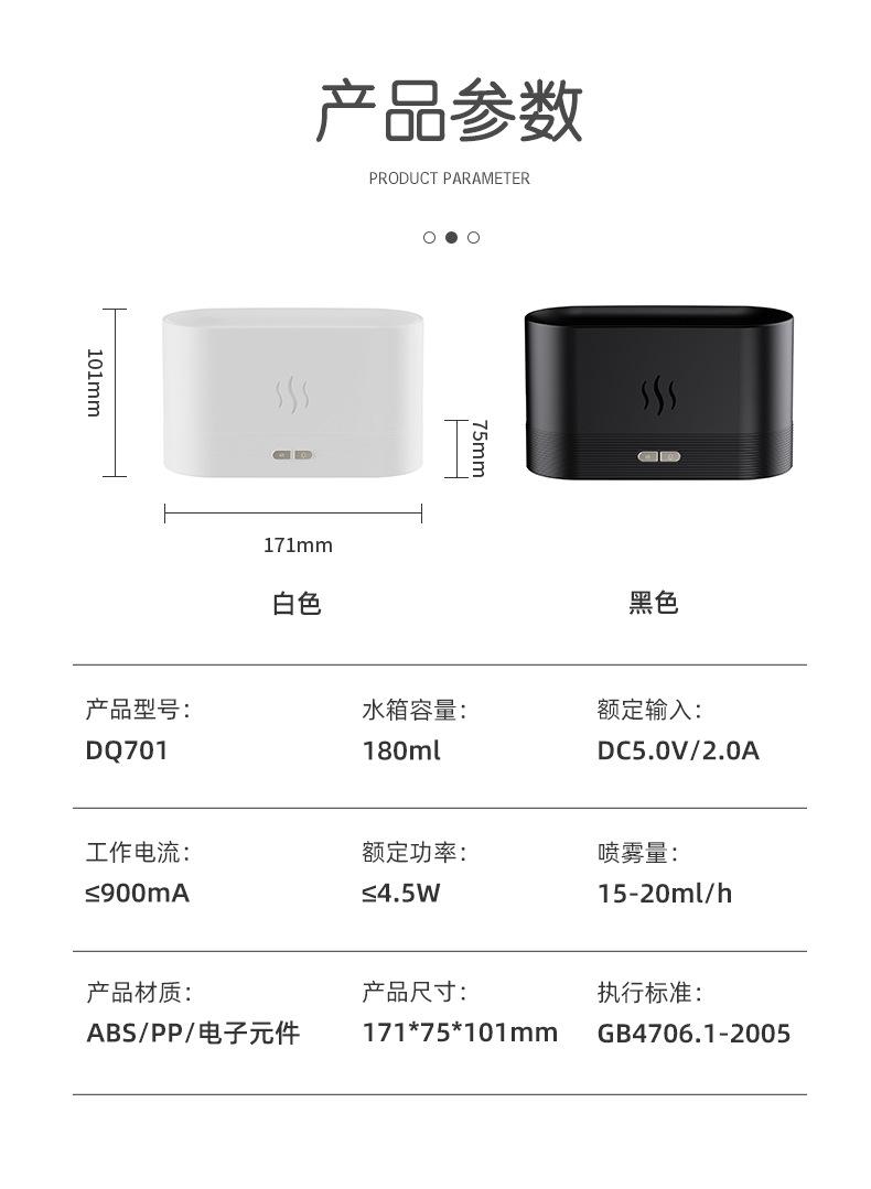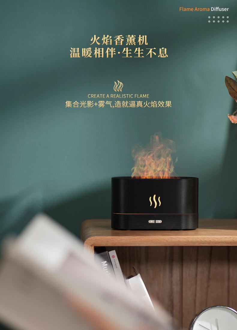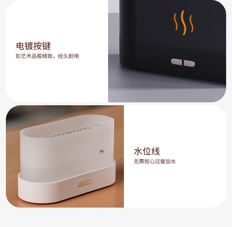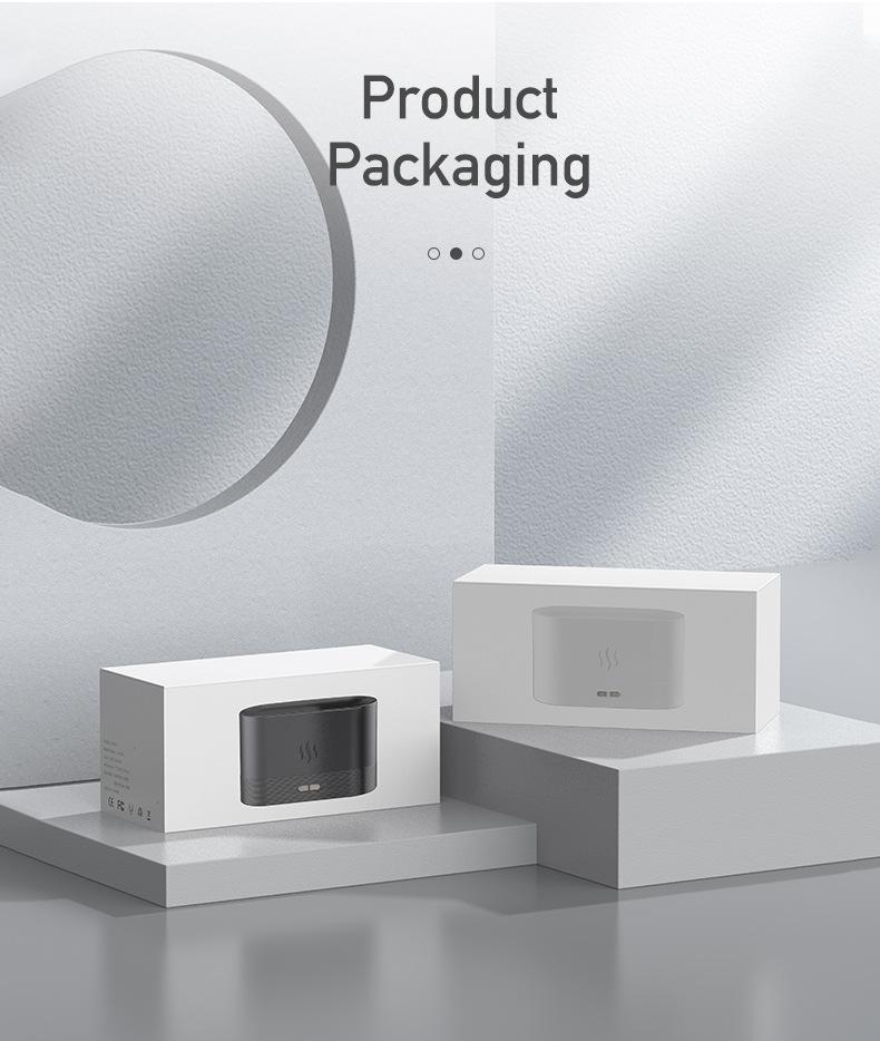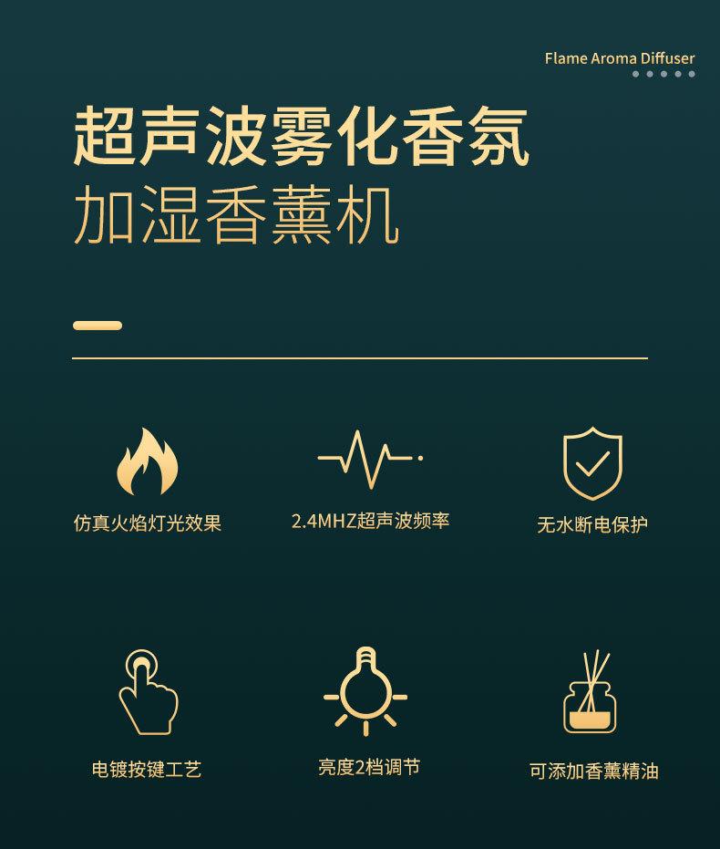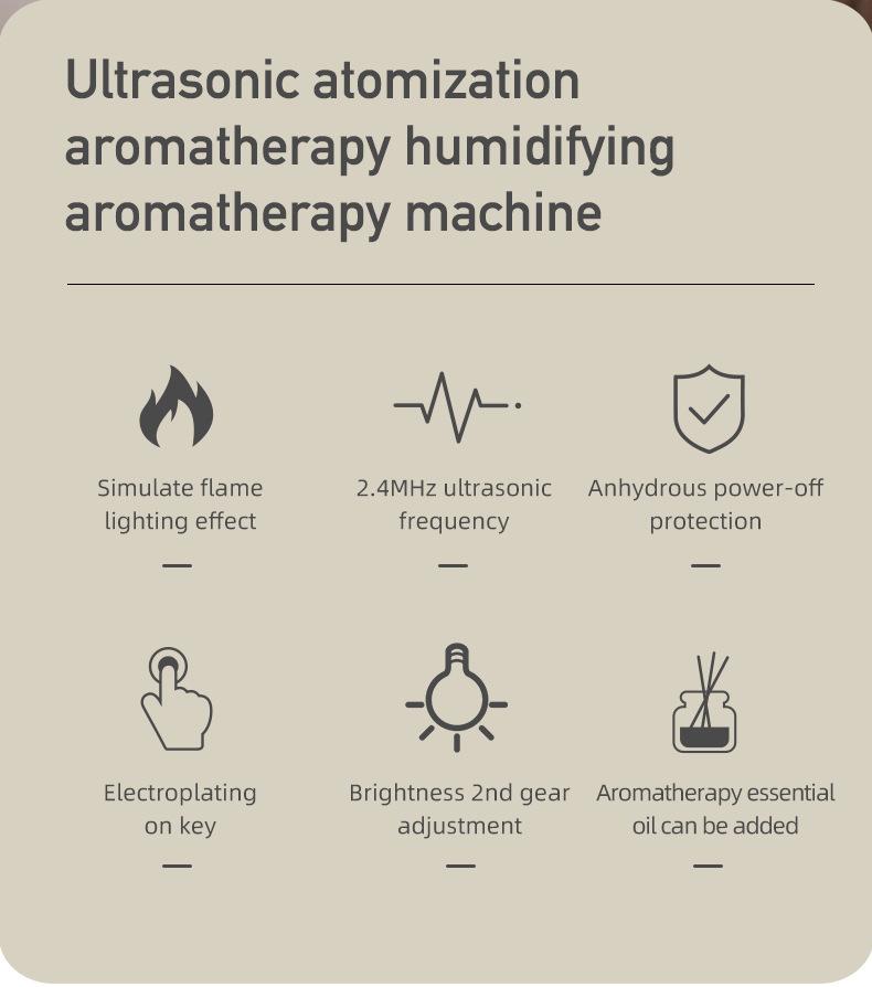 Puntos de venta del producto: efecto de luz de llama simulada; tanque de agua de material PP al que se puede añadir aceite esencial para aromaterapia por atomización; proceso de galvanoplastia de botones para resaltar la calidad; brillo de la luz de llama de dos niveles ajustable; chip inteligente incorporado, protección contra escasez de agua y corte de energía.