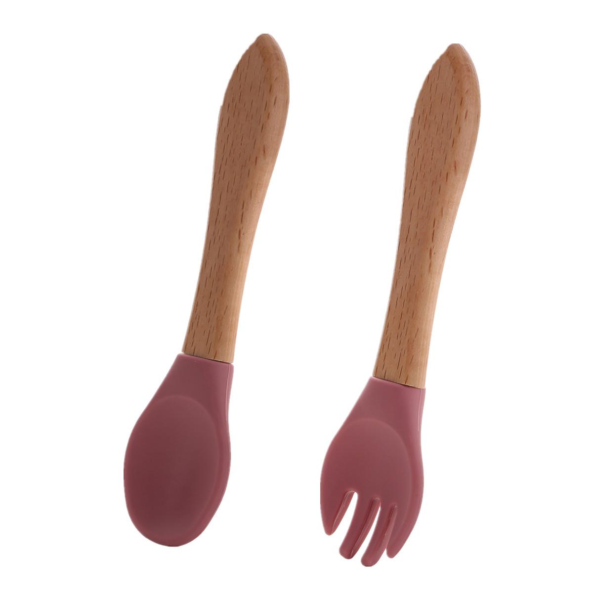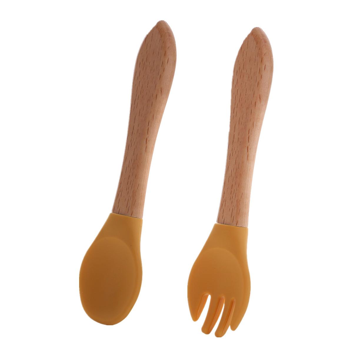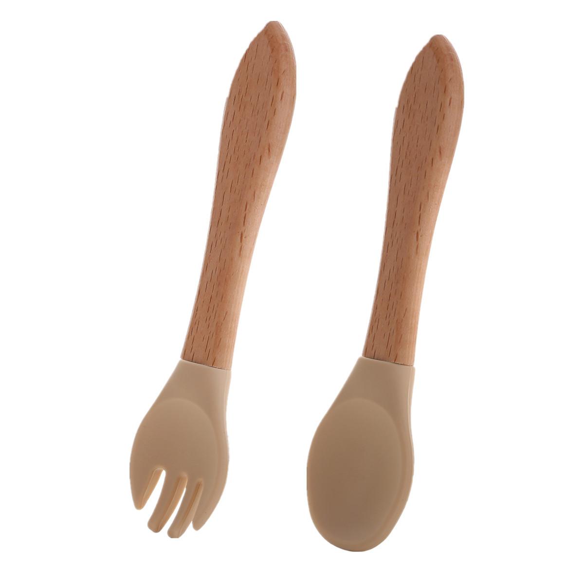 Cuchara de silicona con mango de madera para niños de grado alimenticio, tenedor, vajilla, cuchara de suplemento alimenticio para entrenamiento de bebés, cuchara de alimentación para bebés, tenedor
