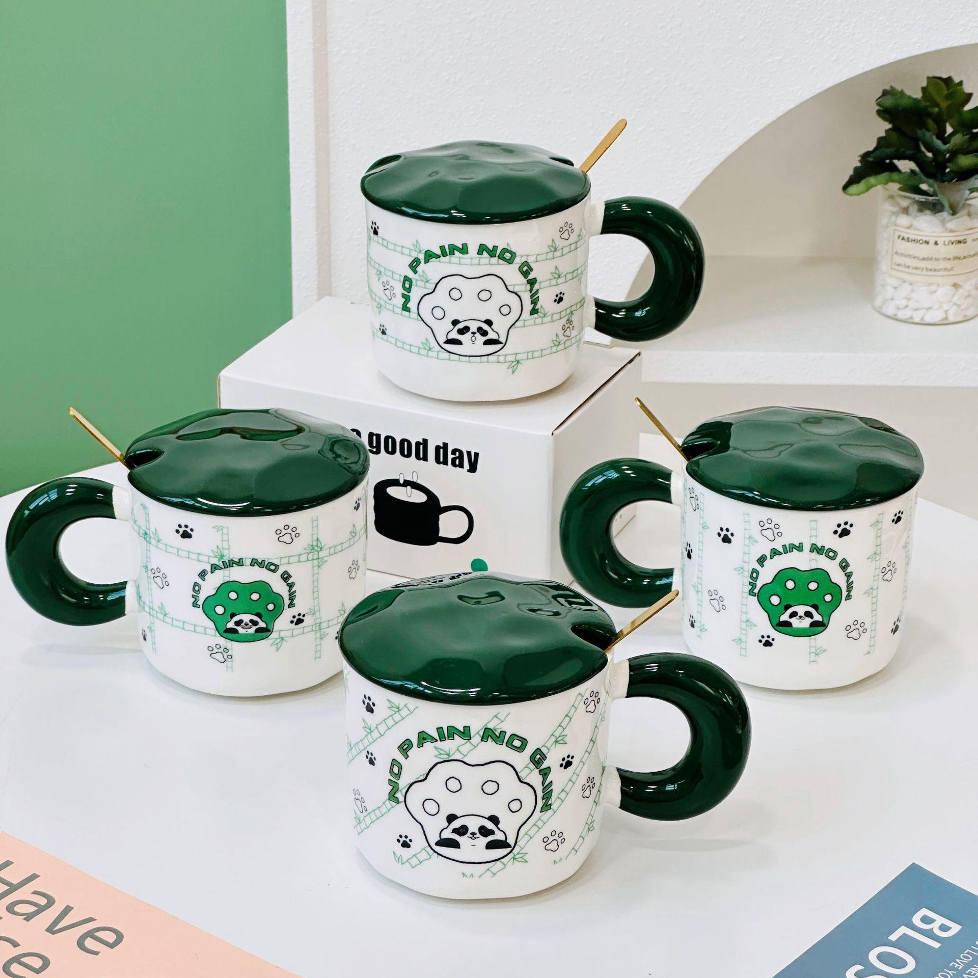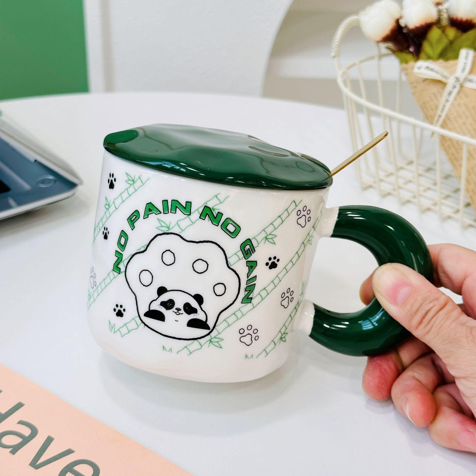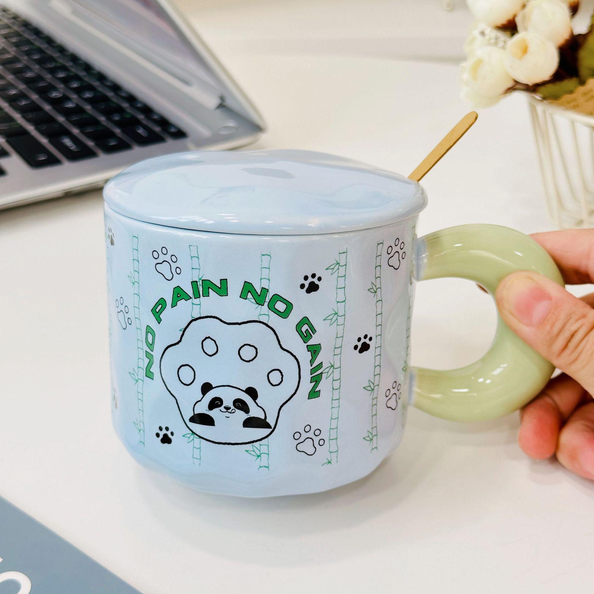 Oblique bamboo panda with lid spoon ceramic cup