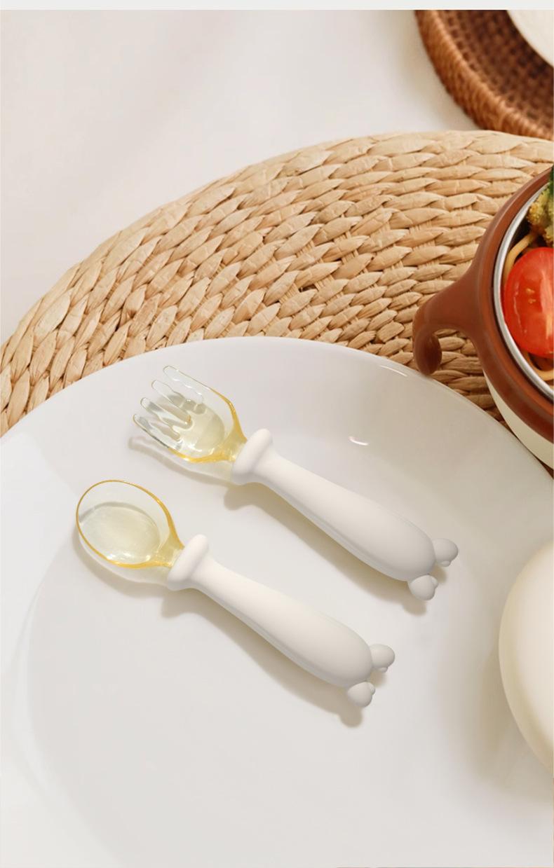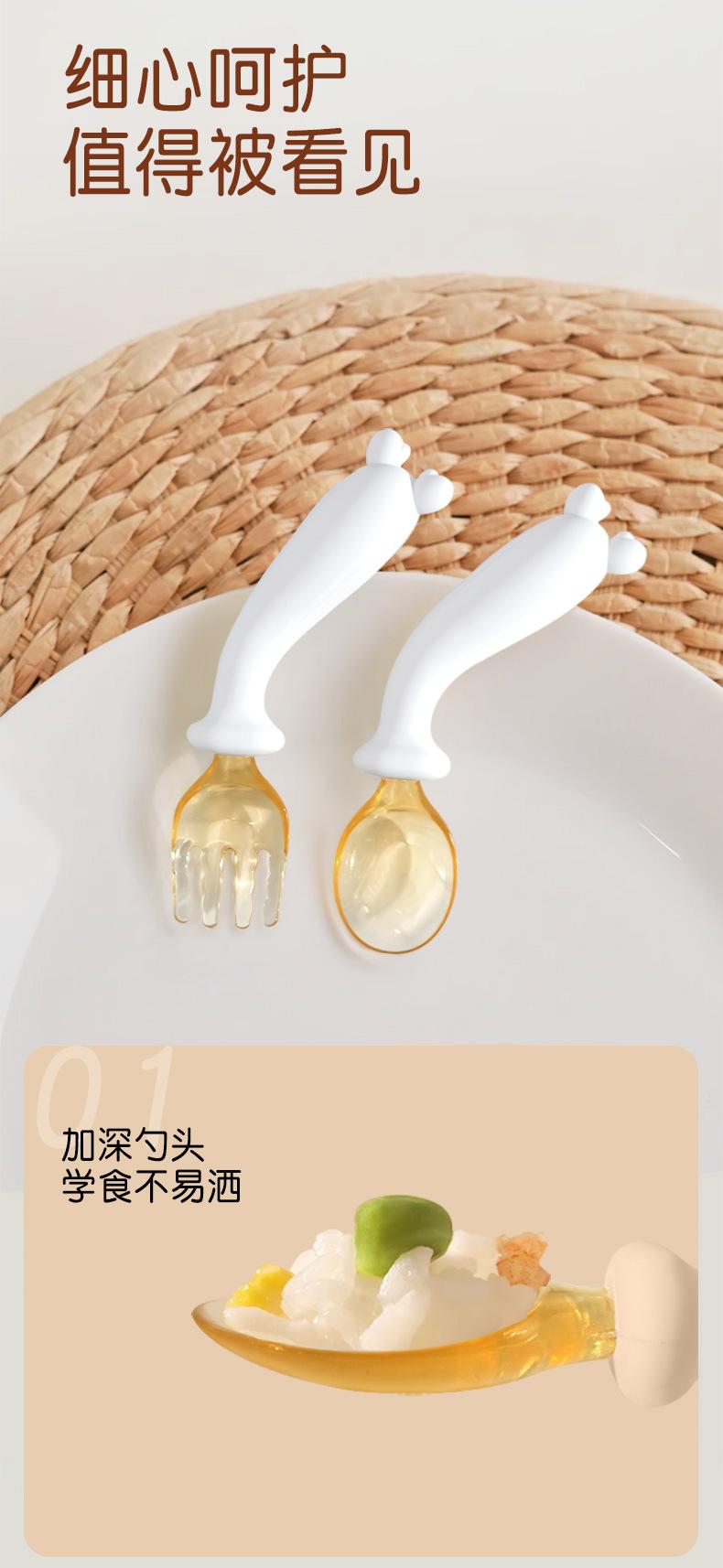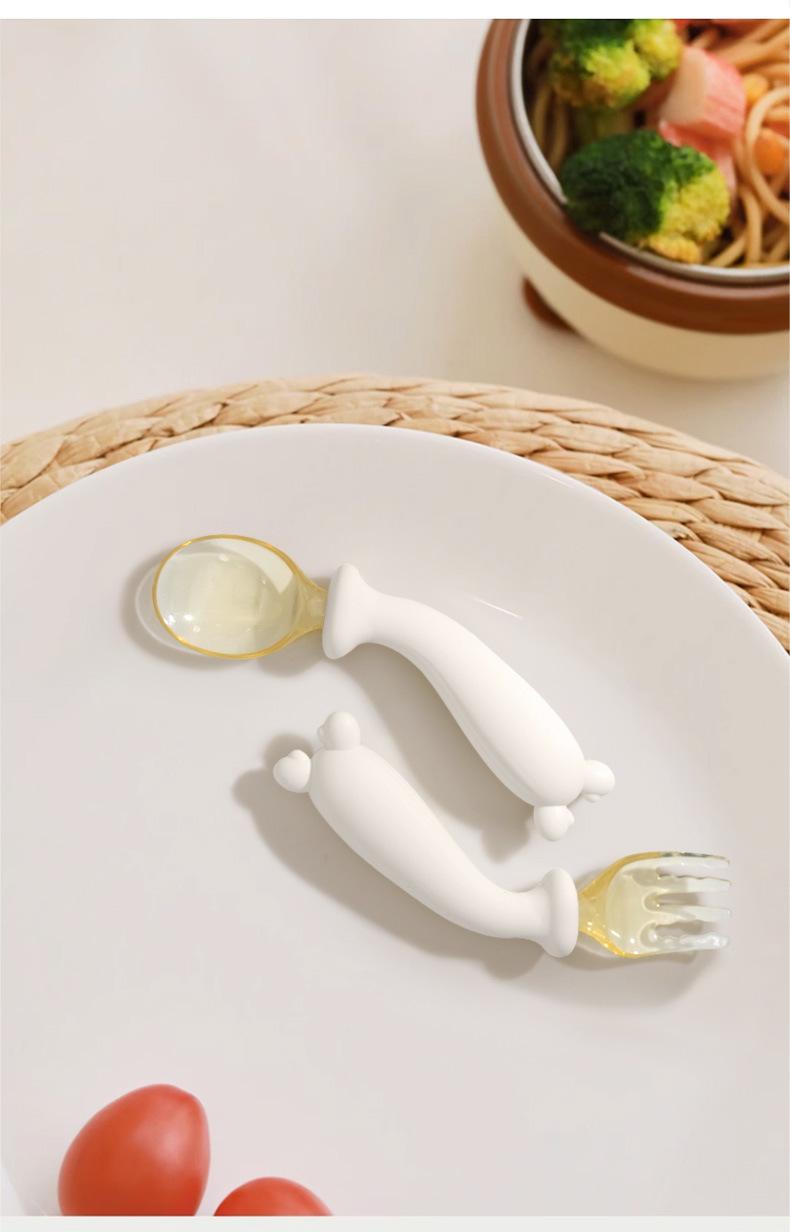 Nueva comida complementaria para bebés grado alimenticio ppsu tenedor cuchara resistente a altas temperaturas flexible silicona líquida cuchara giratoria fábrica mayoreo