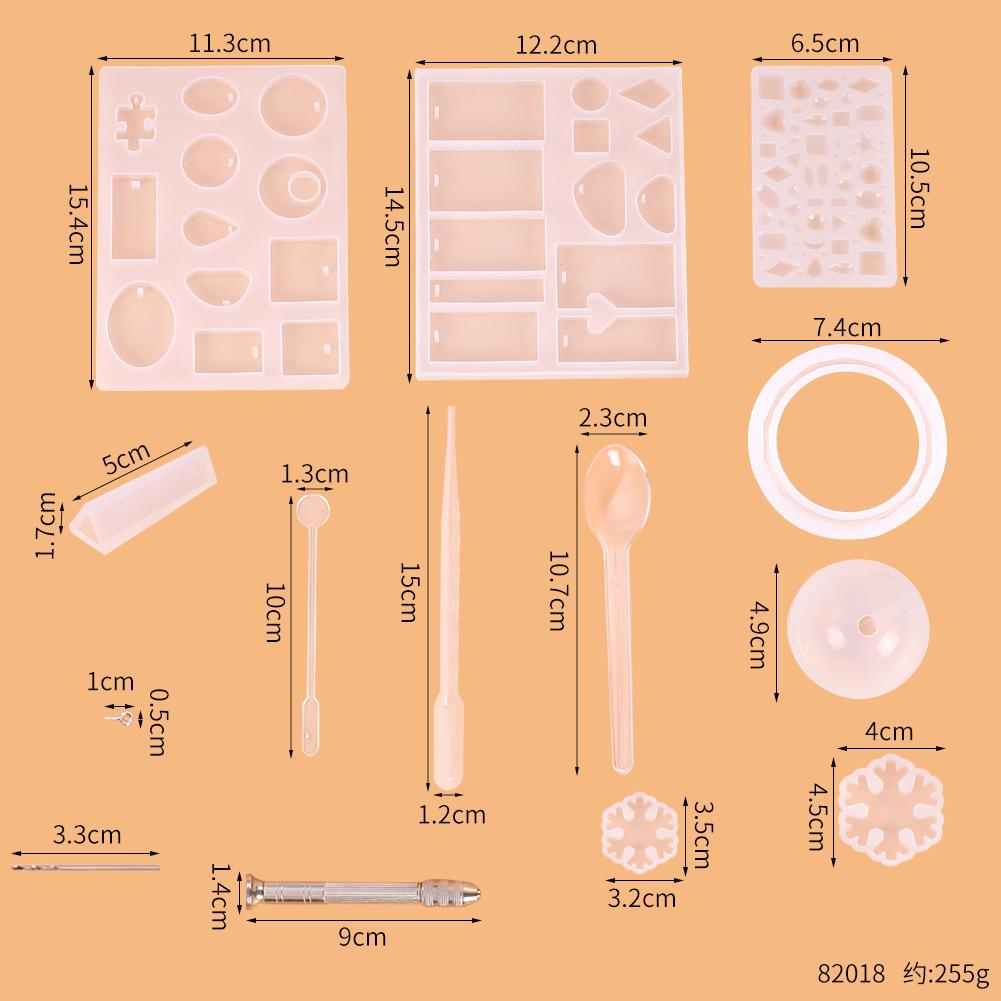 12 moldes de pegamento, 5 cucharas, 5 palitos para remover, 5 goteros, un agarre (50 cuernos dorados y plateados en dados), una broca 1.0Alrededor de 127