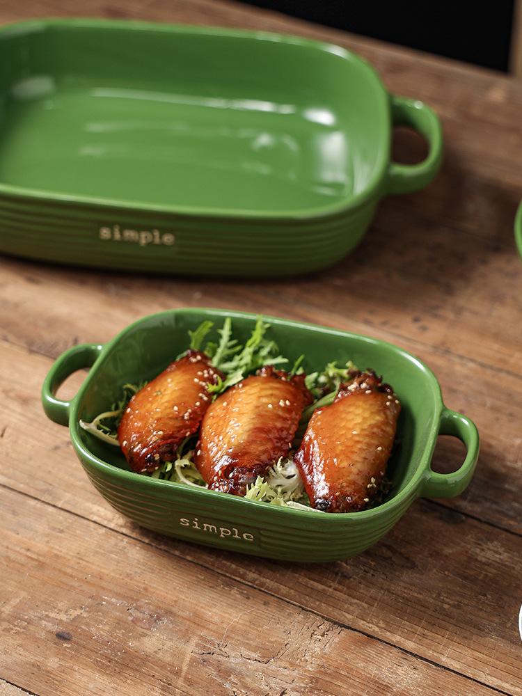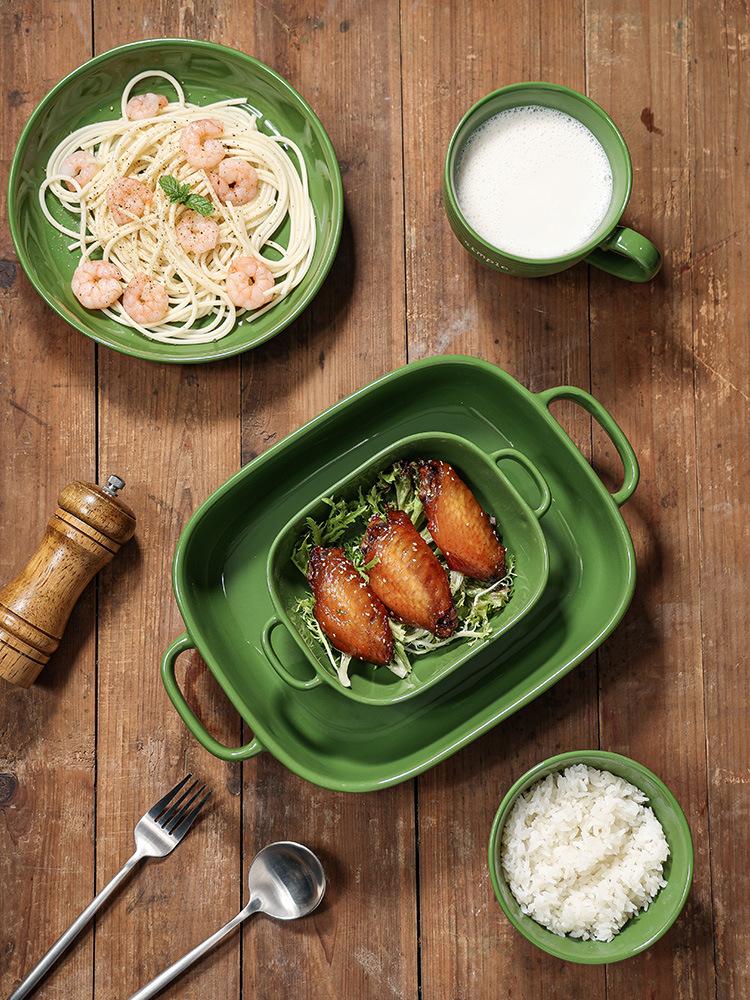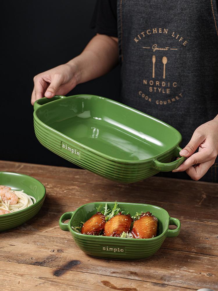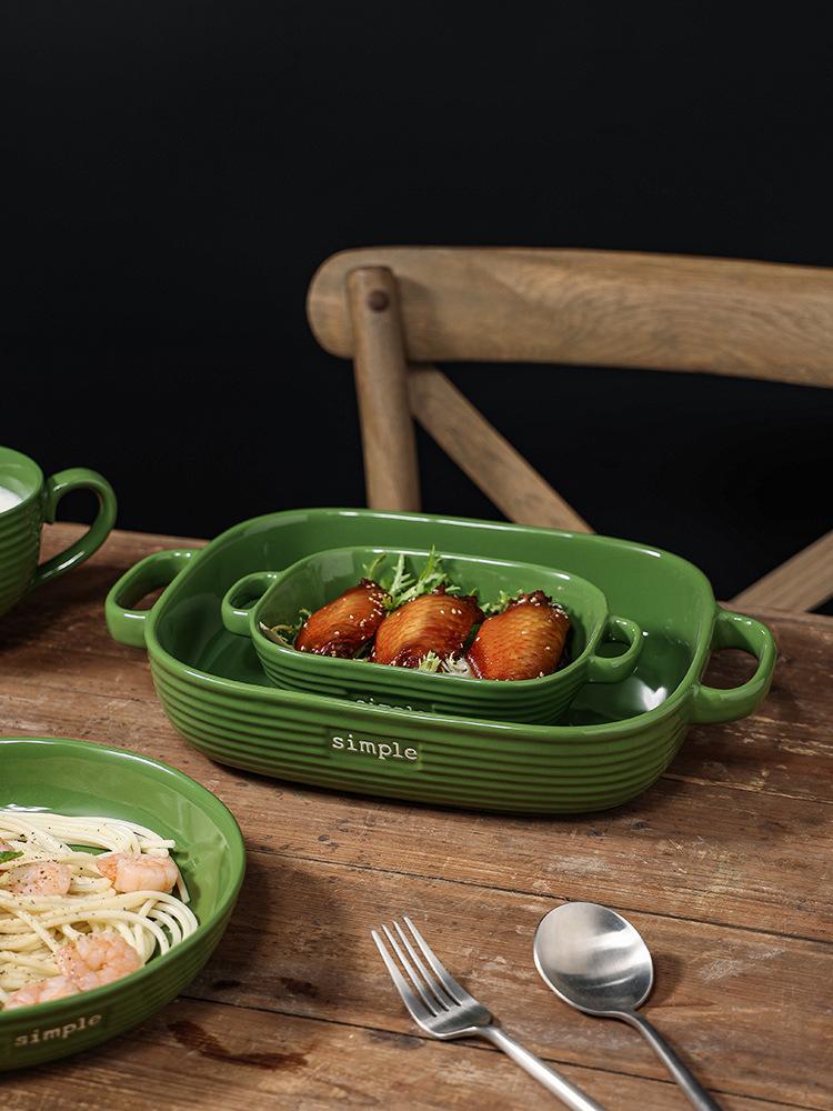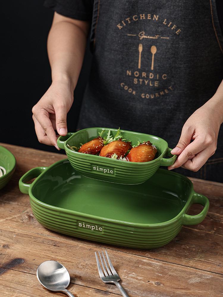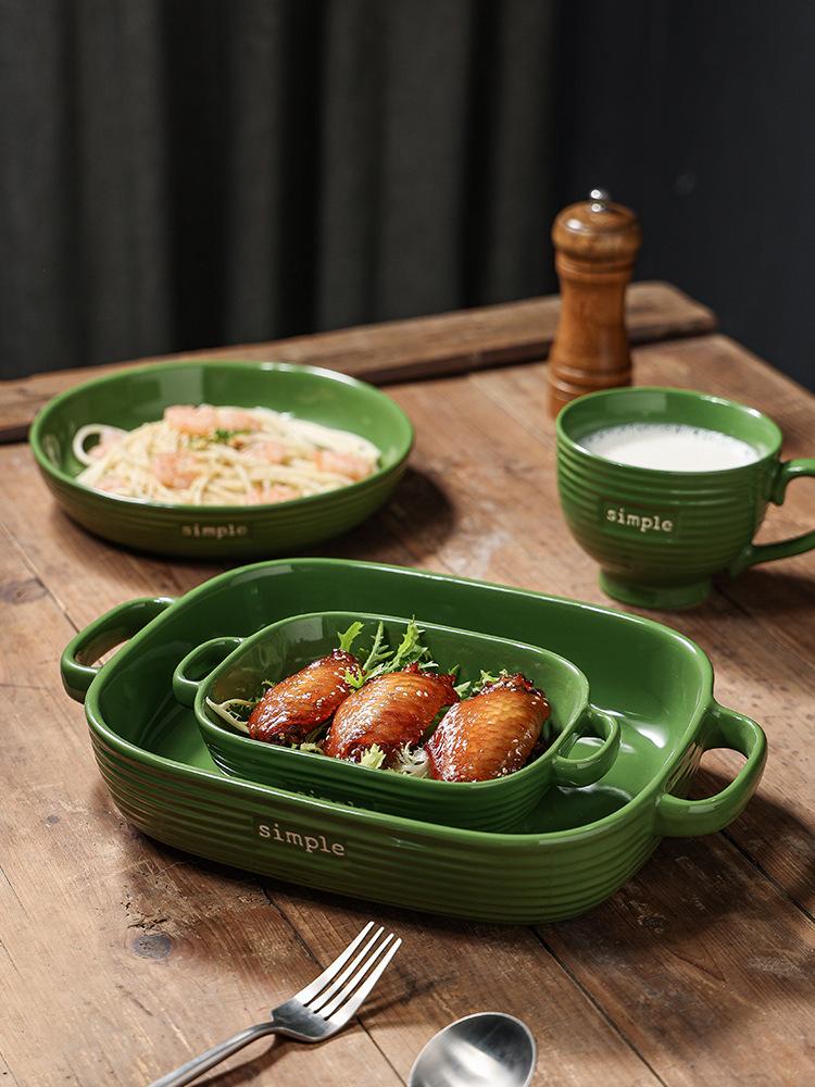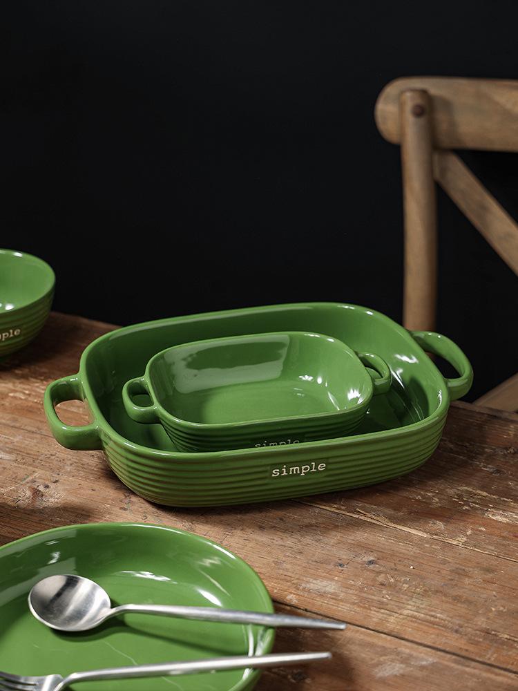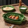 Plato de cena de cerámica creativo Huafu, rectangular, binaural, para horno doméstico, sopa, ensalada, color verde oscuro