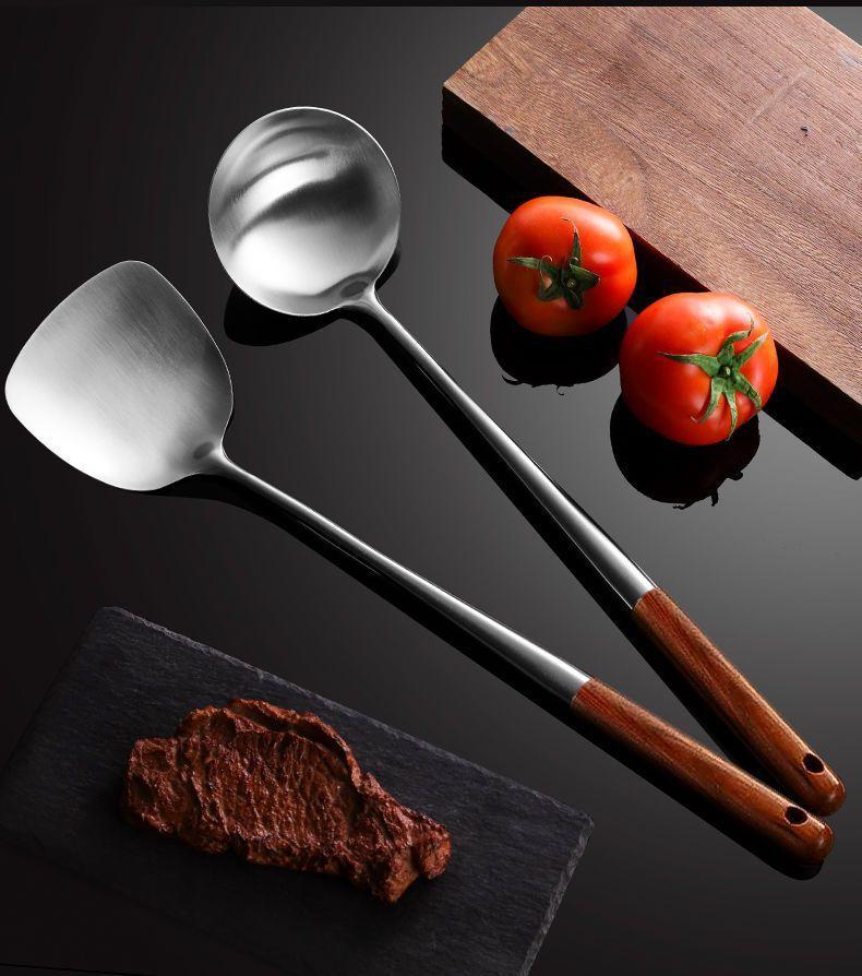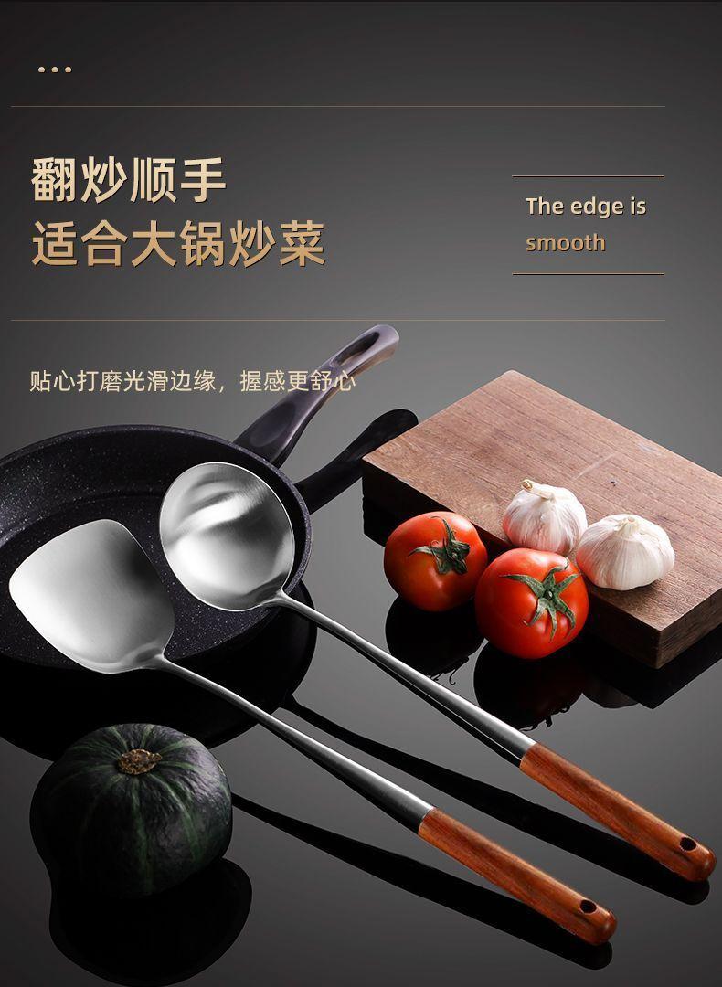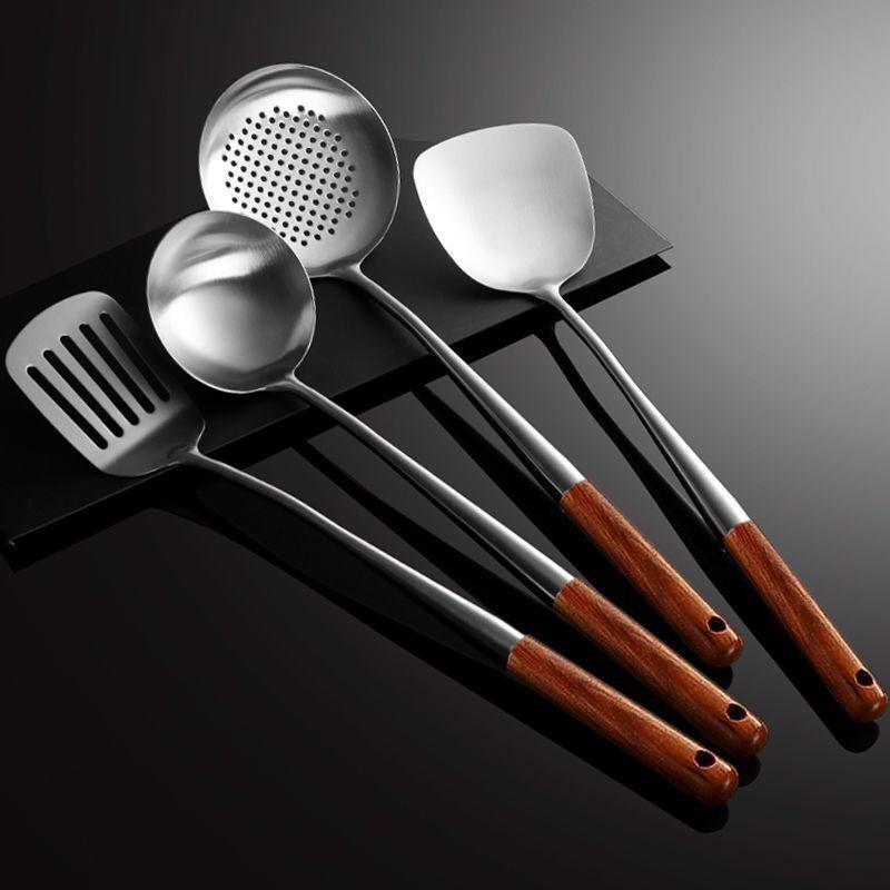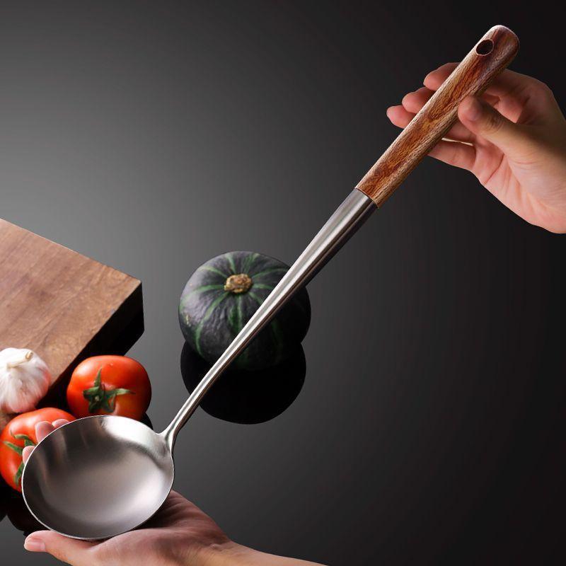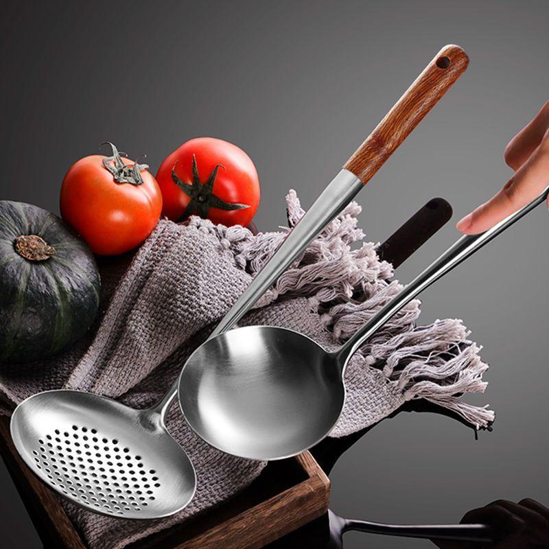 Cuchara de Cocina Especial para Chef de Acero Inoxidable Colador Mango de Madera Cuchara para Cocinar Espátula Acero Inoxidable para el Hogar Engrosado Mango Largo Utensilios de Cocina