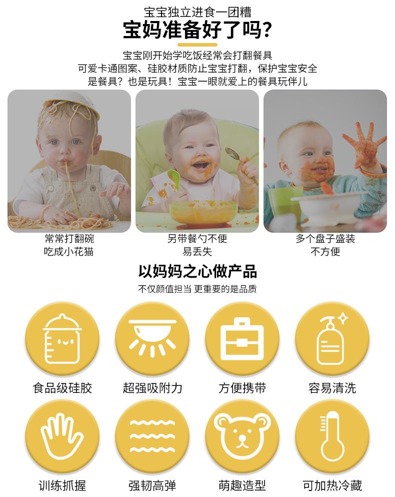 【Características】:1. El producto tiene una forma linda y colores brillantes, lo que puede aumentar el apetito del bebé, y es asequible y fácil de limpiar;