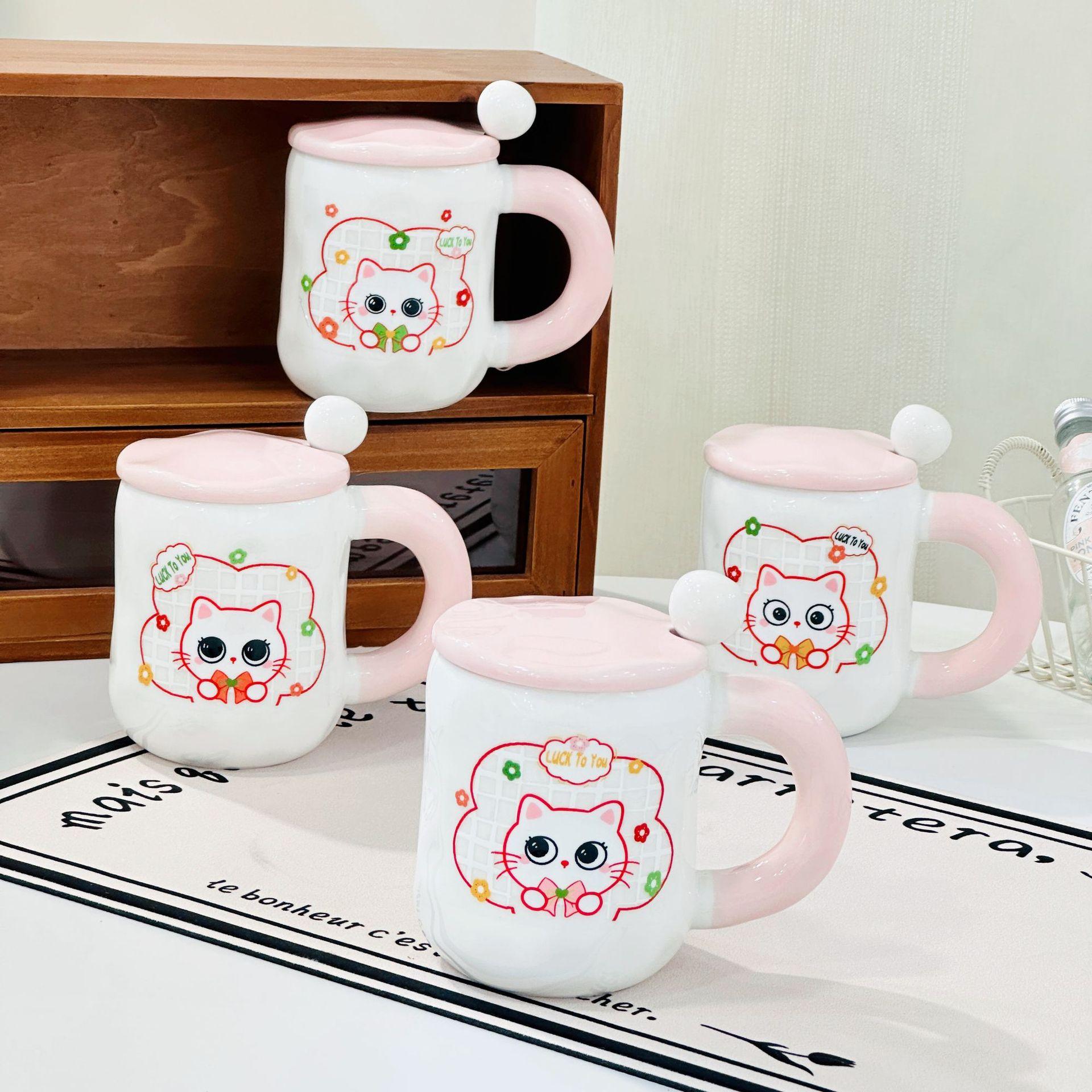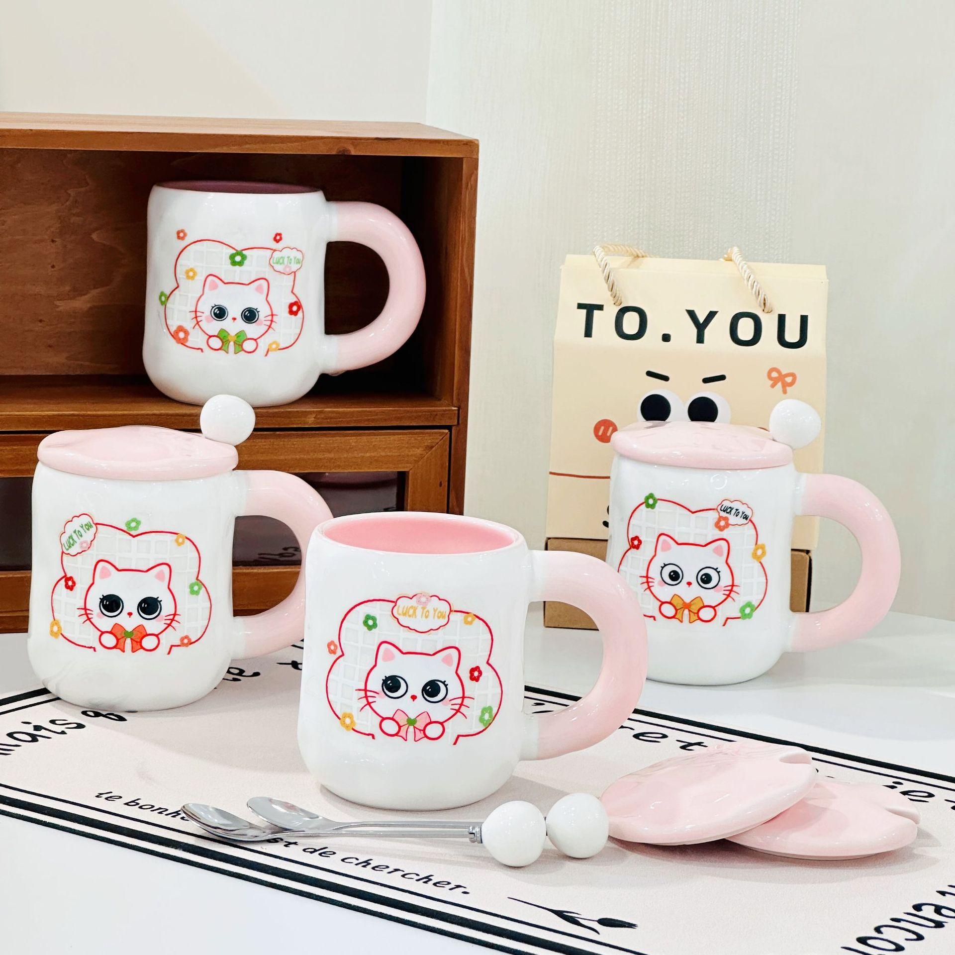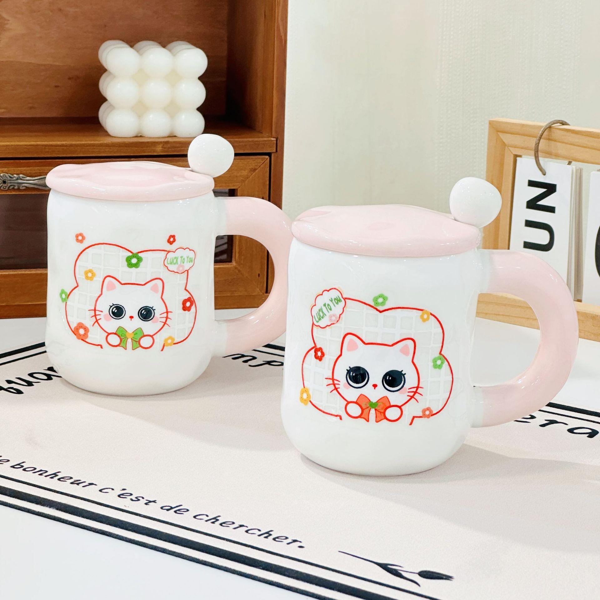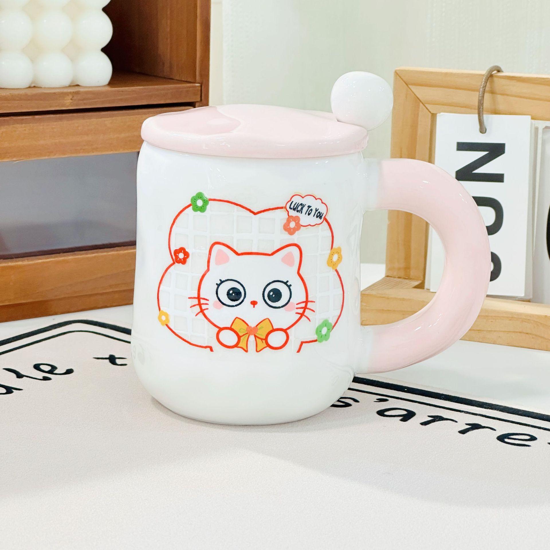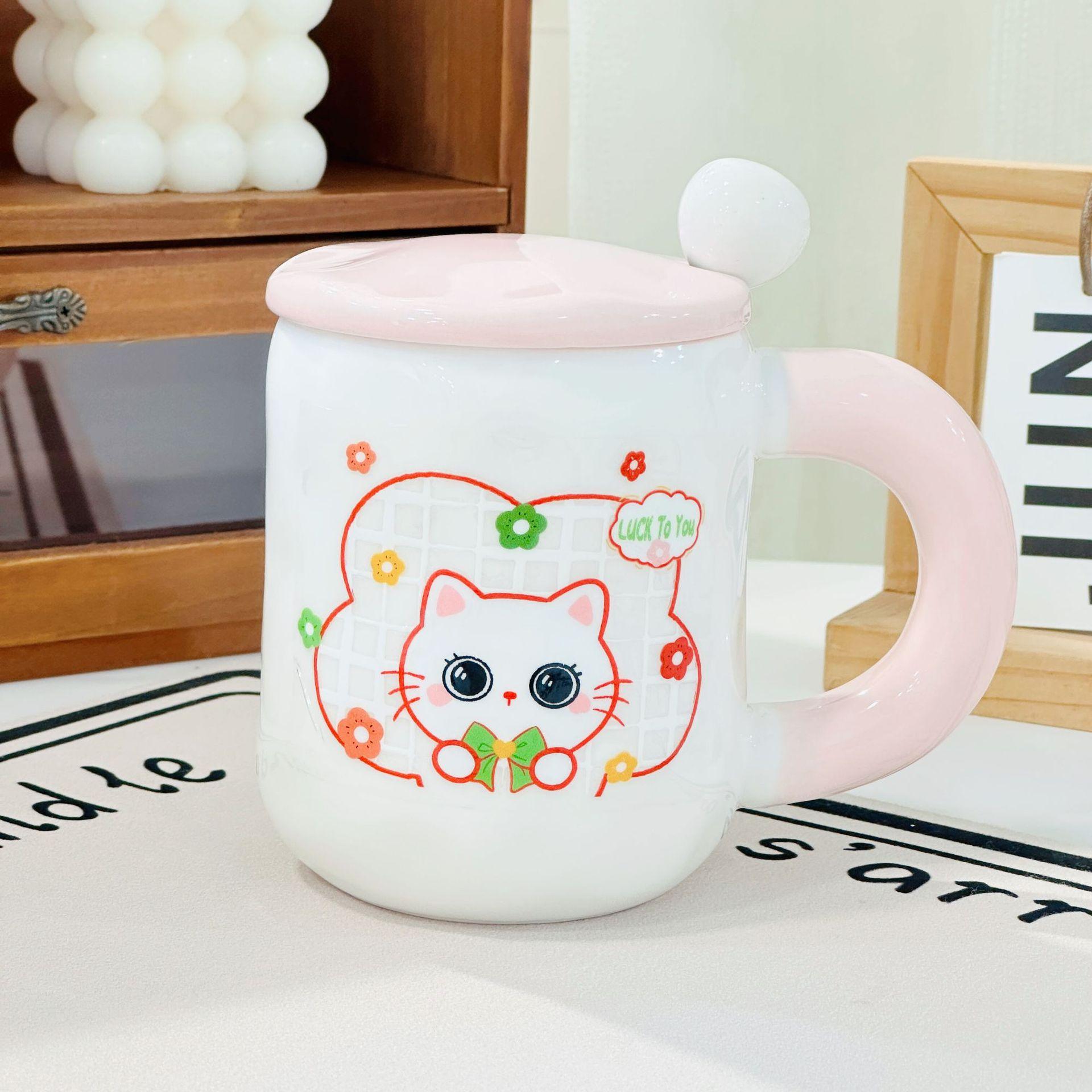 Taza de cerámica con forma de gatito con tapa y cuchara, linda taza de dibujos animados, color alto, gran capacidad, taza de agua para estudiantes
