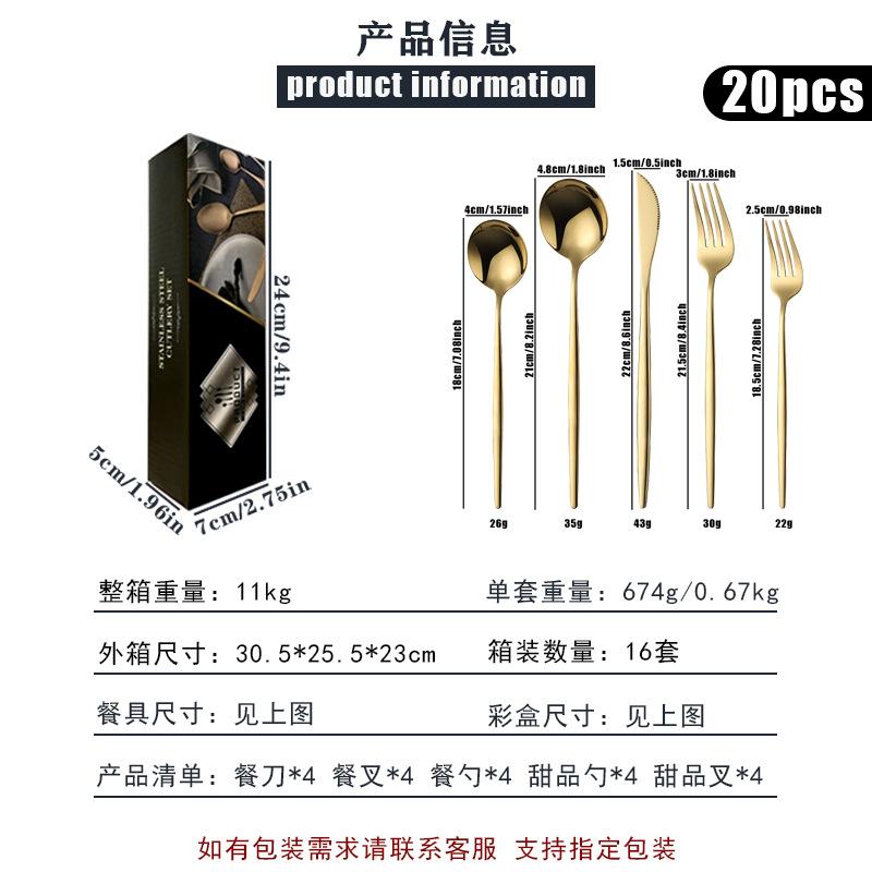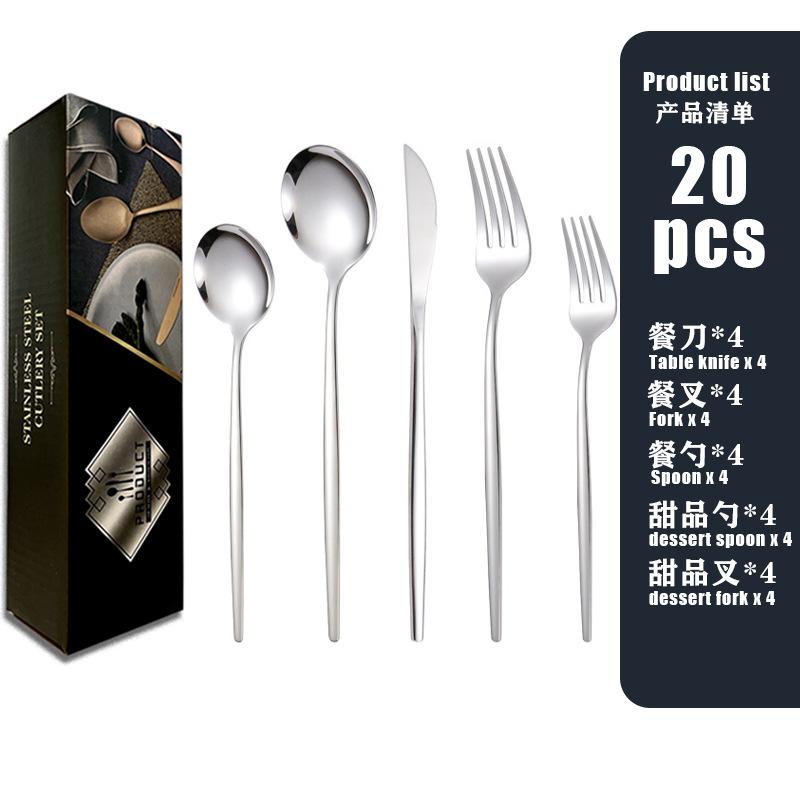 Vajilla de acero inoxidable de 20 piezas de Amazon transfronteriza, ideal para llevar al estilo occidental, con cuchillo, tenedor y cuchara, y caja de regalo para suministros de hotel.
