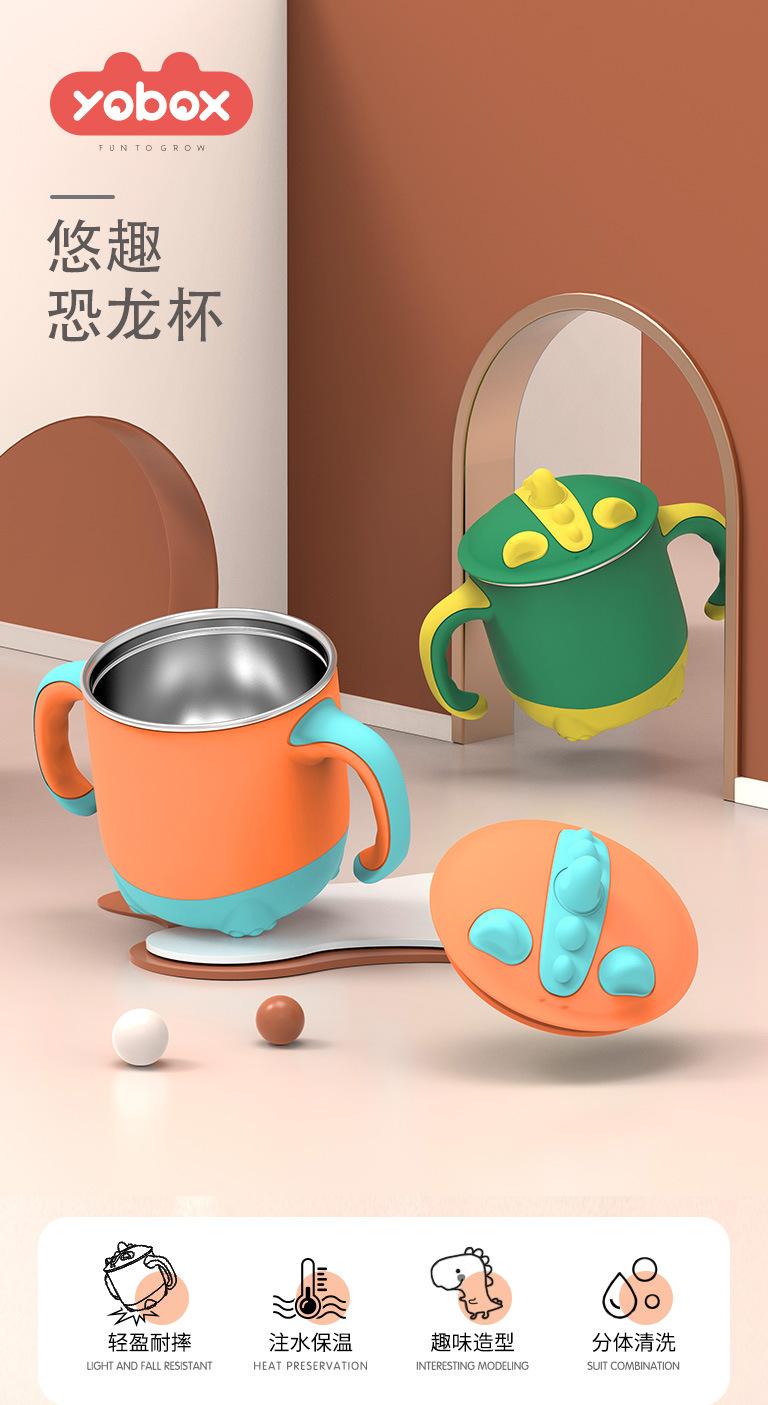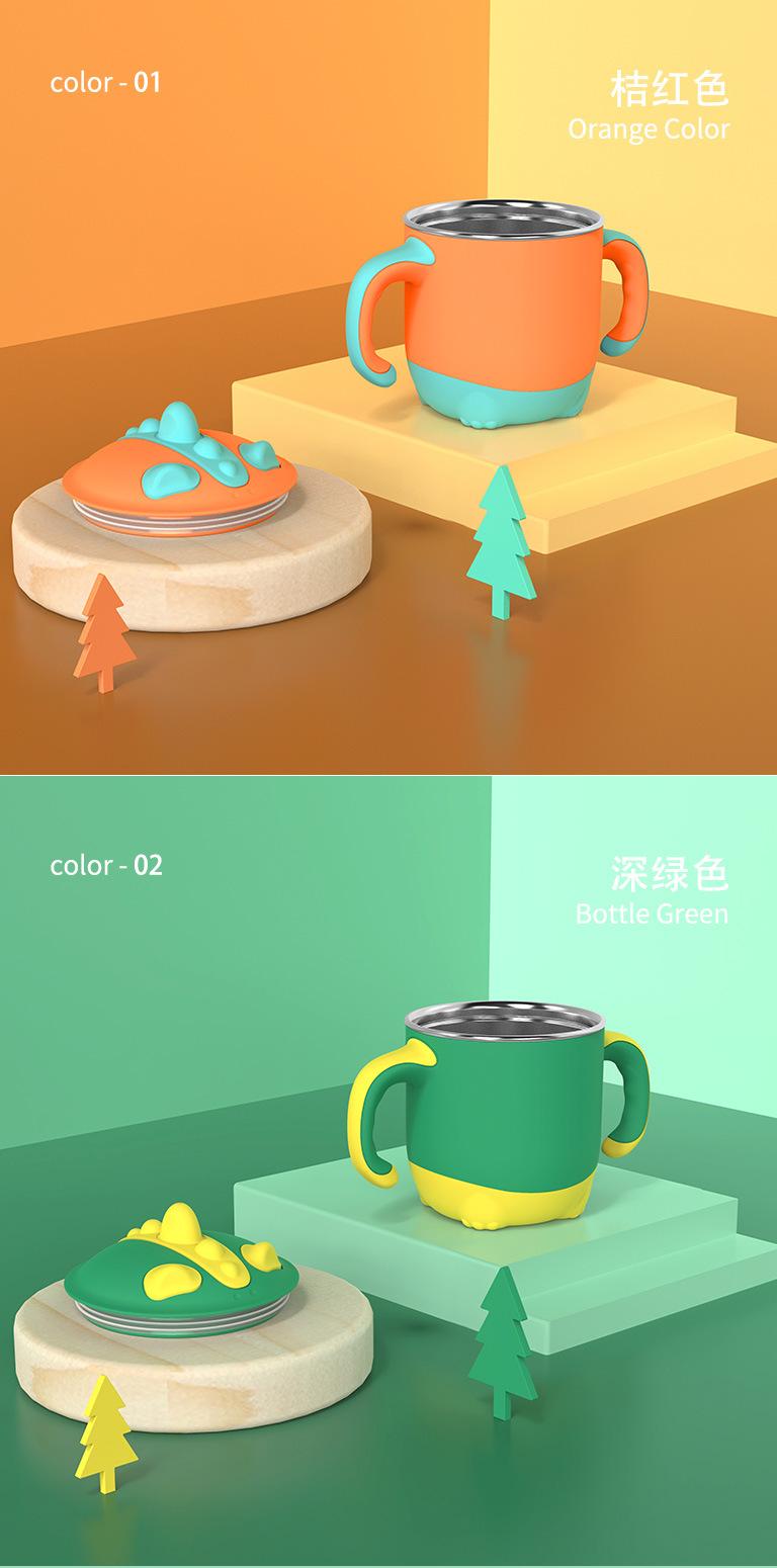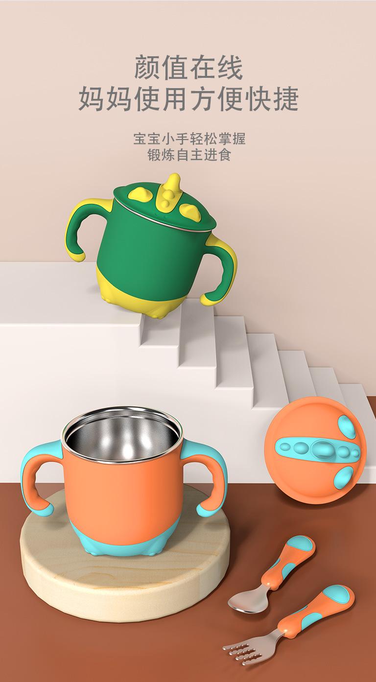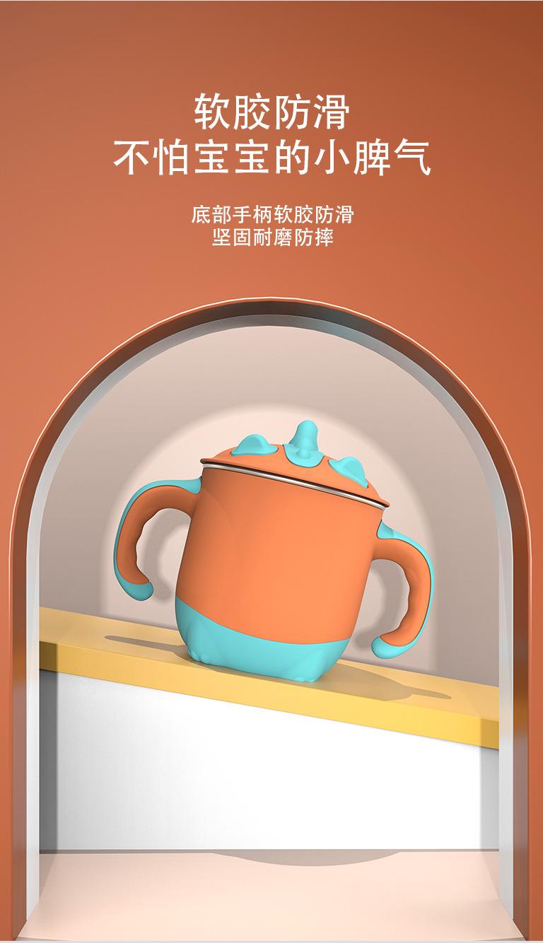 Taza de leche con aislamiento para niños de acero inoxidable 304, taza de doble oreja para bebé, taza de silicona para beber con asa de dinosaurio para bebés