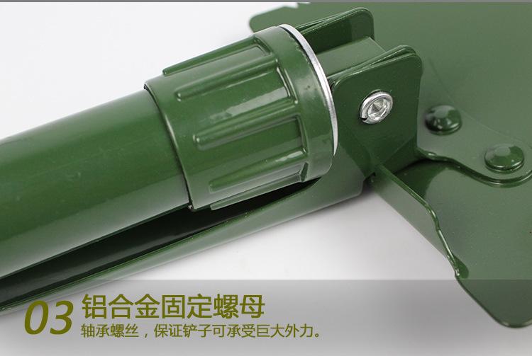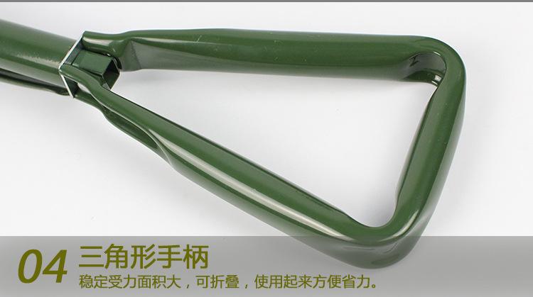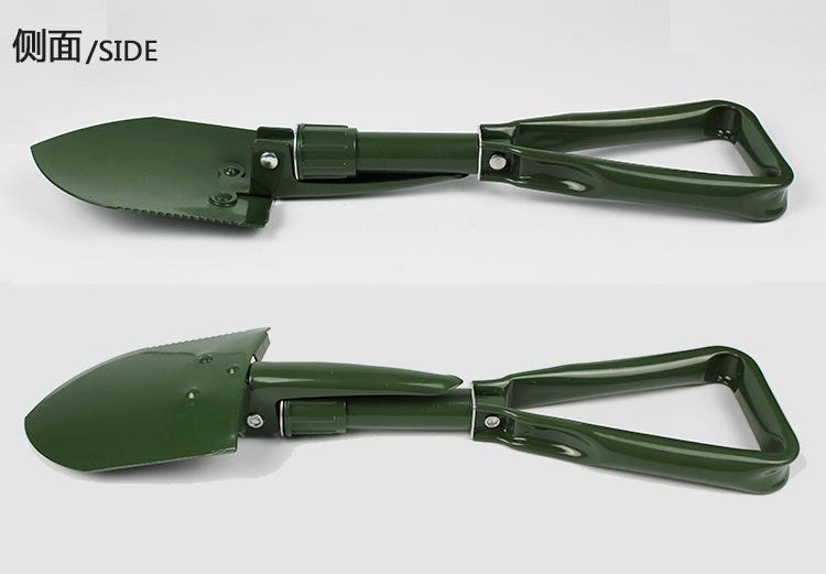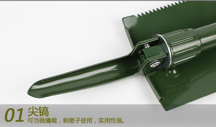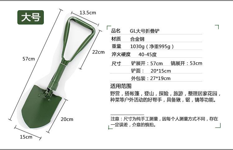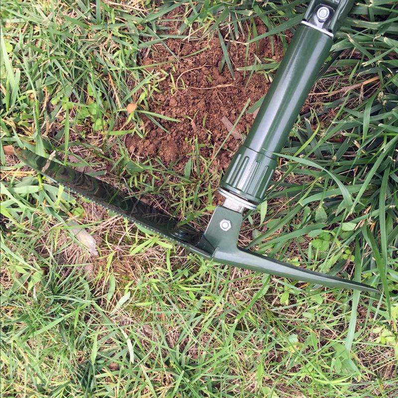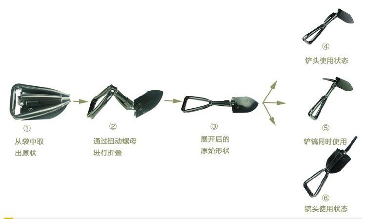 Características: Plegable, de tamaño pequeño, fácil de transportar. Cuando se despliega, un extremo es una pala y el otro extremo es un pico. Es flexible y plegable, y el mango puede ser horizontal o vertical.