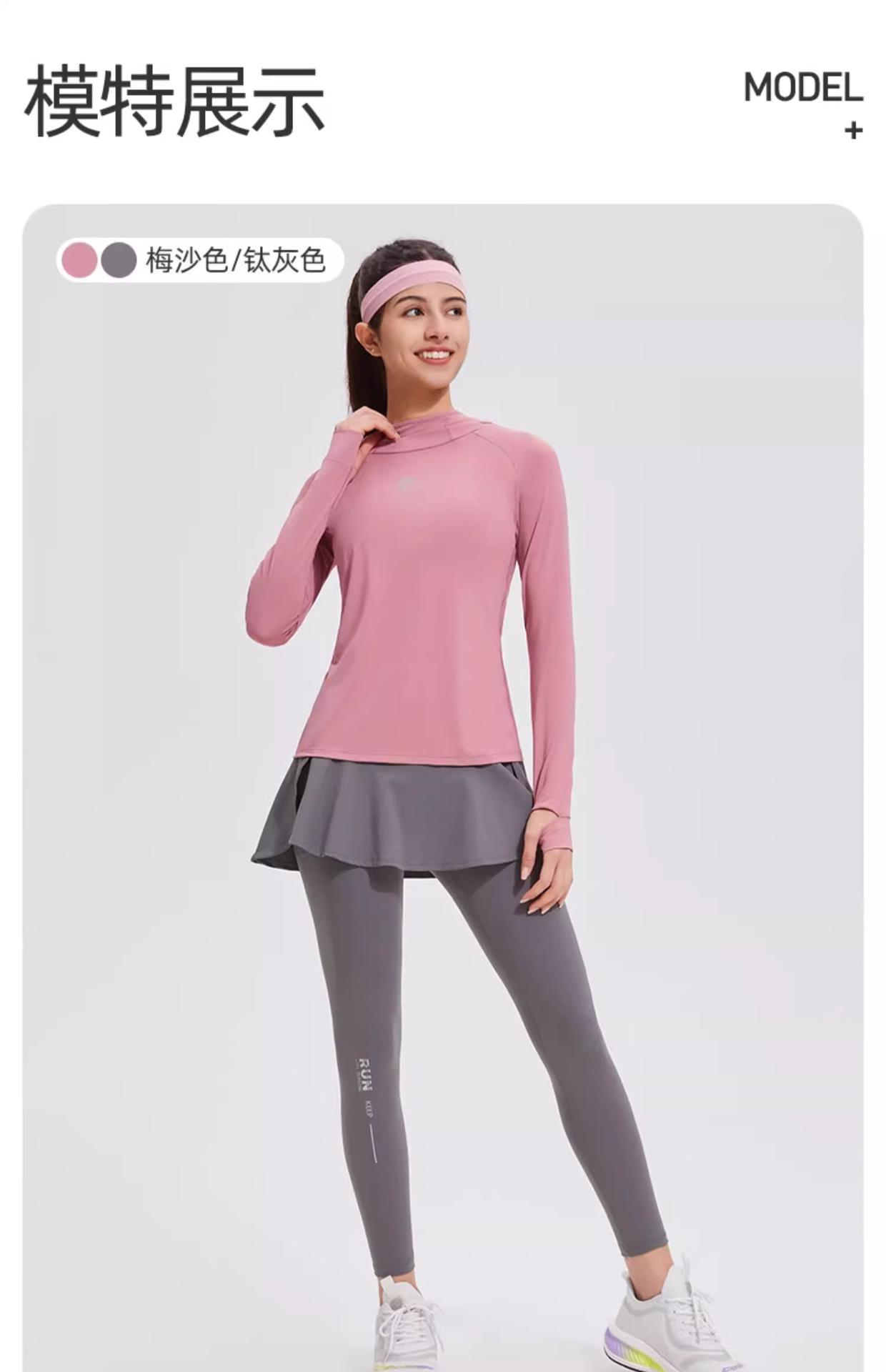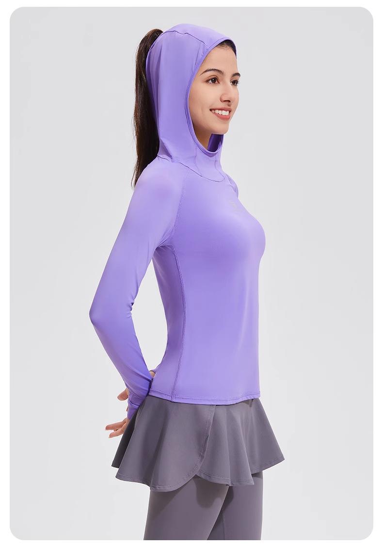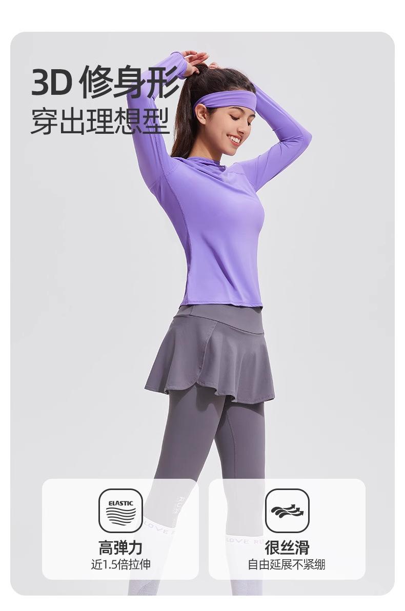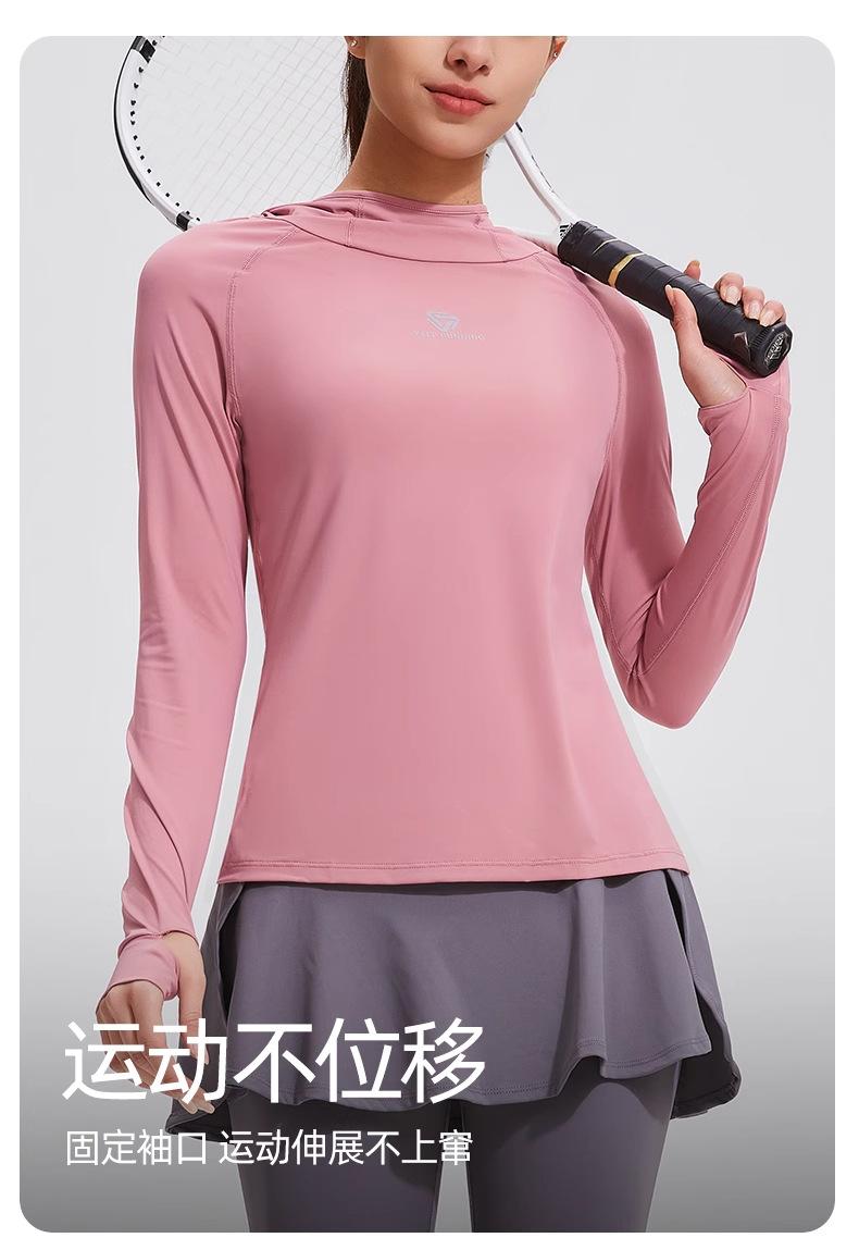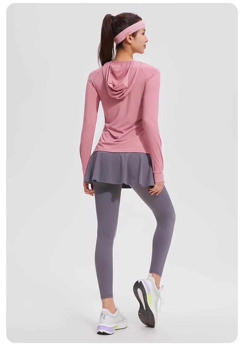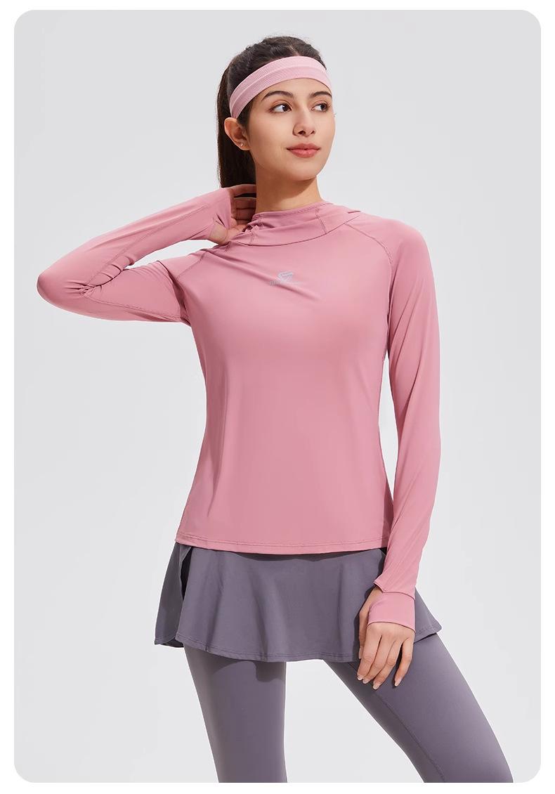Traje de yoga con protección solar de manga larga para mujer, con capucha, corte ajustado, top deportivo profesional para exteriores, secado rápido, para correr y fitness.