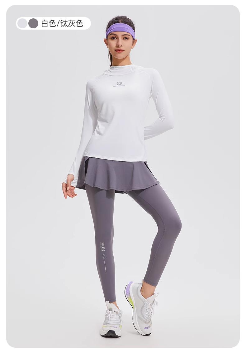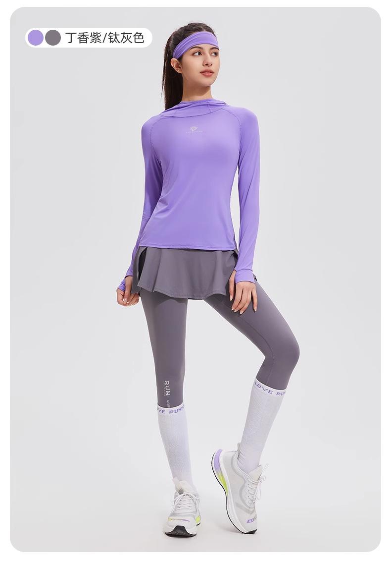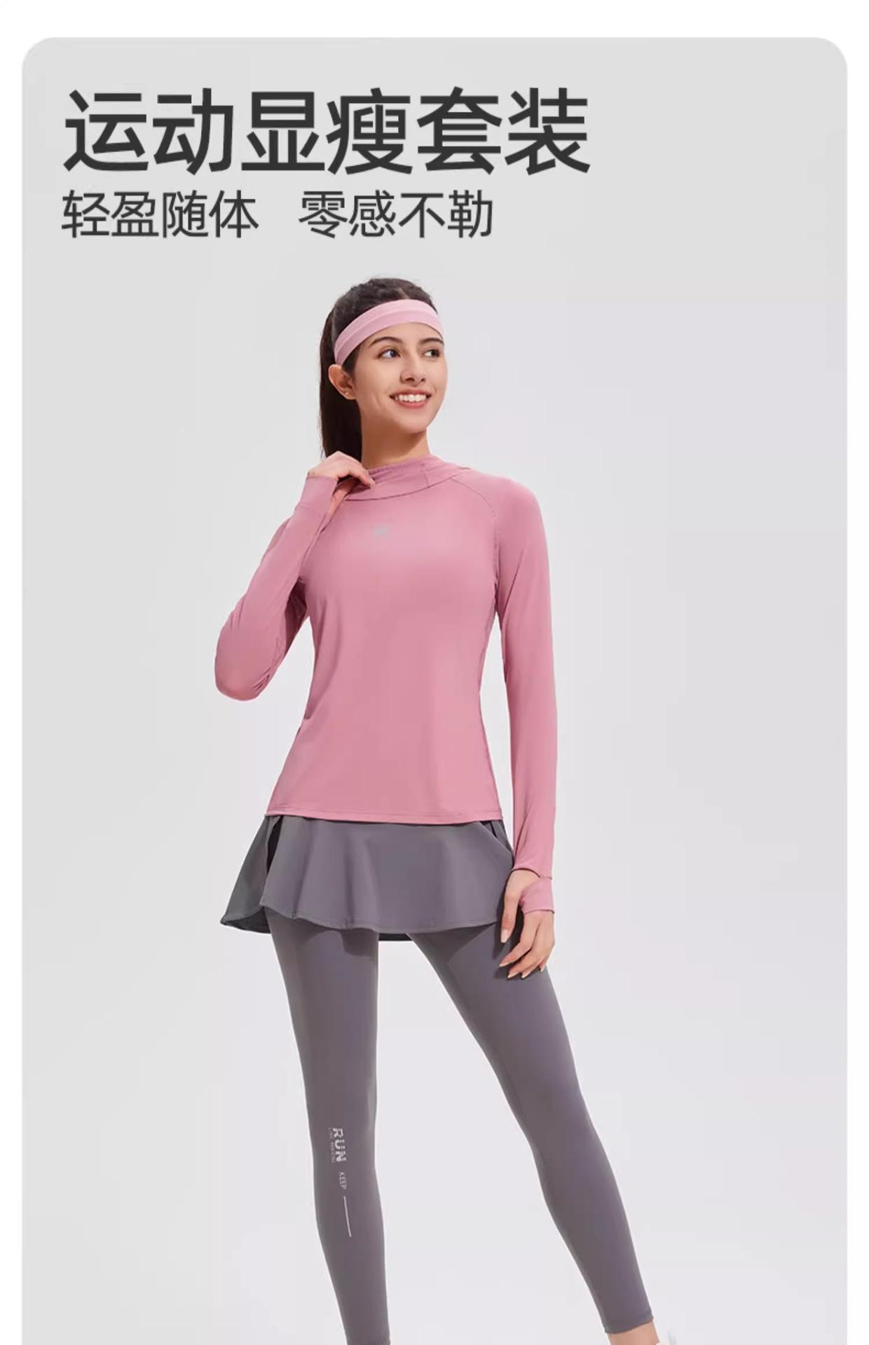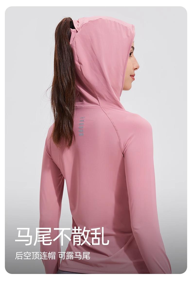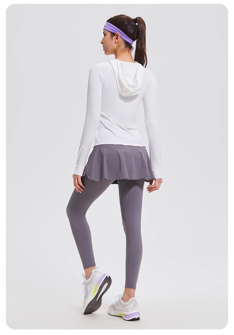 Traje de yoga con protección solar de manga larga para mujer, con capucha, corte ajustado, top deportivo profesional para exteriores, secado rápido, para correr y fitness.