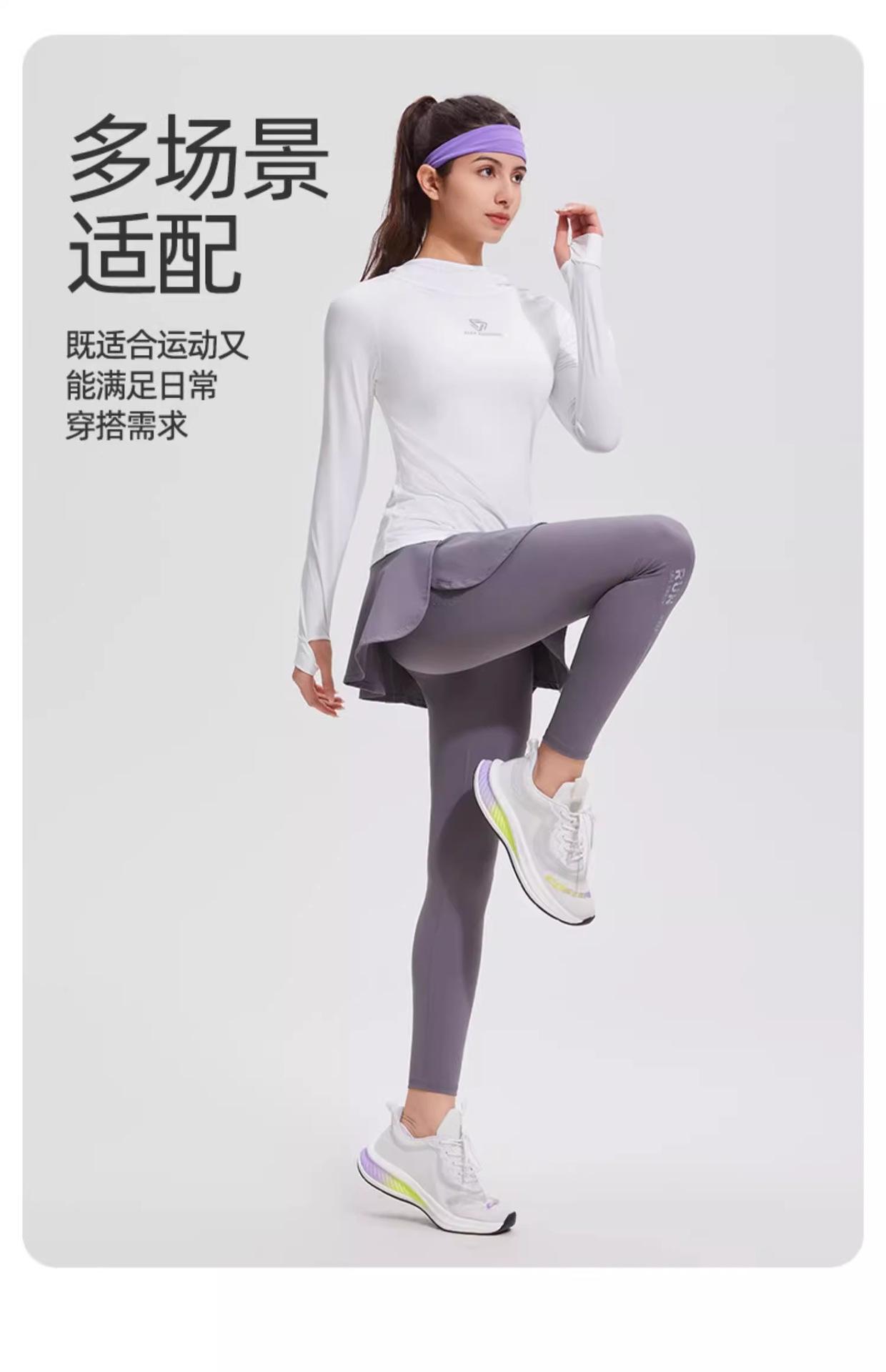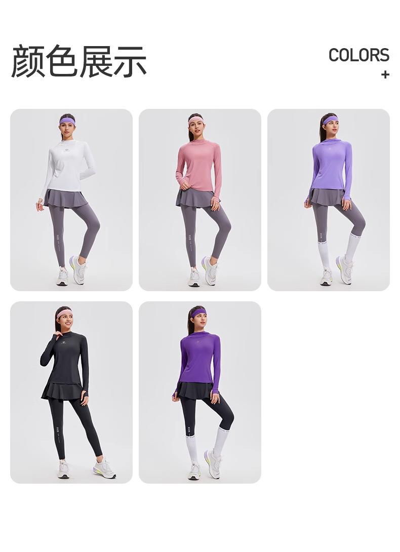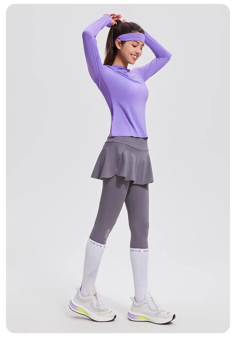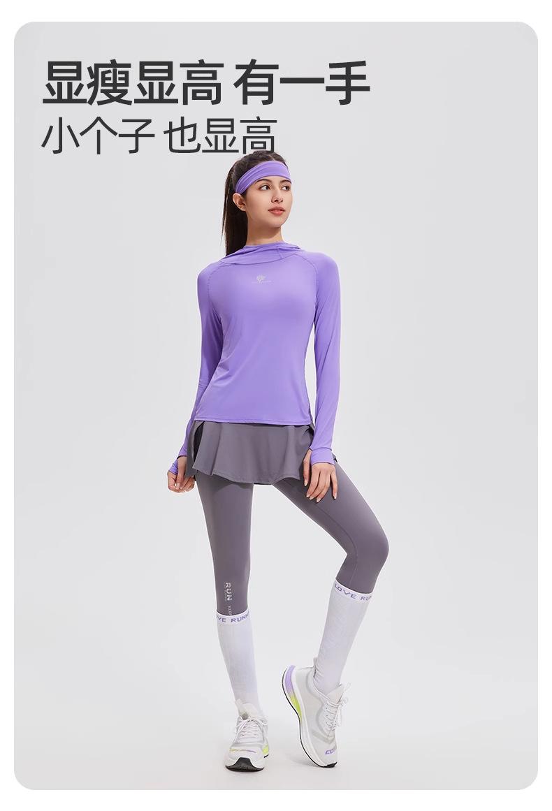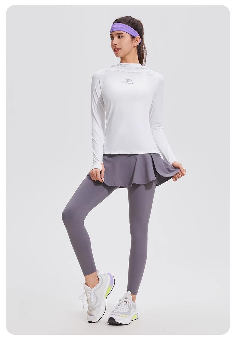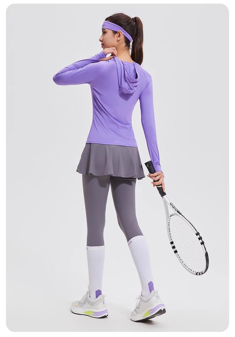 Traje de yoga con protección solar de manga larga para mujer, con capucha, corte ajustado, top deportivo profesional para exteriores, secado rápido, para correr y fitness.