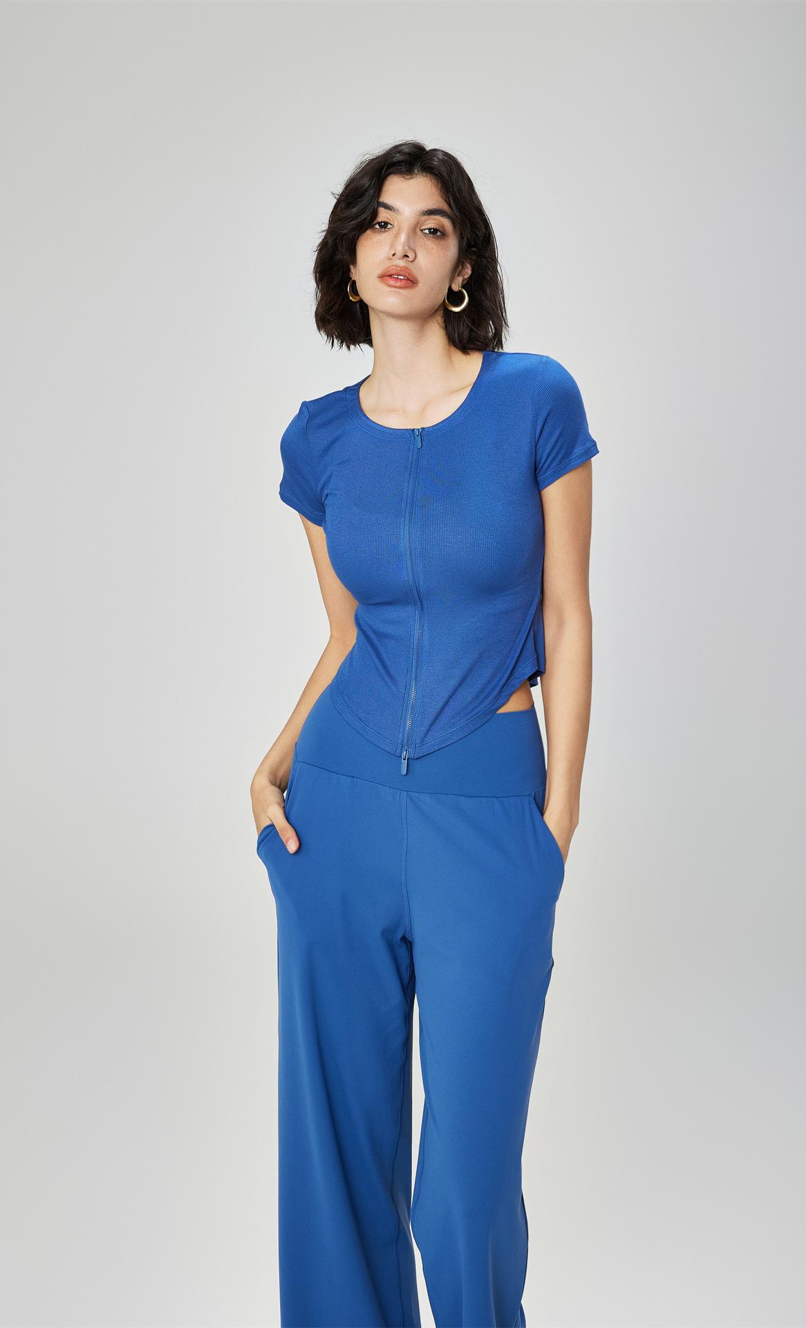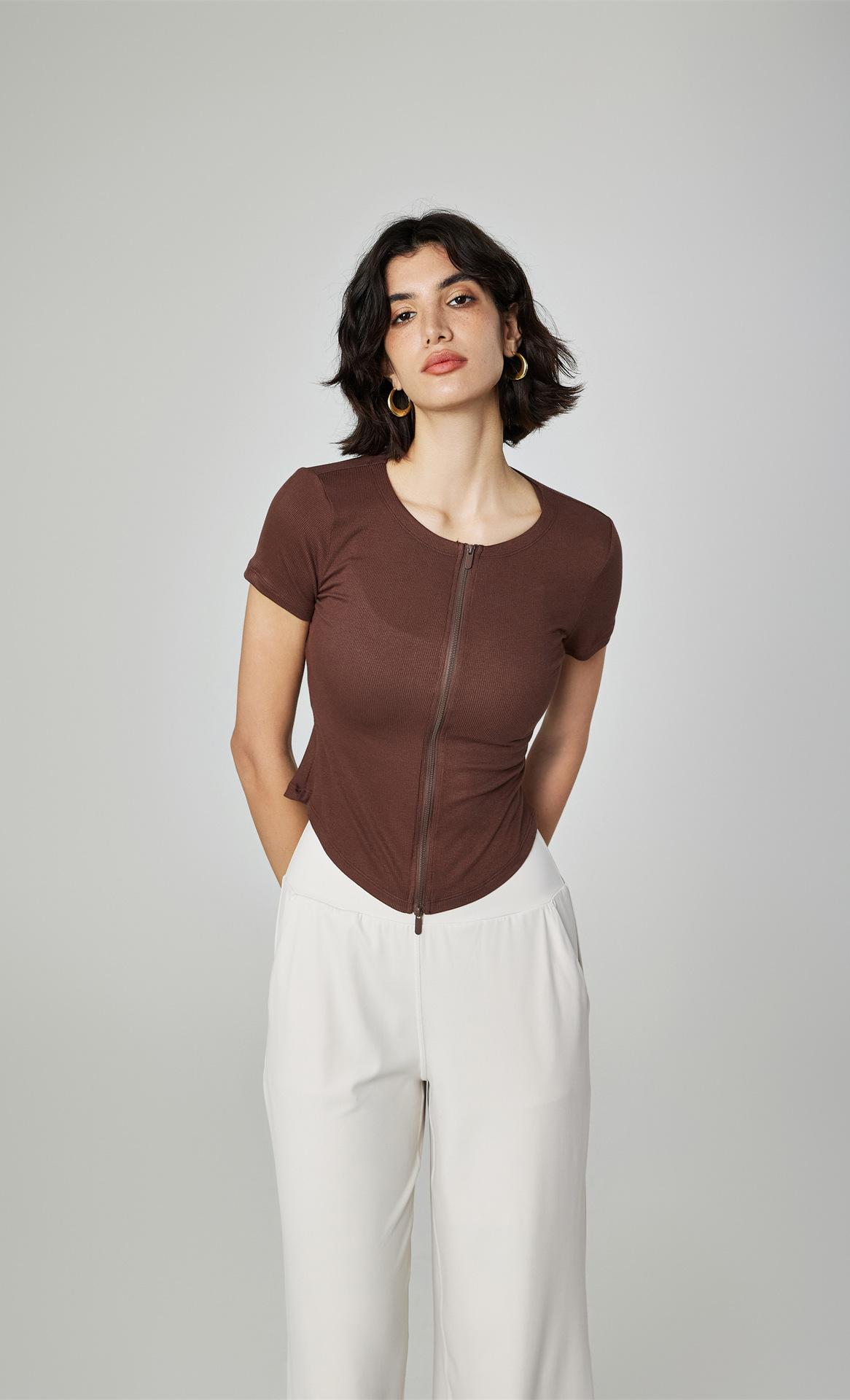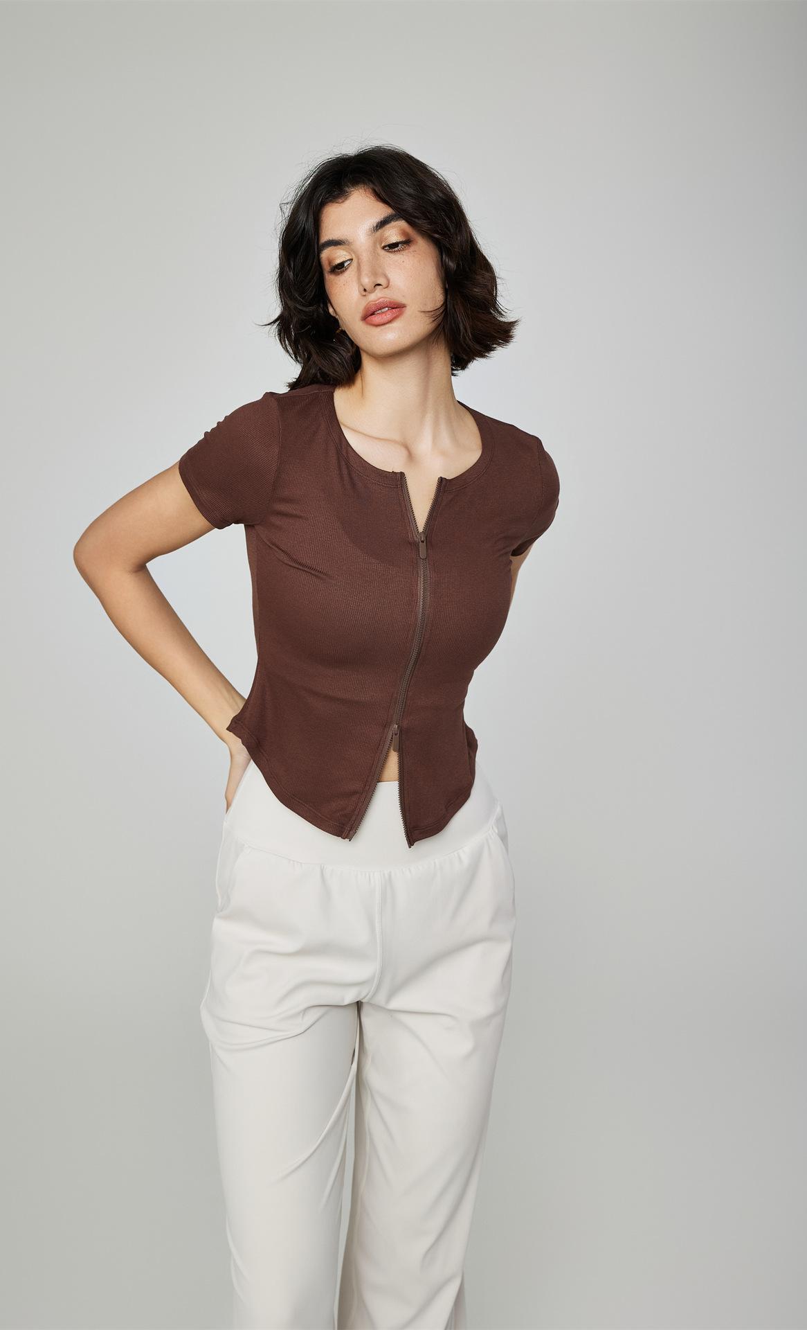 Traje de Yoga Nuevo de Primavera y Verano con Doble Cremallera para Mujer, Camiseta de Yoga de Cuello Redondo de Alta Gama, Ajustado, Adelgazante, Top Deportivo Nude