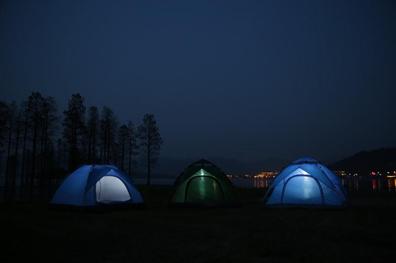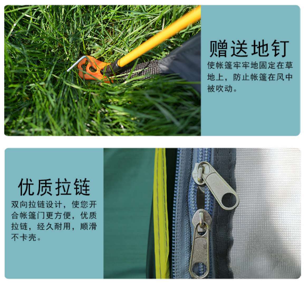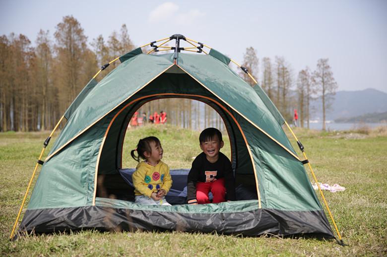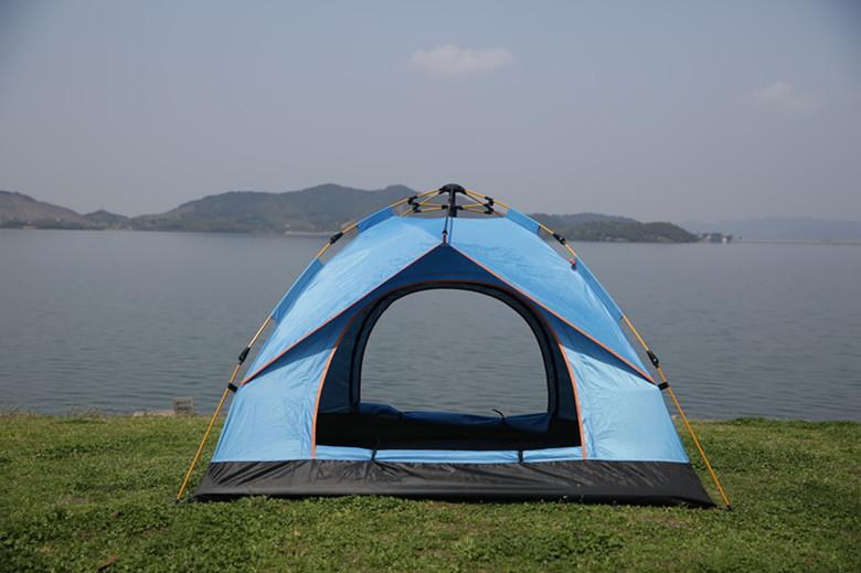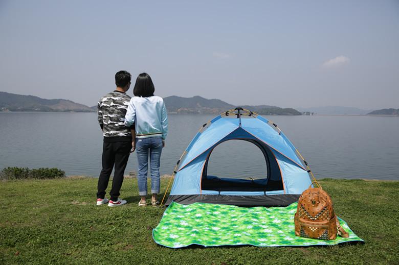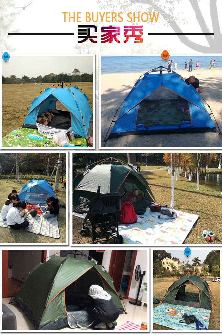 3-4 personas fuera de la tienda de campaña automática de apertura rápida con ventilación y protección solar para clientes de ruta. Se puede pedir una tienda de campaña de una sola capa con LOGO.