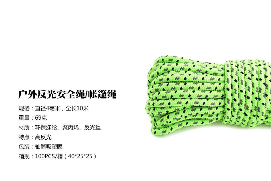 Cuerda de tienda de alta calidad y alta reflectividad, enrollada por equipos importados, de calidad excelente, con un diámetro de 4 mm. La cuerda está tejida bastante redonda y apretada, con una textura superficial muy fina, buena resistencia al desgaste y sin pelusa después de la fricción frecuente, lo que la convierte en un gran producto para jugadores de exteriores.