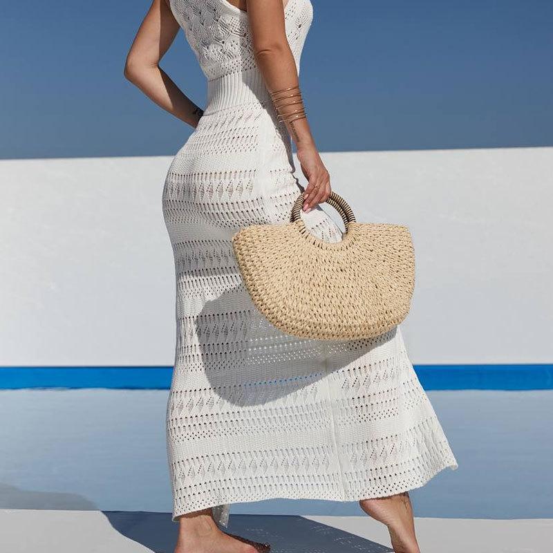 Yangyang Europeo y Americano Transfronterizo Cubreplayas Amazon Sexy Largo Tejido Calado Tirantes Espagueti Espalda Descubierta Vacaciones Vestido Protector Solar