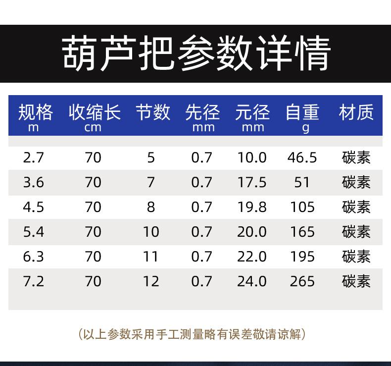 2.7 meters color random, 3.6 m, 4.5 m, 5.4 m, 6.3 m, 7.2 m, Fishing Gift Pack, The first three sections of the fishing rod