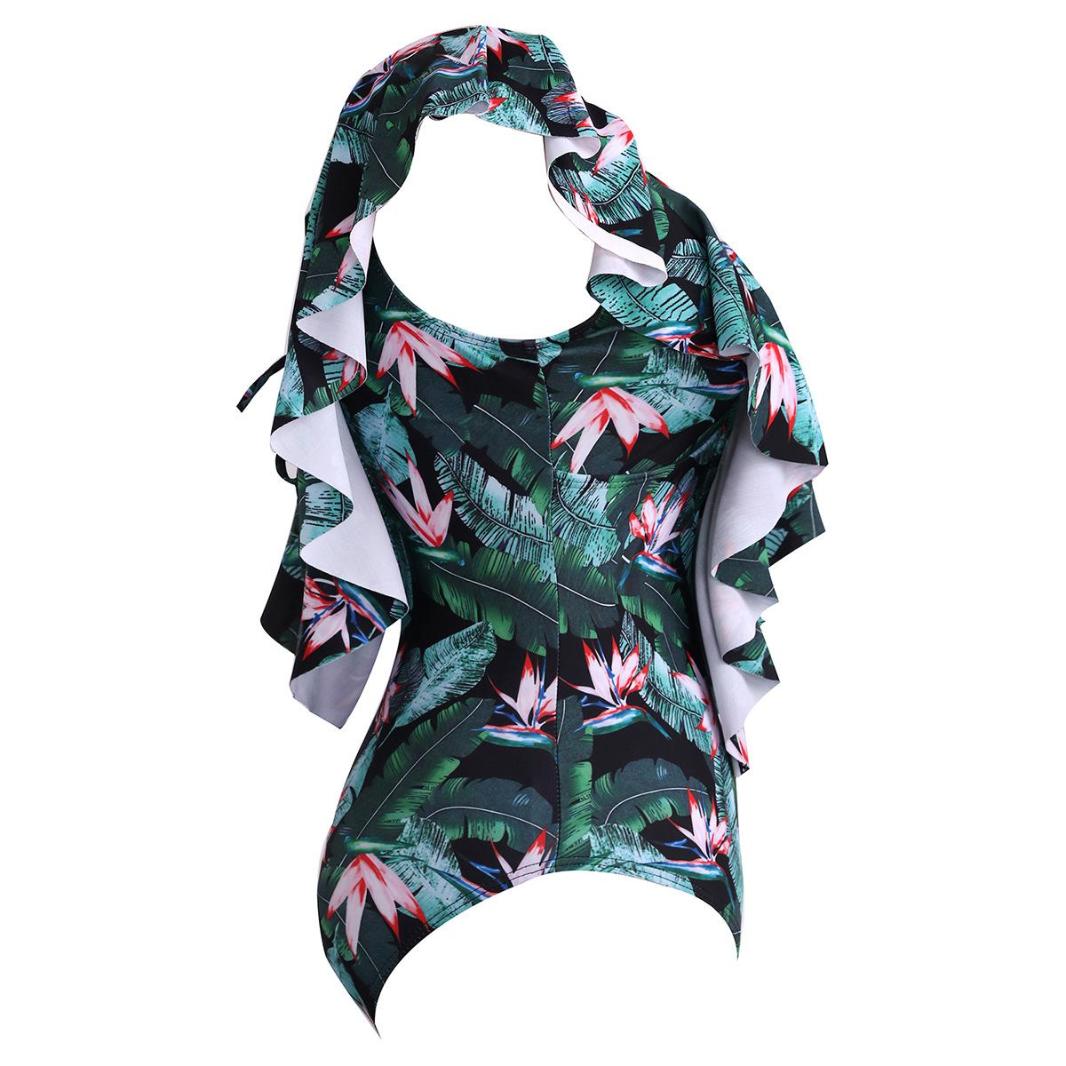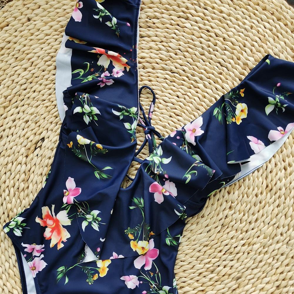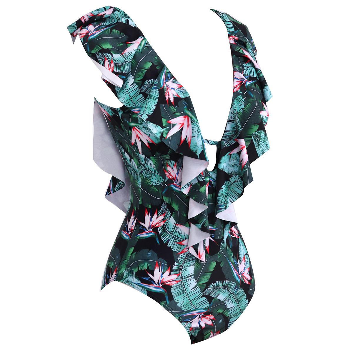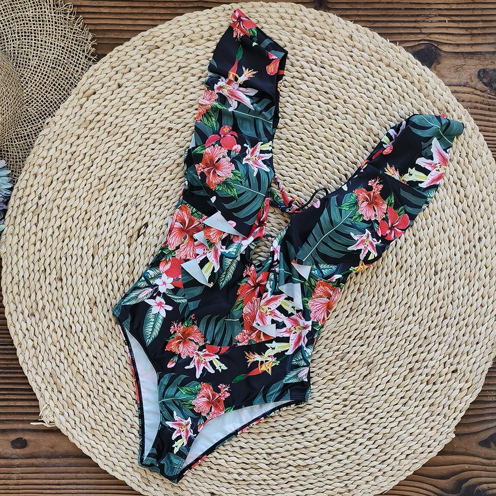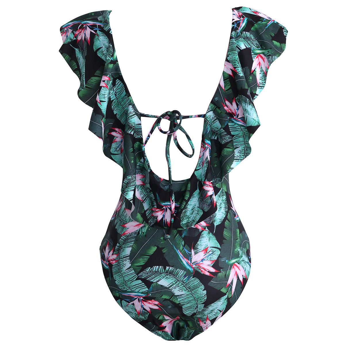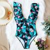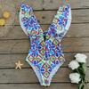 Traje de baño de cuerpo entero con estampado floral europeo y americano con volantes para mujer 2025 Nuevo Comercio Exterior Transfronterizo Sin Espalda Amazon