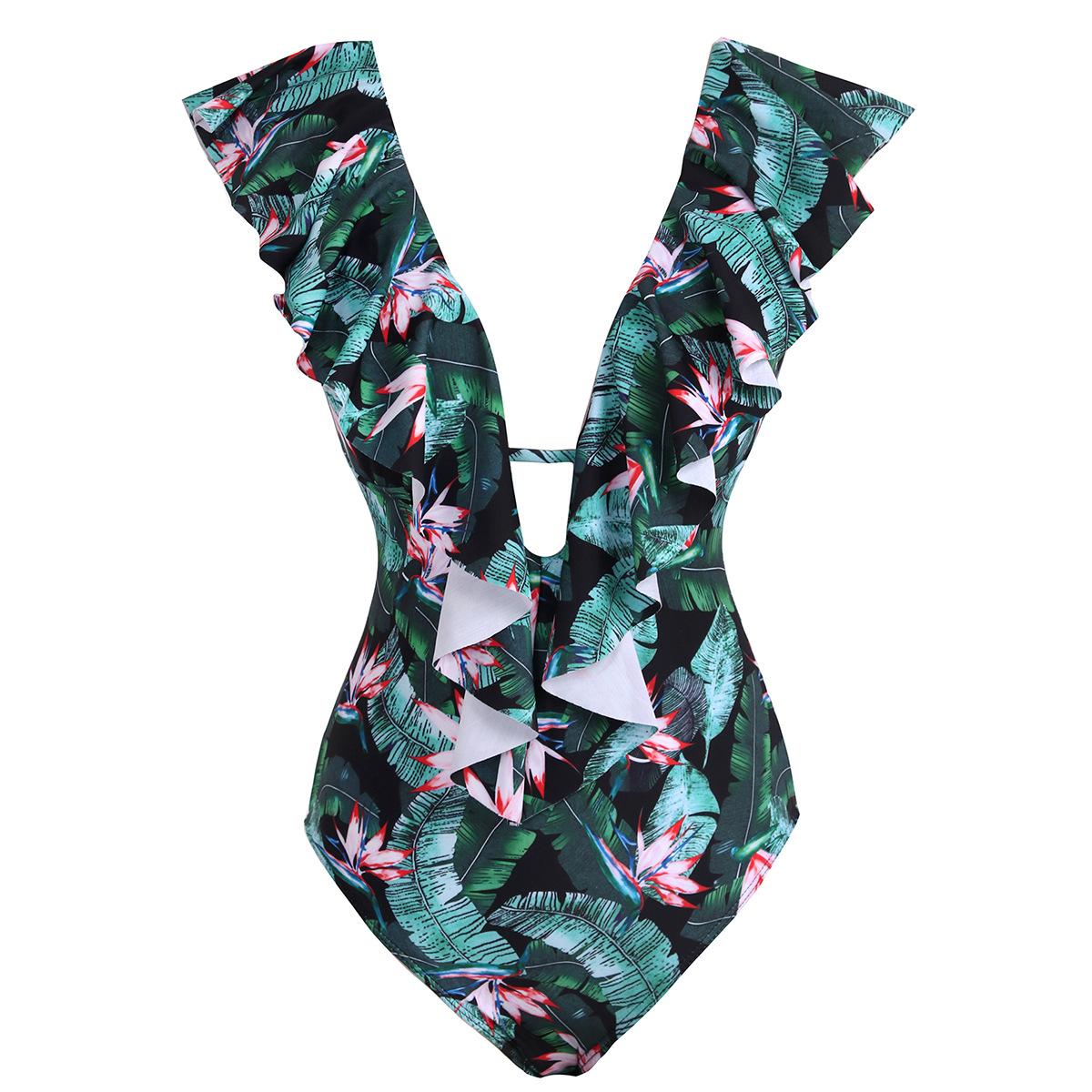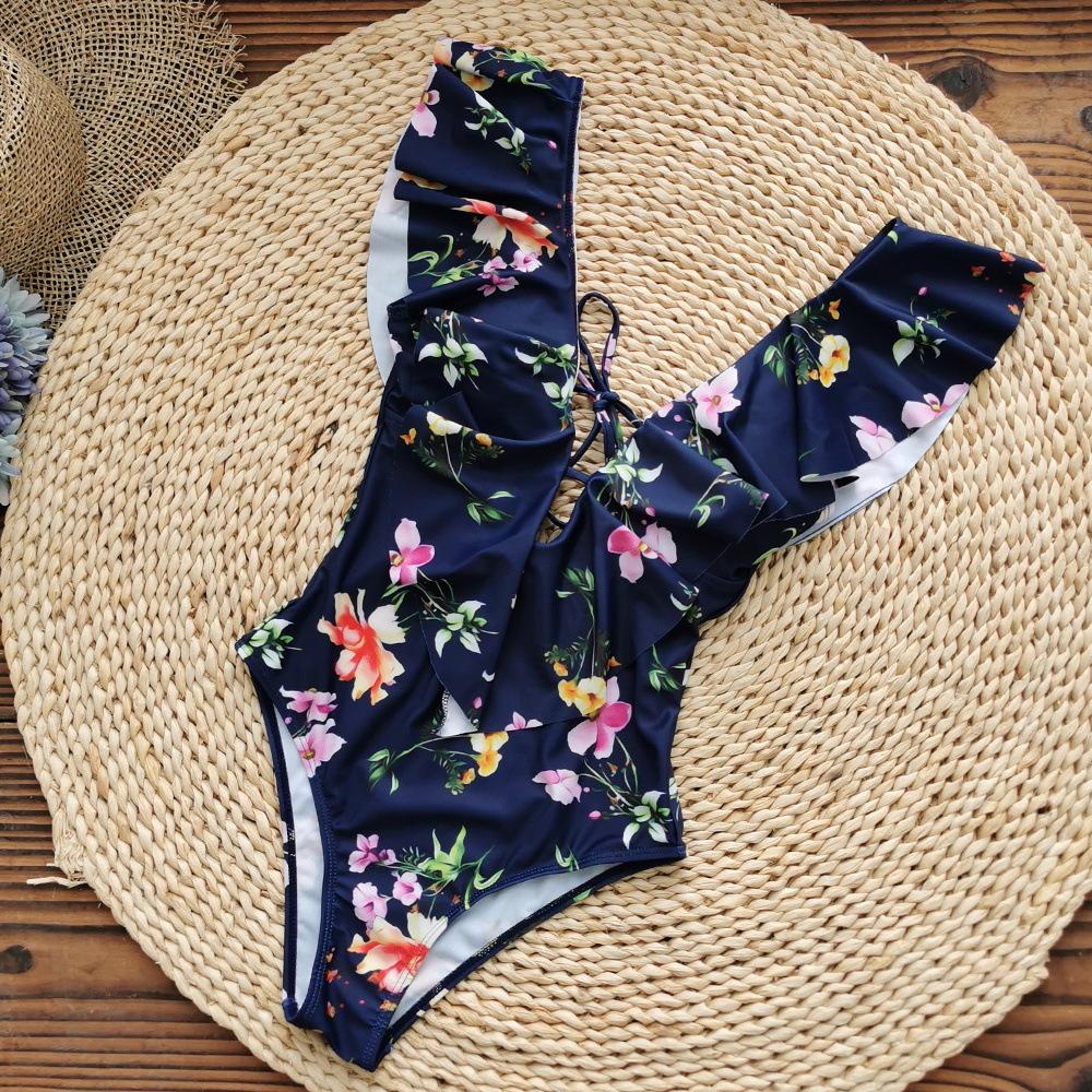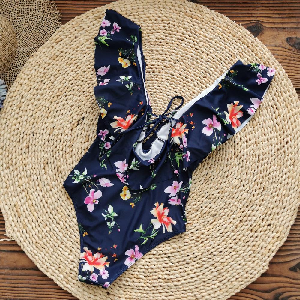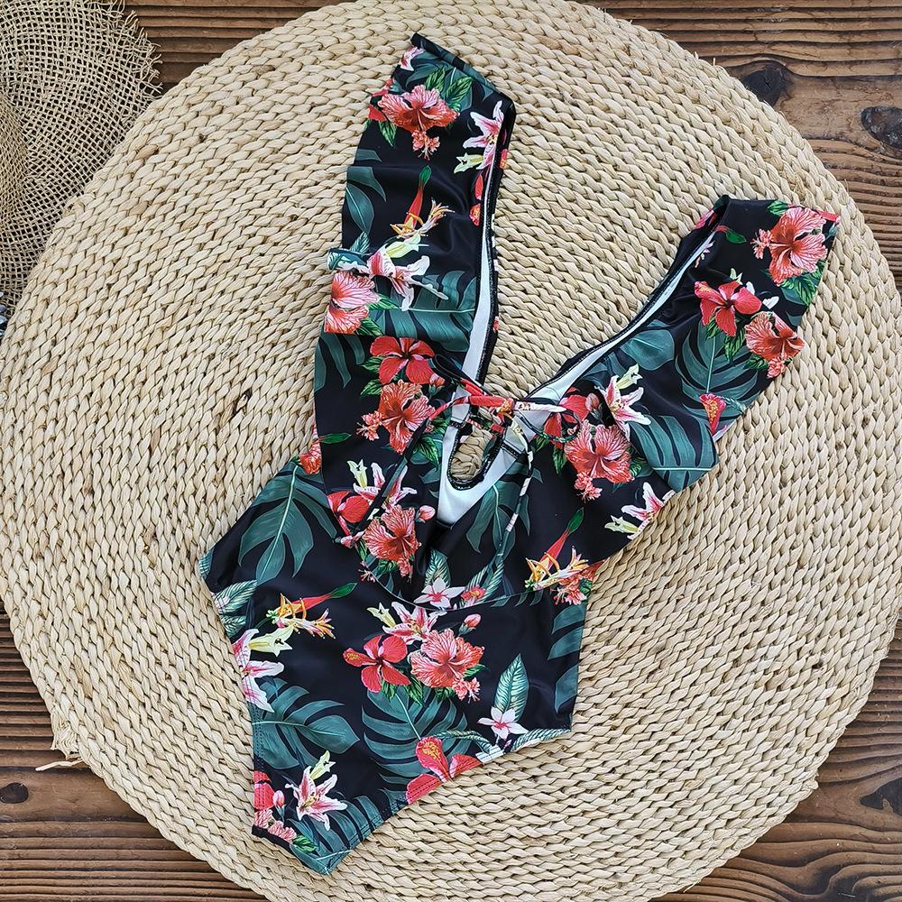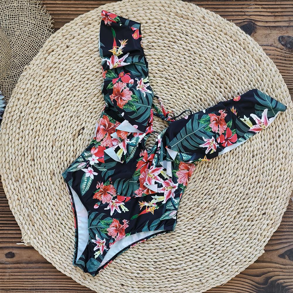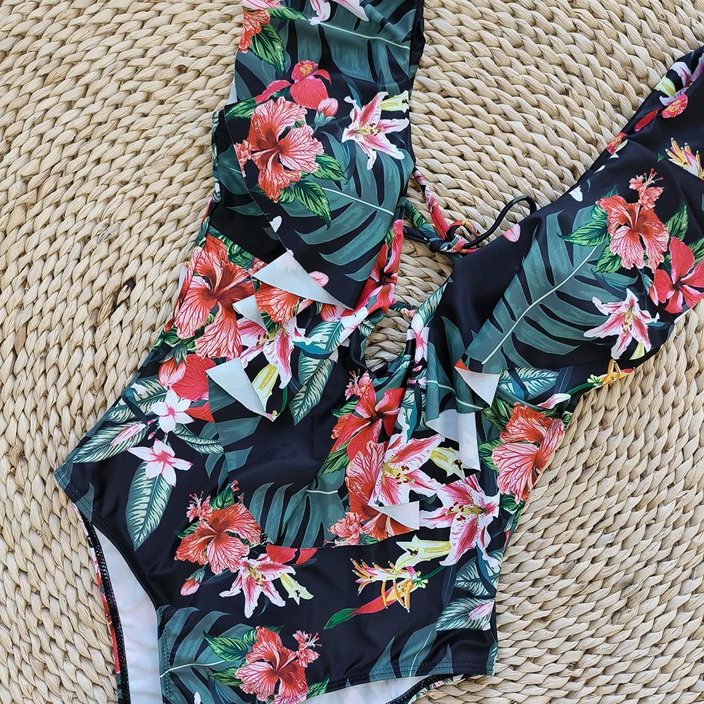 Traje de baño de cuerpo entero con estampado floral europeo y americano con volantes para mujer 2025 Nuevo Comercio Exterior Transfronterizo Sin Espalda Amazon